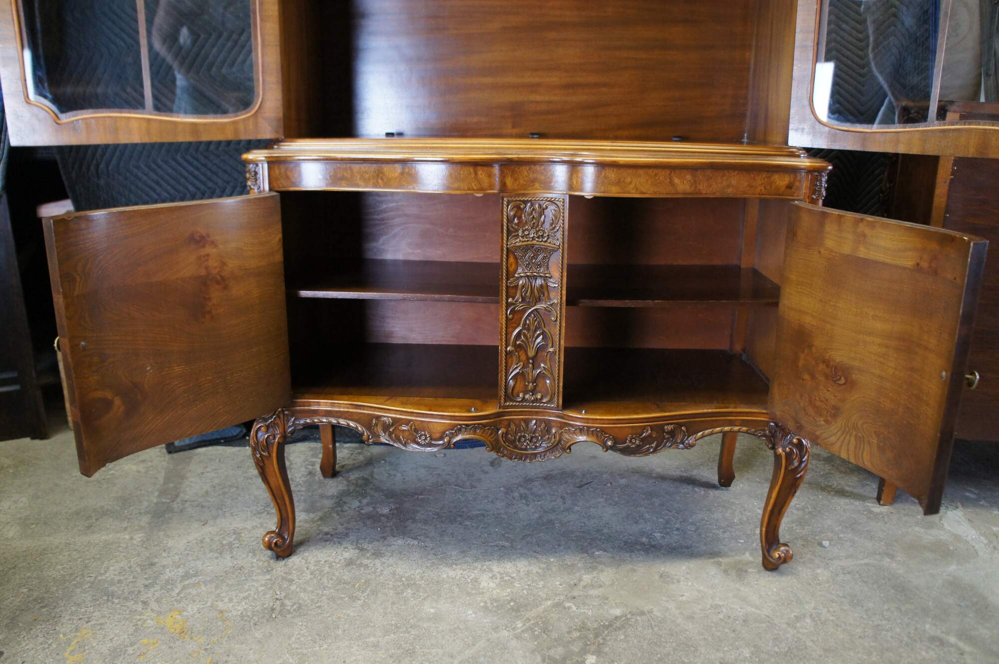 Antique Batesville Cabinet Co French Provincial Louis XV china curio cabinet / cupboard. Made of Carpathian cluster elm burl featuring upper cabinet with serpentine floral cartouch crown and fretwork doors over lower cabinet with carved acanthus design, all supported by cabriole legs. 645.