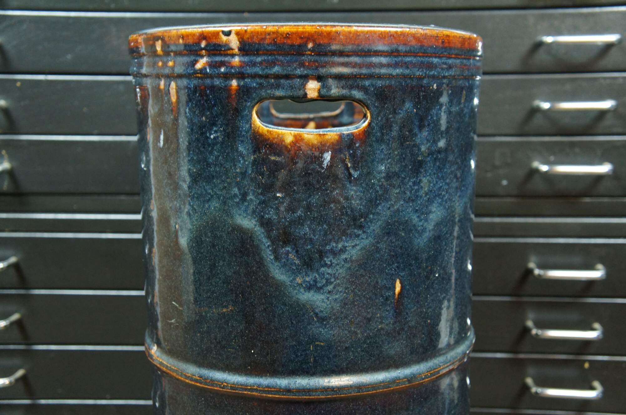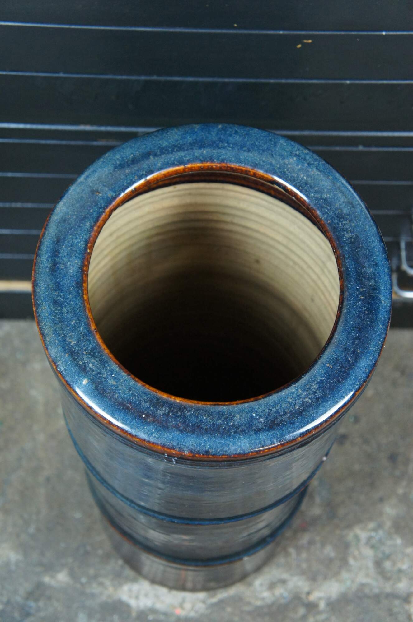 Mid century ceramic umbrella stand / floor vase, cylindrical form, molded like bamboo with cut out handles, glazed in blue and brown.