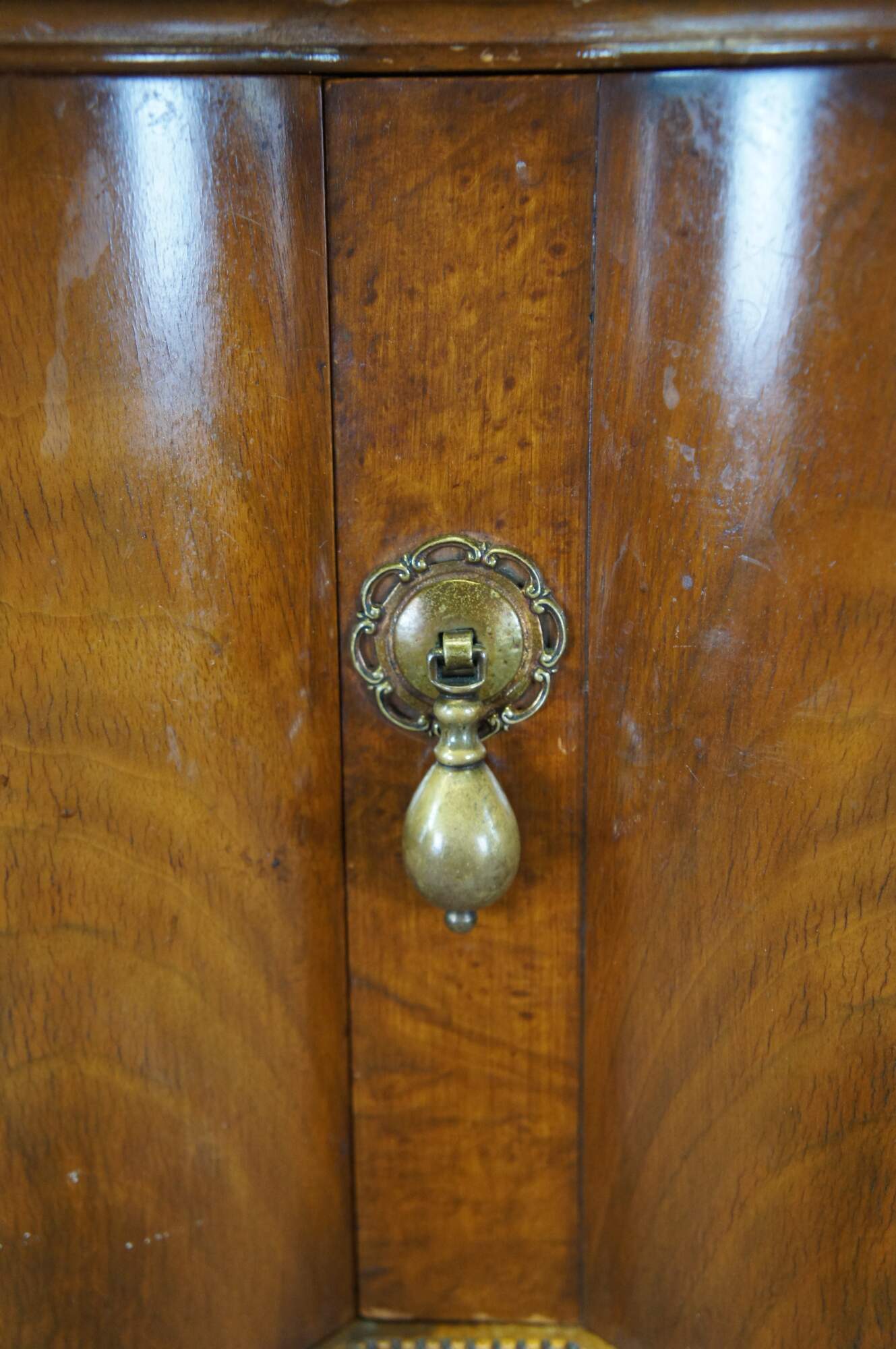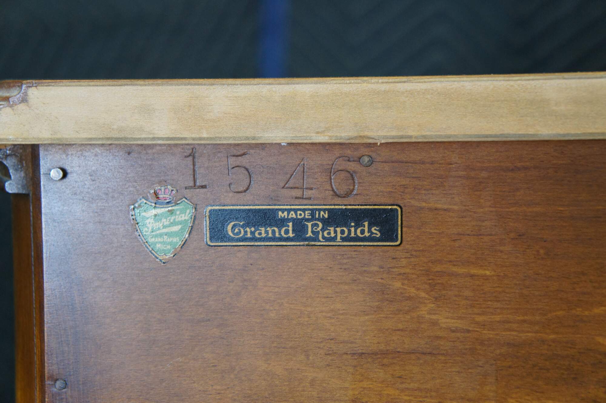 Antique Imperial Cabinet Co French Provincial Louis XV console table / server / sideboard / credenza / commode. Made of walnut featuring serpentine / demilune form with carved floral and acanthus design. Made in Grand Rapids Michigan, 15 46.