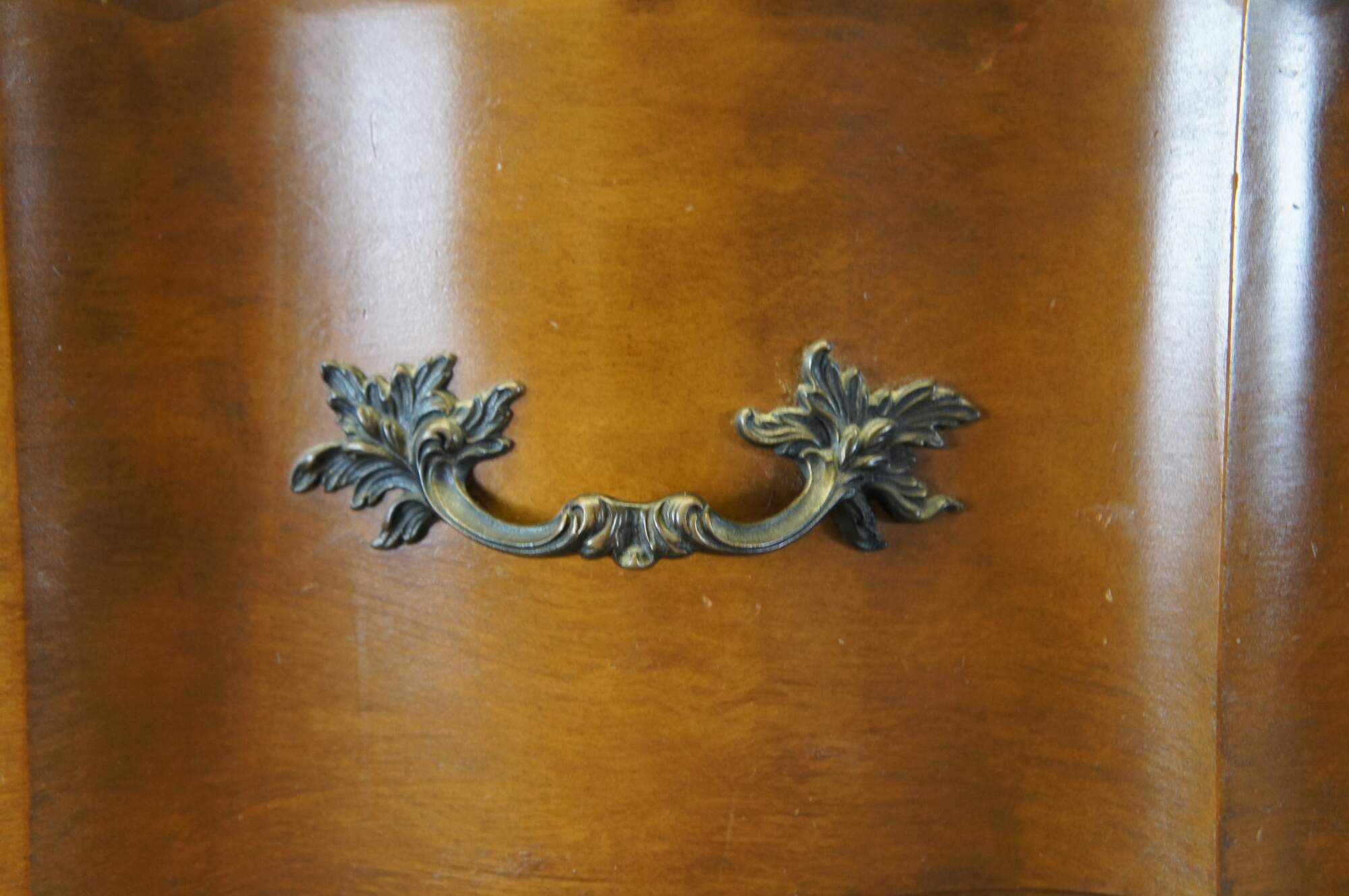 Mid Century French Provincial Burns Case Goods tallboy / highboy chest of drawers / chest on chest style dresser. Made of walnut featuring serpentine form with six drawers and brass hardware.