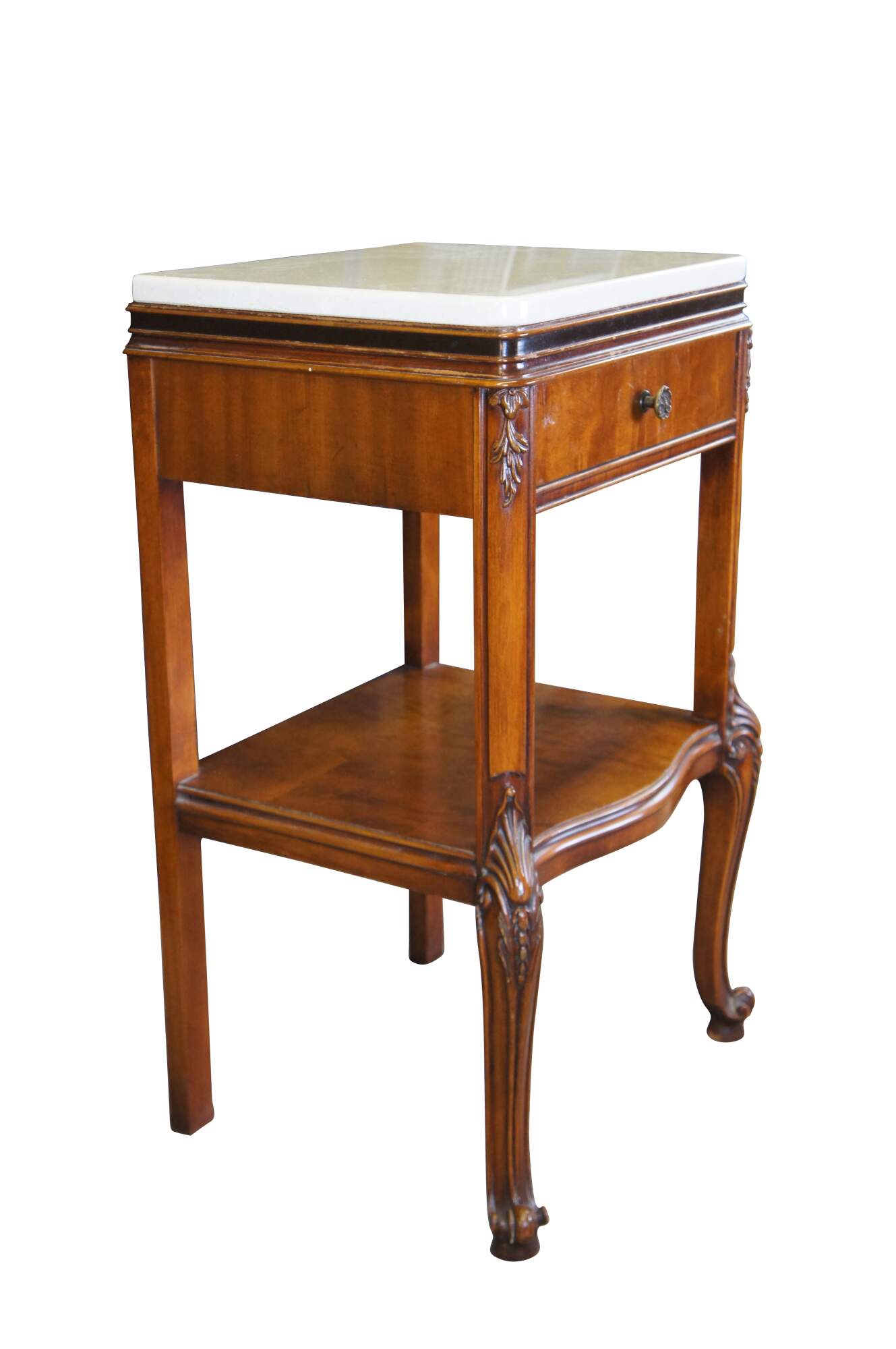 Pair of two Henredon French Provincial end tables, pedestals, nightstands. Made of walnut featuring two tier design with marble tops and cabriole legs with acanthus design. 6065 430