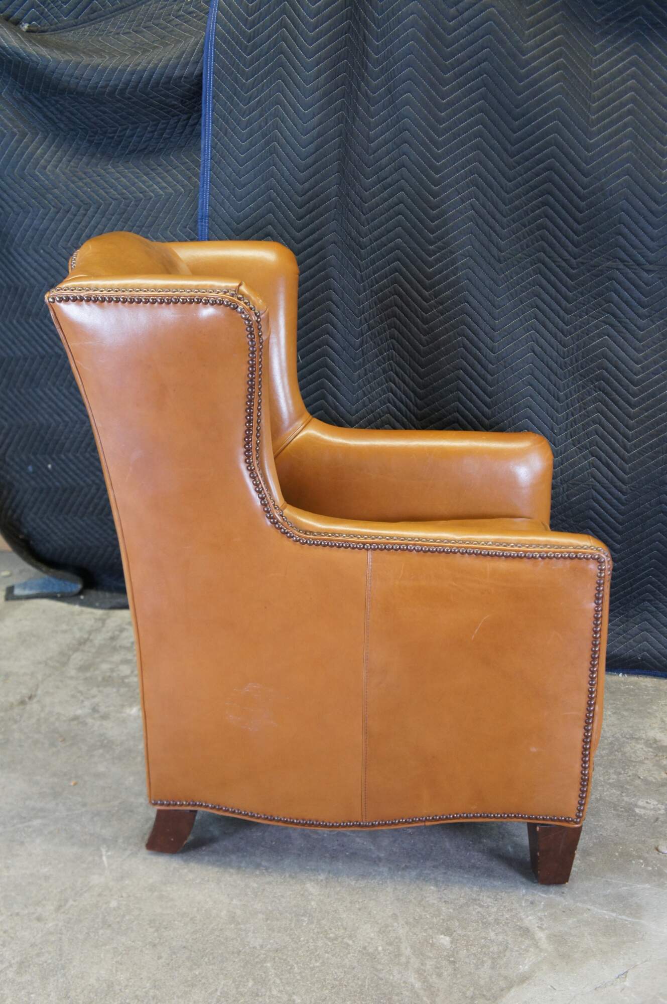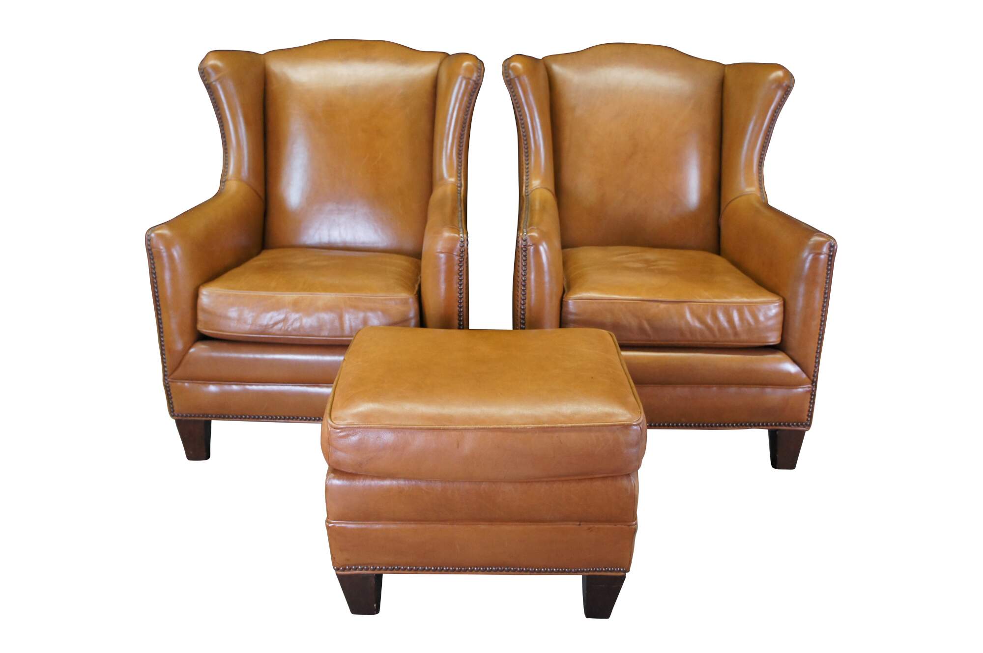 Set of two vintage Henredon club / lounge / library wingback arm chairs and ottoman featuring traditional styling with brown leather upholstery and nailhead trim.