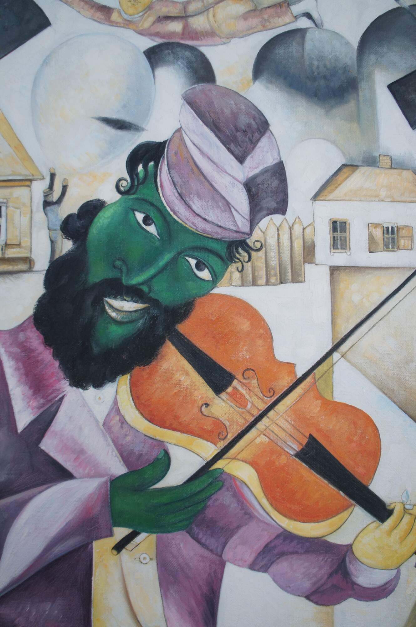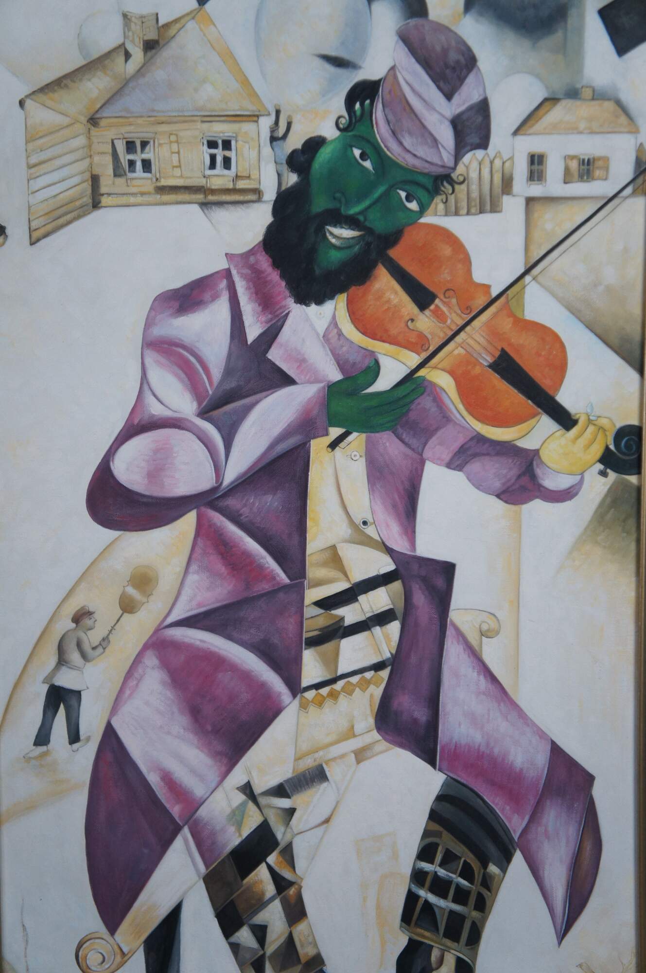 An exquiste reproduction after Marc Chagall's, Green Violinist. Aptly Titled "The Green Fiddler", circa last quarter 20th Century. The painting is about 3/4 the size of the original andexecuted with remarkable similarities. Beautifully colored and detailed. The canvas is unsigned.