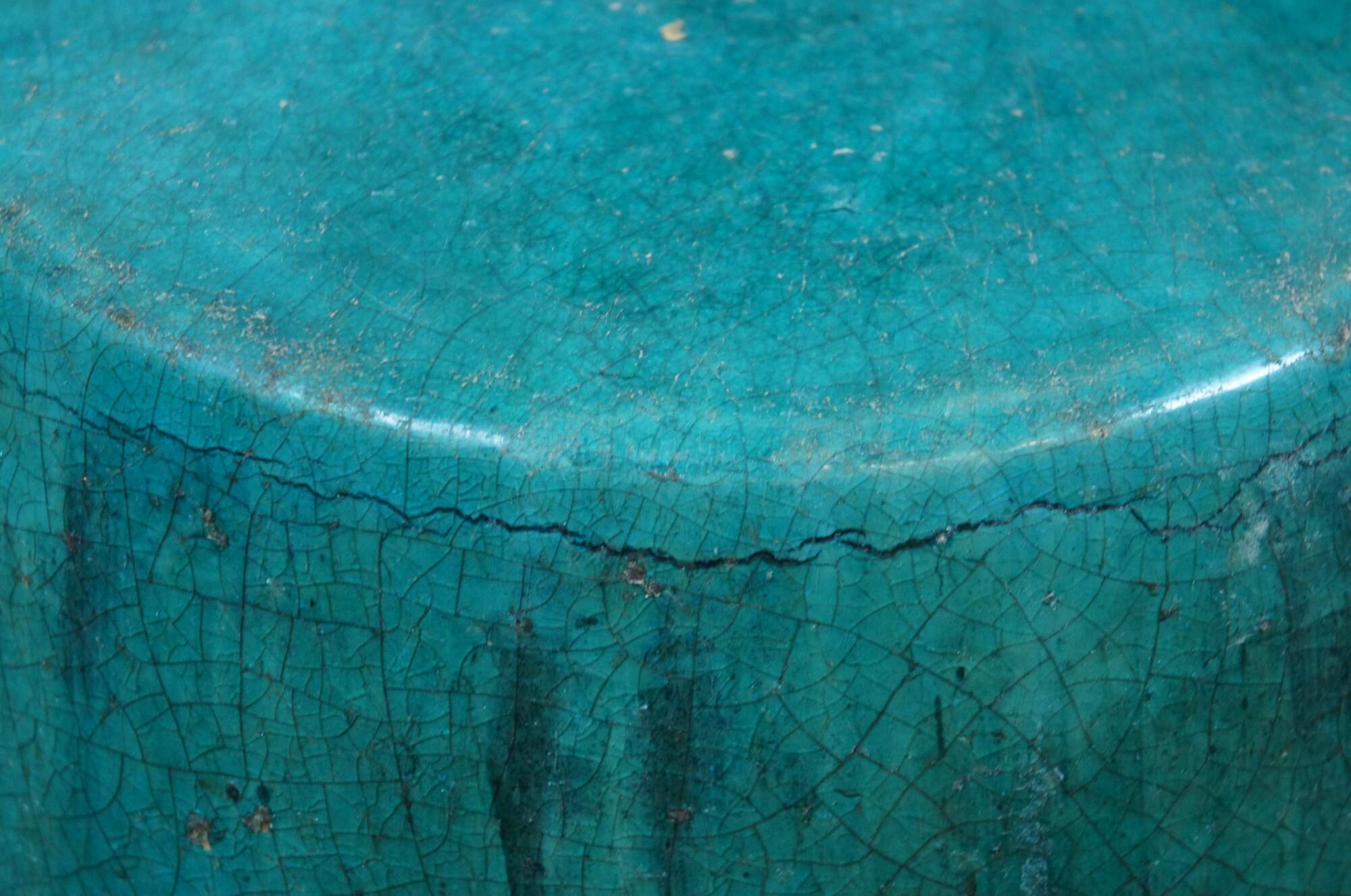Antique Chinese ceramic garden stool / planter / pedestal / side table - traditional barrel shaped design with cut out medallions on two sides, decorated with a simple carved motif of flowers and reeds, finished with a deep green / teal / turquoise glaze.