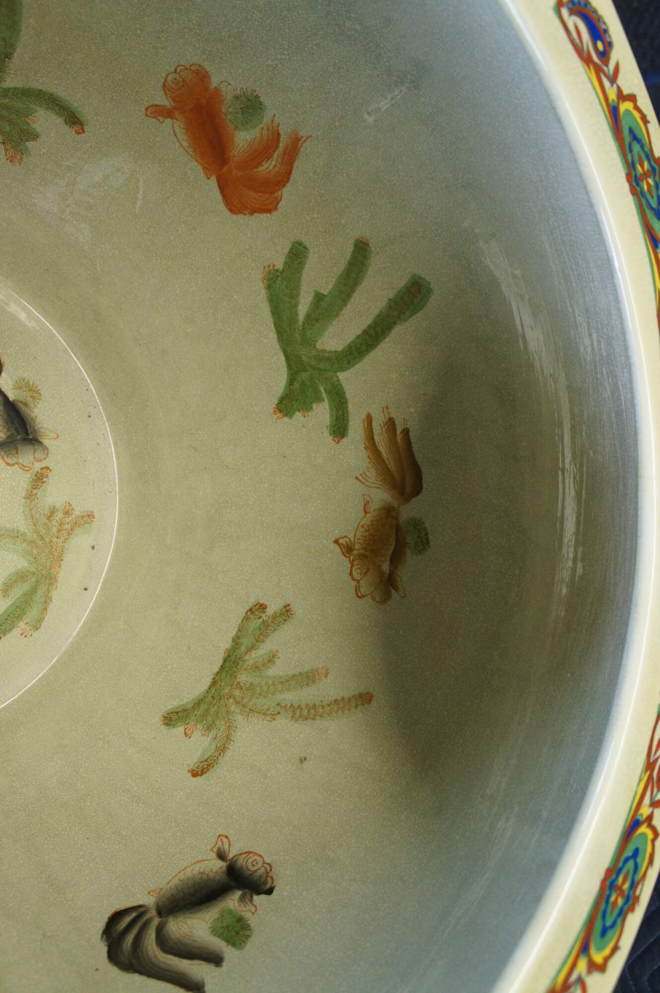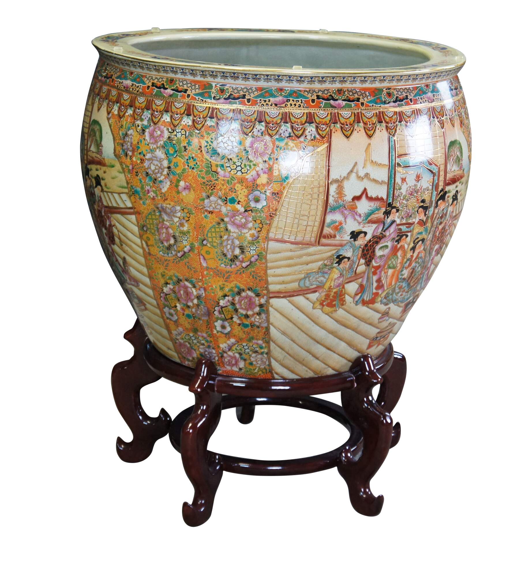 A very large vintage Chinese Oriental Satsume style planter / fishbowl / fish pot / jardiniere / cachepot on stand. Features a floral and fish theme with Geisha scenes, gardens and goldfish.