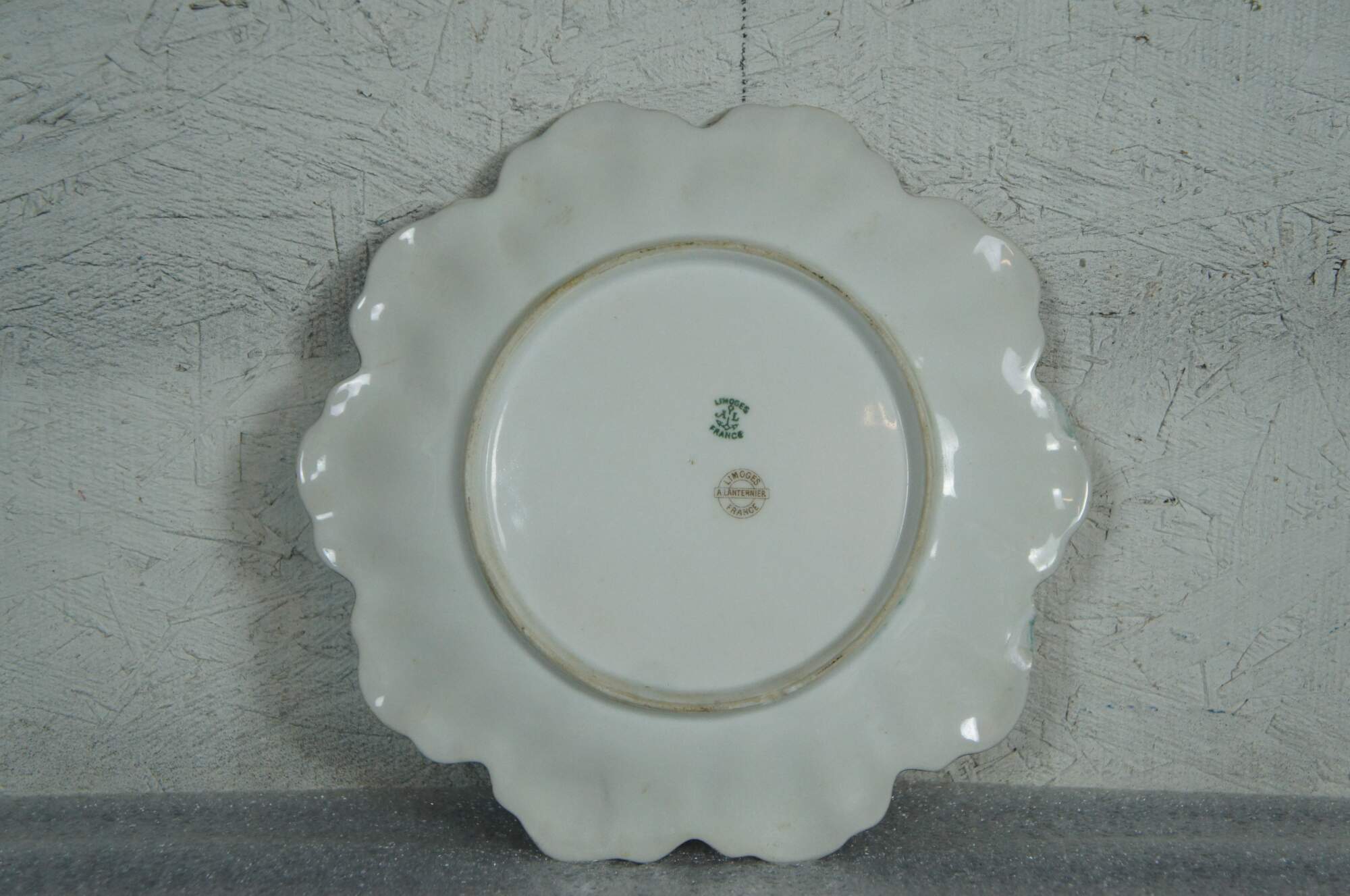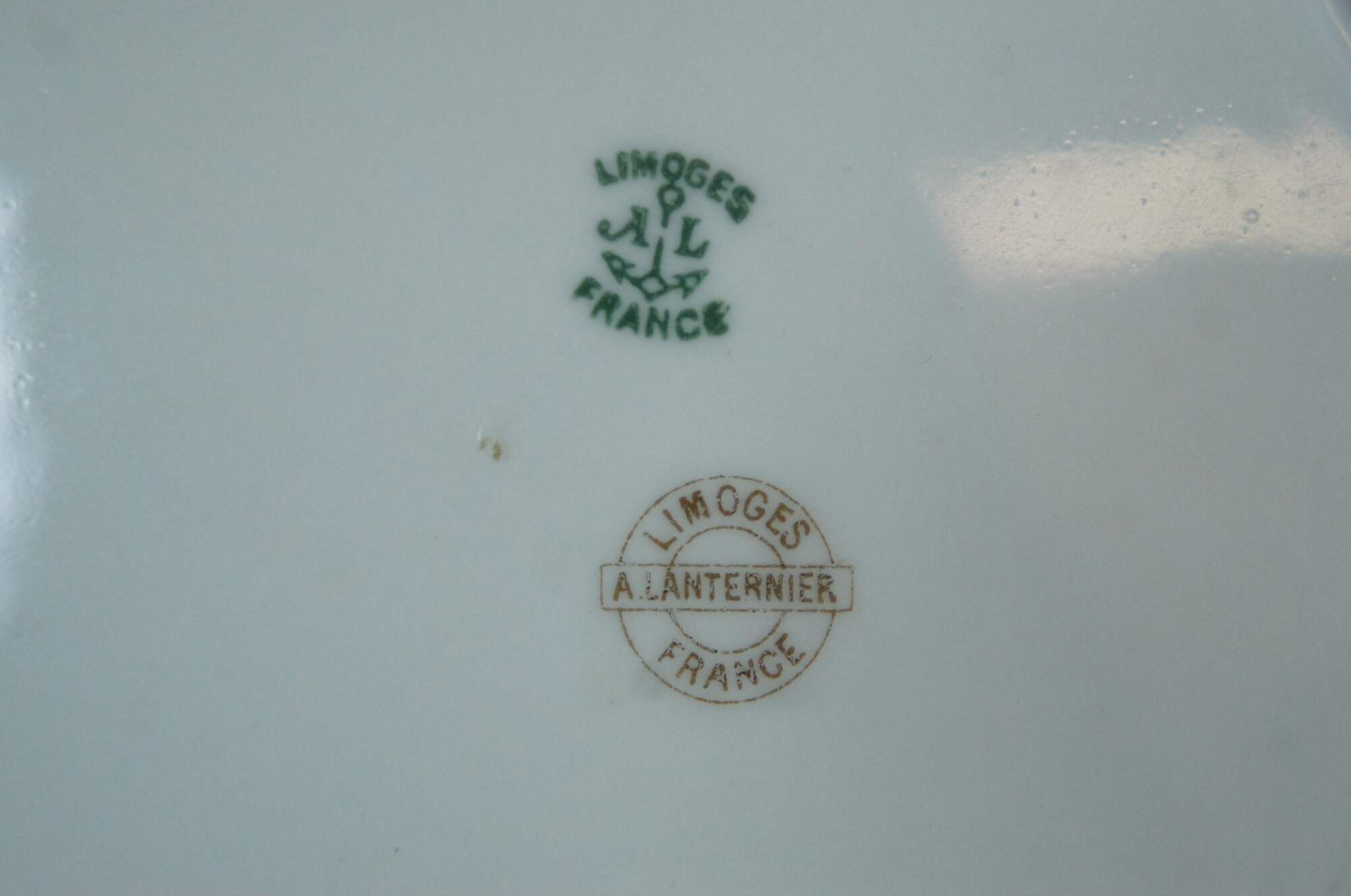 "François Frédéric Lanternier established a luxury porcelain workshop in 1857. Partnering with Breuil he took over the Chabrol factory and started producing porcelain, which was artistically hand decorated in his studio. The company carried on an extensive exporting business with table china being the primary product line. In 1890 the company was joined by Frederic's son, Alfred Lanternier. Alfred gained experience working in England as a Wedgewood representative. The company changed name to A. Lanternier & Co. They bought another porcelain factory in Limoges. During WWI the factory also produced porcelain doll heads. After the war, from 1918 onwards, A. Lanternier & Co. continued production of luxury porcelain table wares (tea, coffee and dinner sets). In 1925 they received the Grand Prix at the International Exhibition of Modern Decorative and Industrial Arts (Exposition internationale des arts décoratifs et industriels modernes). They also produced porcelain for two design studios: Pomone ( Le Bon Marché department store) and La Mestrado, the design studio of the famous Galeries Lafayette in Paris. They also participated in the 1931 Paris Colonial Exhibition. In the late 1960s they merged with Gerard Dufraisseix & Abbot GDA Limoges." (Source: The Olde Stuff / Art Deco Limoges Porcelain)