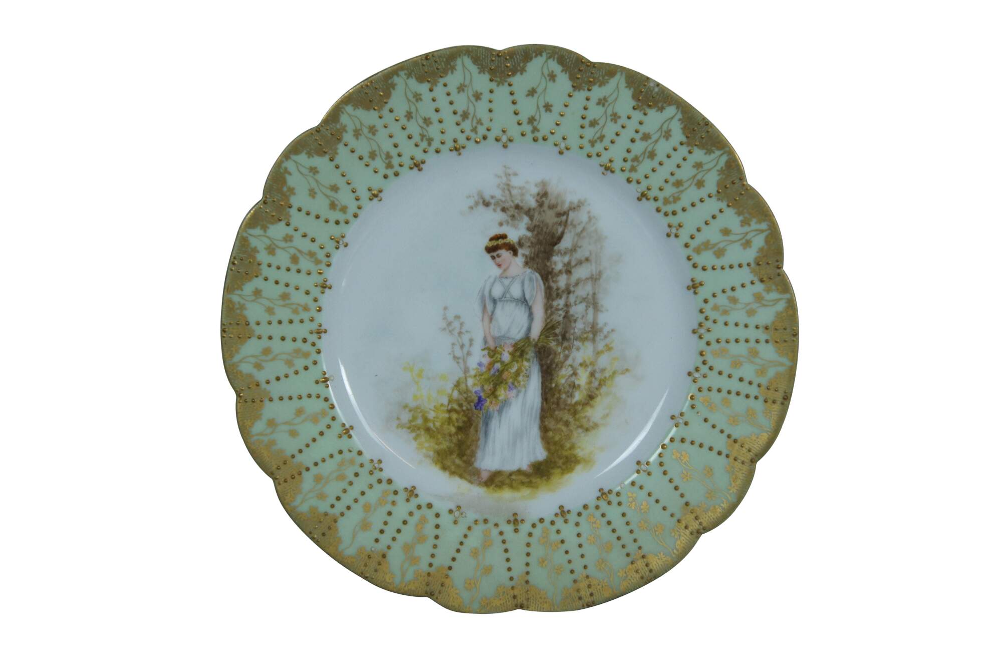 Set of three circa 1876-1889 Haviland & Co Limoges porcelain plates featuring Royal Vienna baroque styling, gold encrusted swag floral / beaded borders of pastel green, pink, and purple, framing central motifs of women in Neoclassical gowns - carrying a bouquet in the forest, smelling flowers, and playing with birds and a hoop.