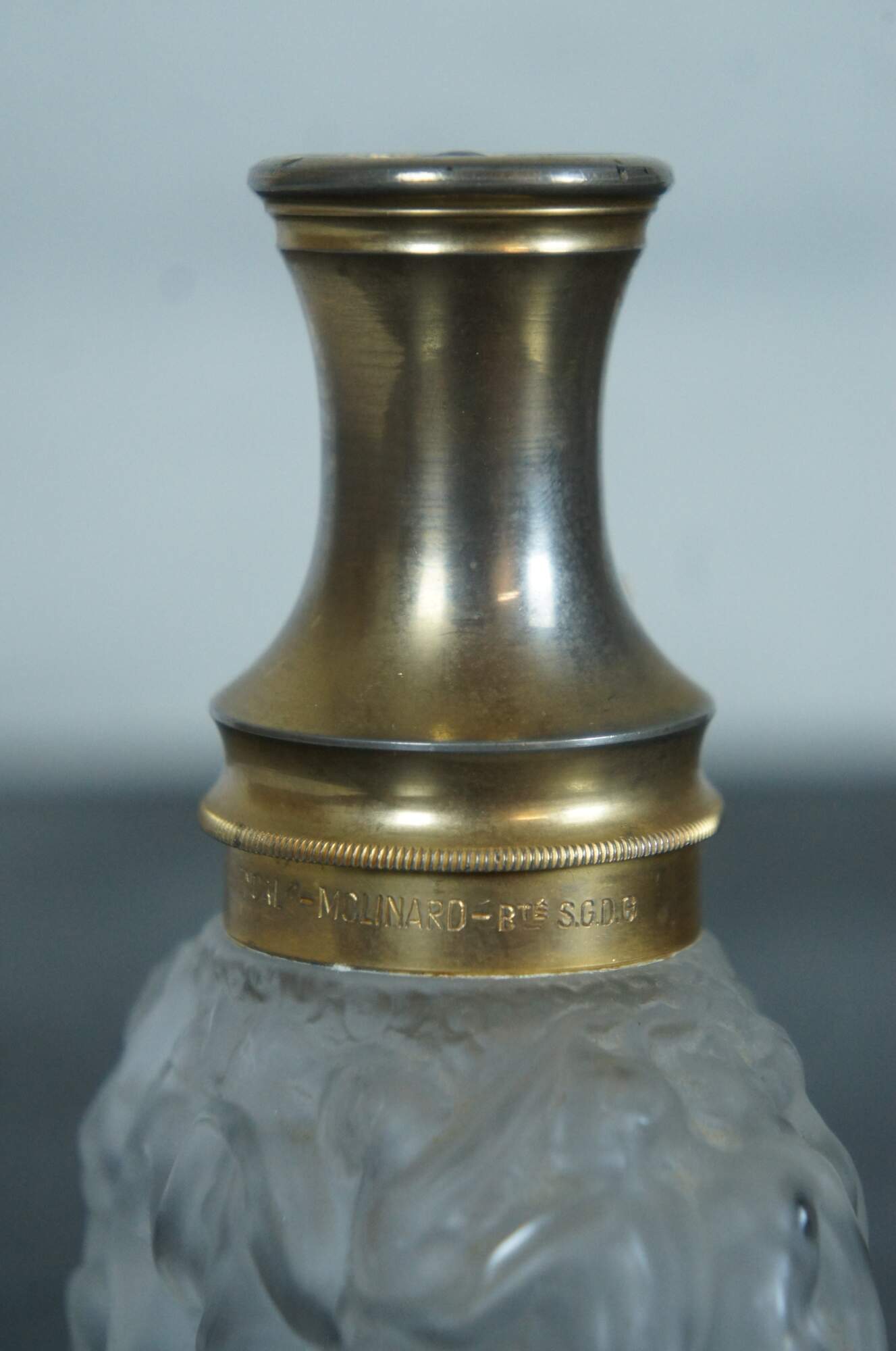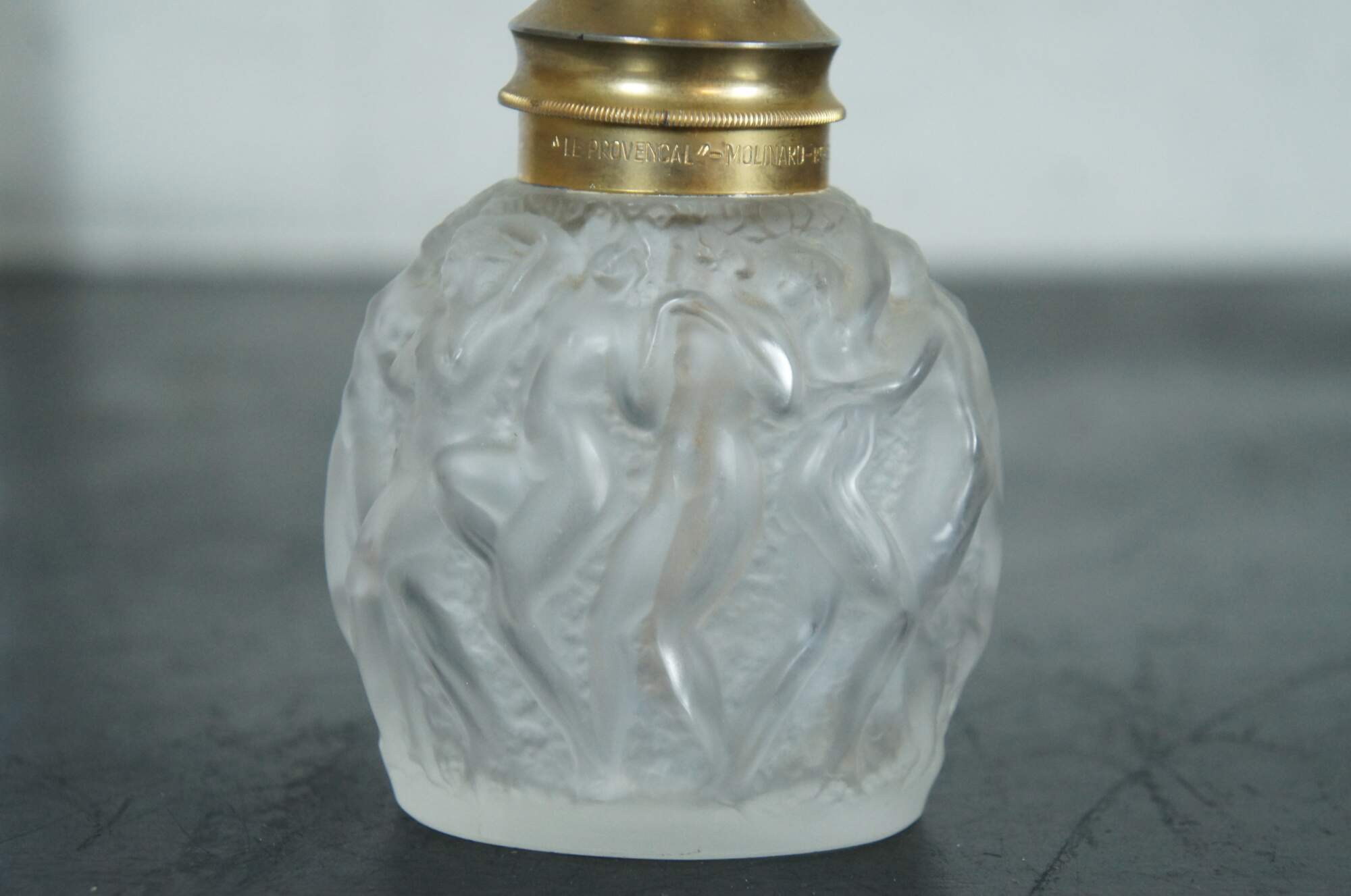 Late 20th century Lalique for Molinard "Le Provencal" frosted crystal perfume bottle with brass top / atomizer. Oval base is decorated with a flurry of nude figures having a bacchanal. Signed on base.