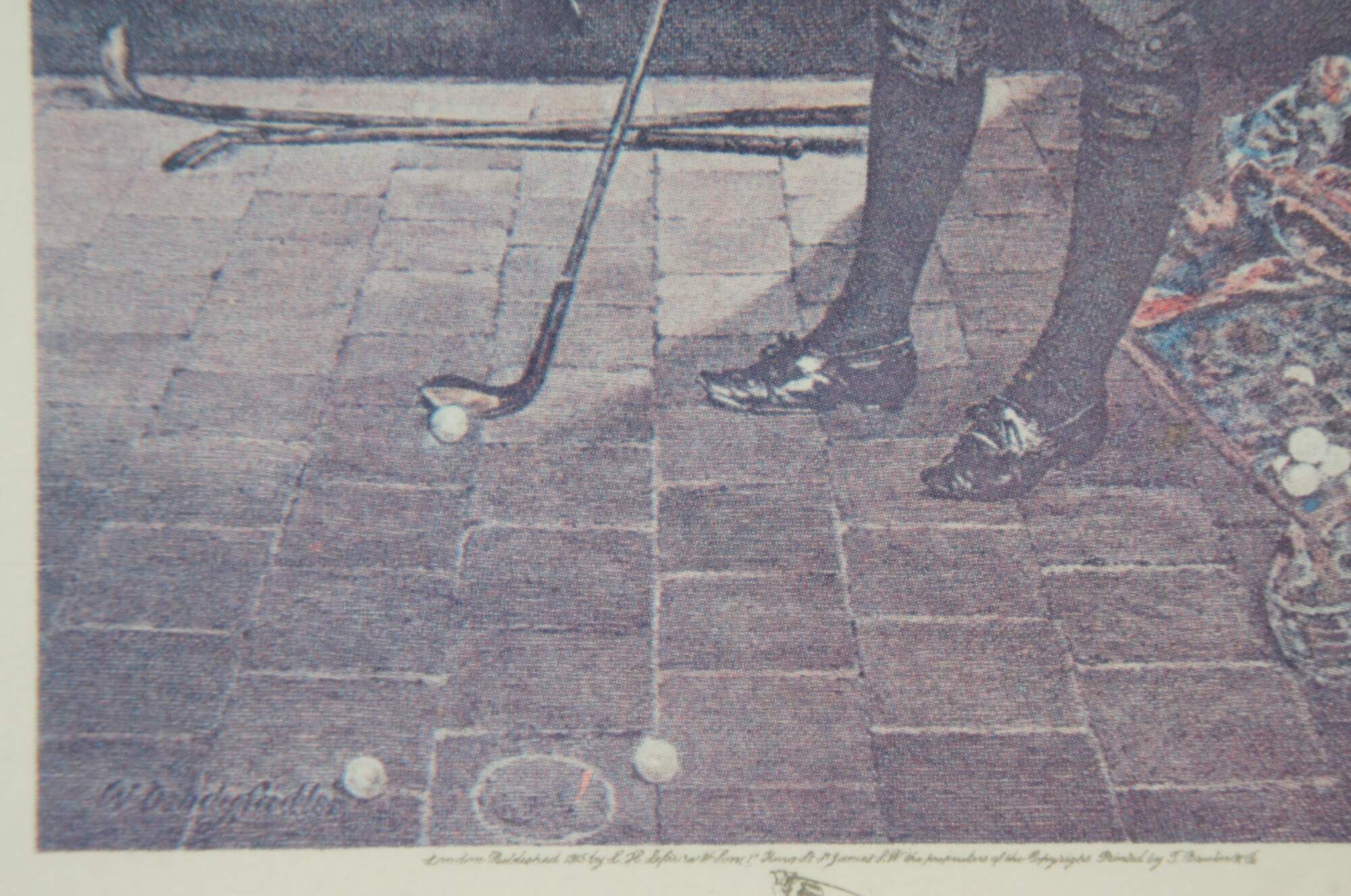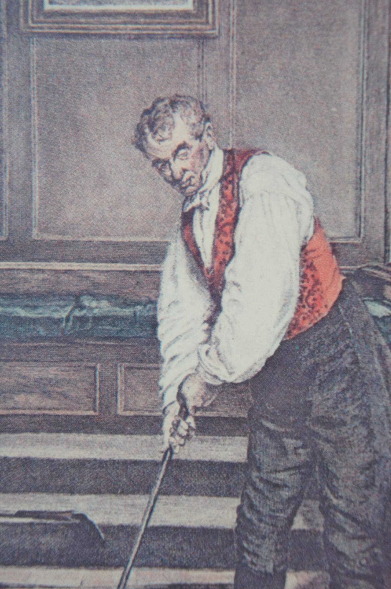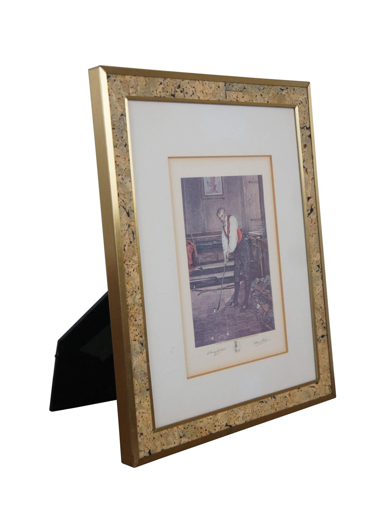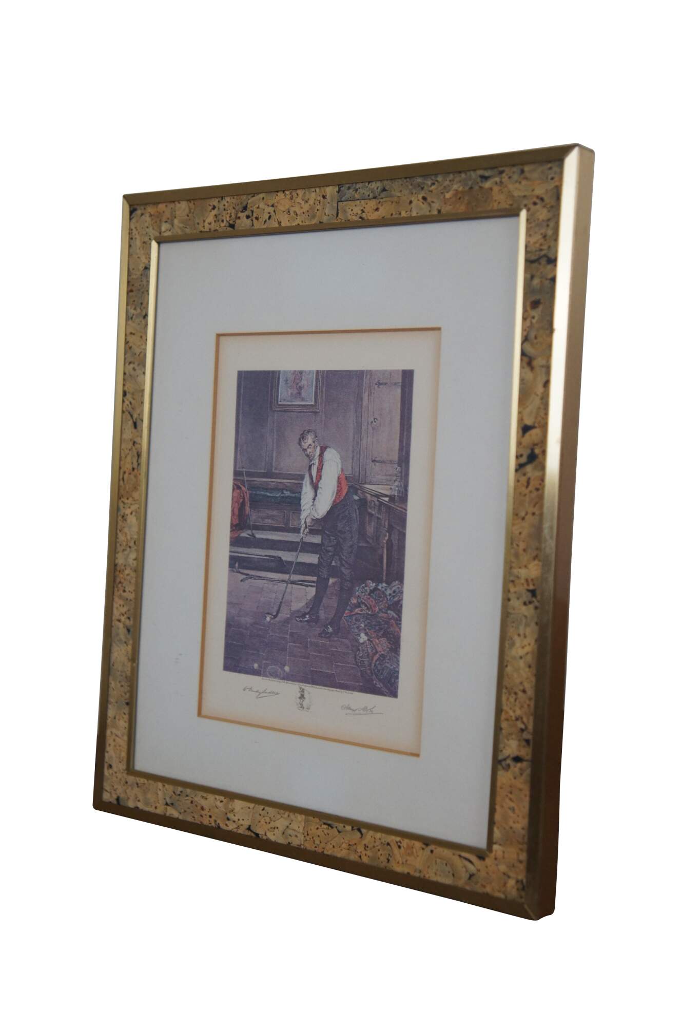 Circa mid 20th century small colored reproduction lithograph print of "A Little Practice" by Walter Dendy Sadler, engraved by James Dobie, originally published 1915, showing a Victorian gentleman in shirt sleeves, practicing his putting on a flagstone floor. Brass and cork easel style frame; white mat.