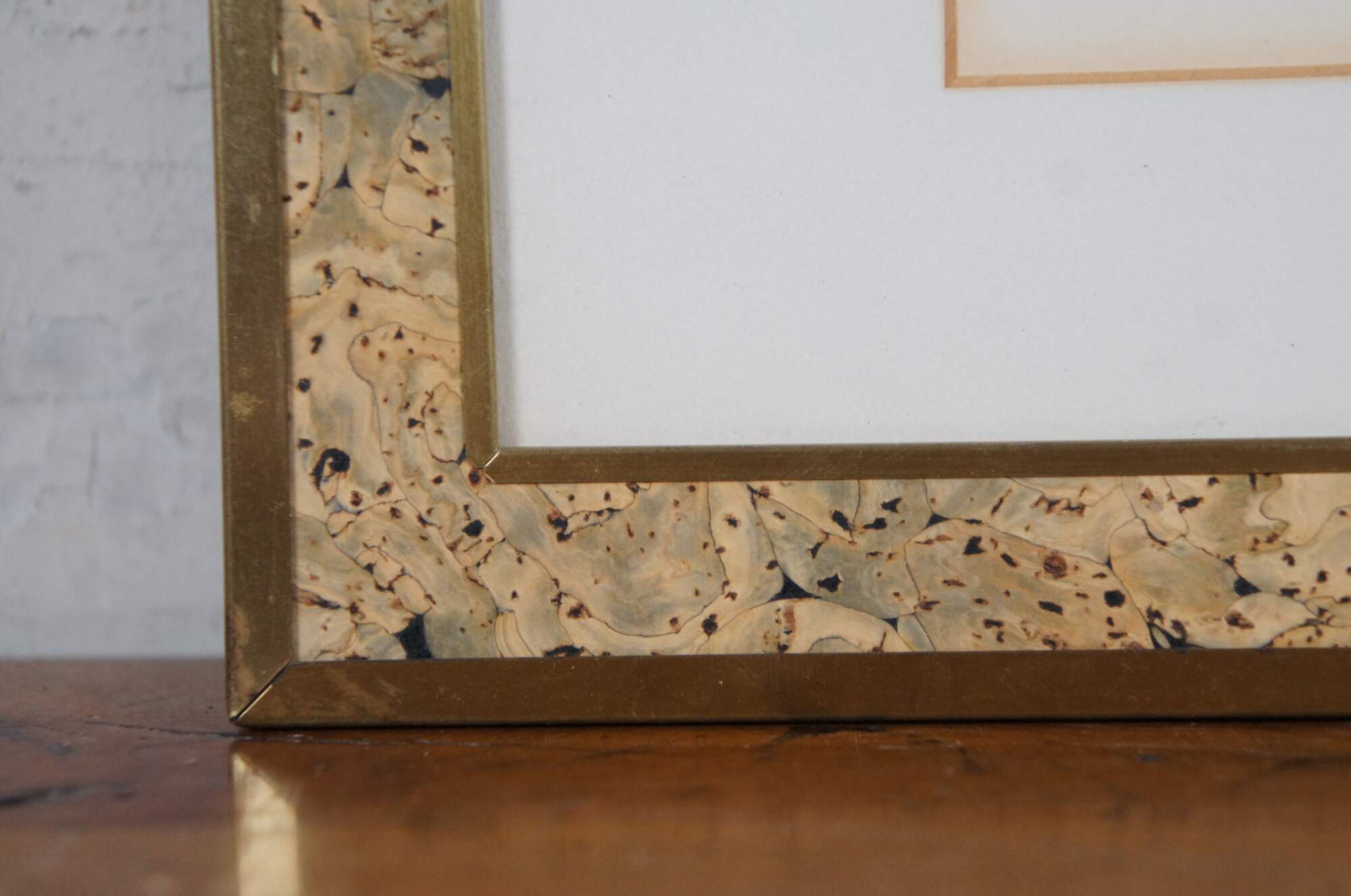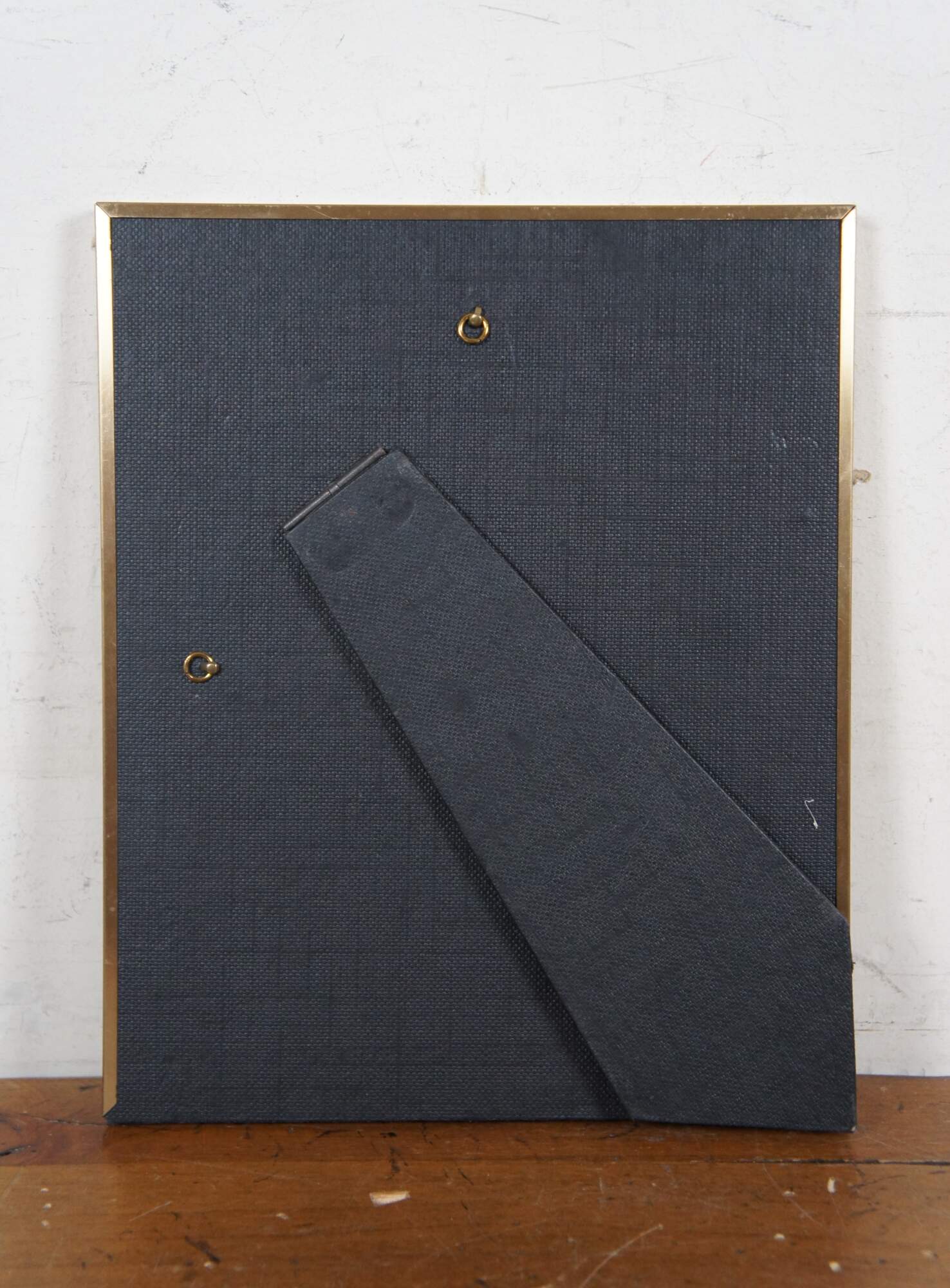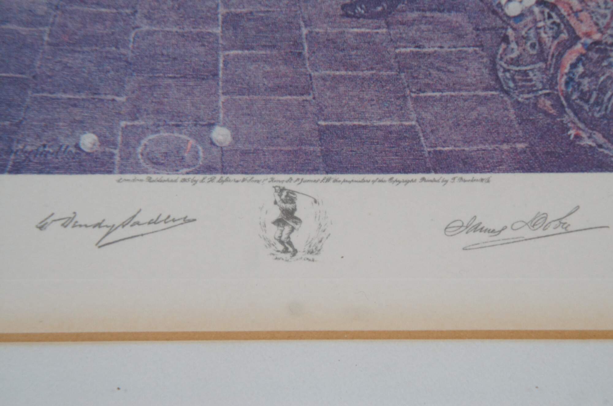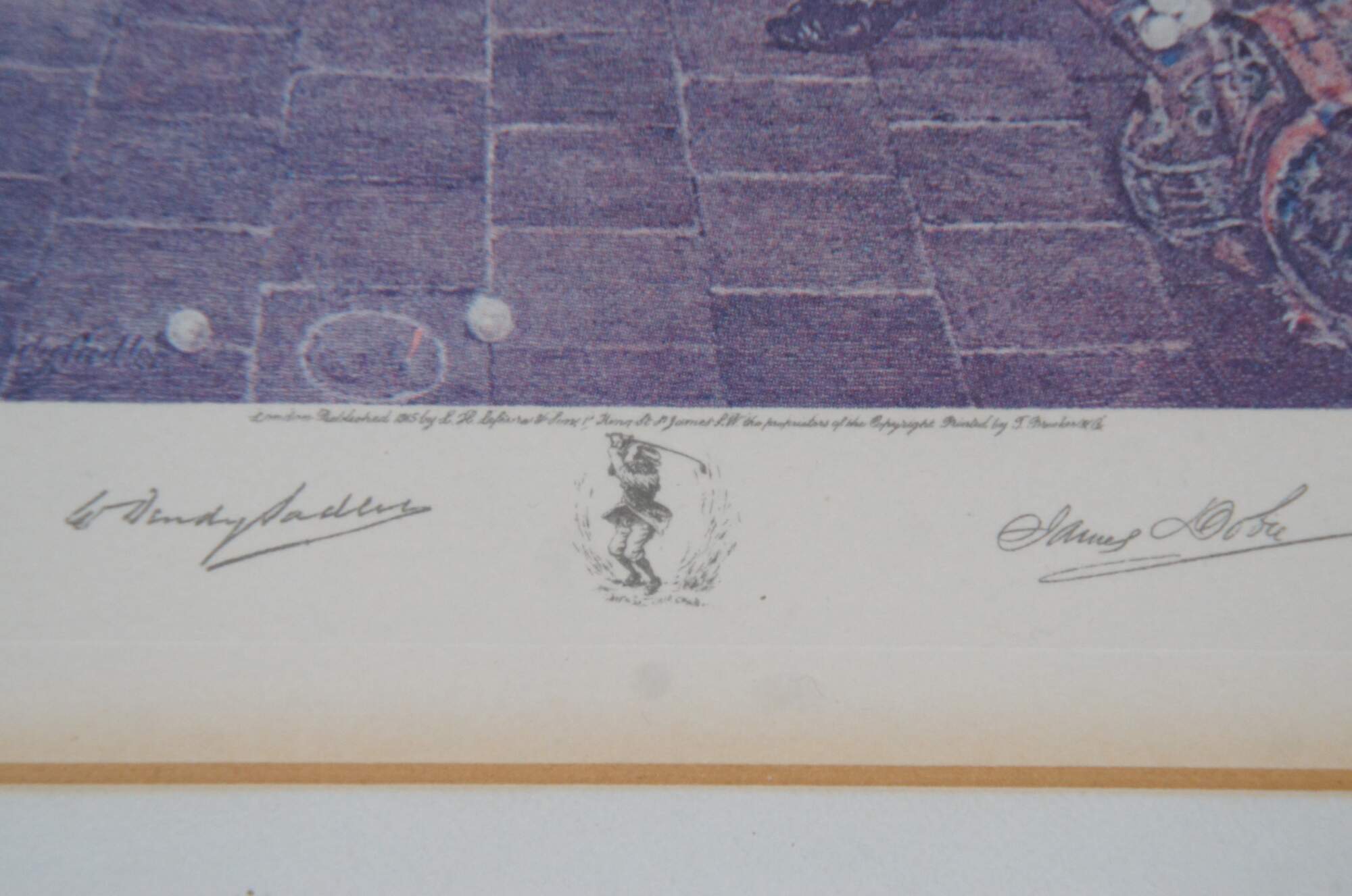 Circa mid 20th century small colored reproduction lithograph print of "A Little Practice" by Walter Dendy Sadler, engraved by James Dobie, originally published 1915, showing a Victorian gentleman in shirt sleeves, practicing his putting on a flagstone floor. Brass and cork easel style frame; white mat.