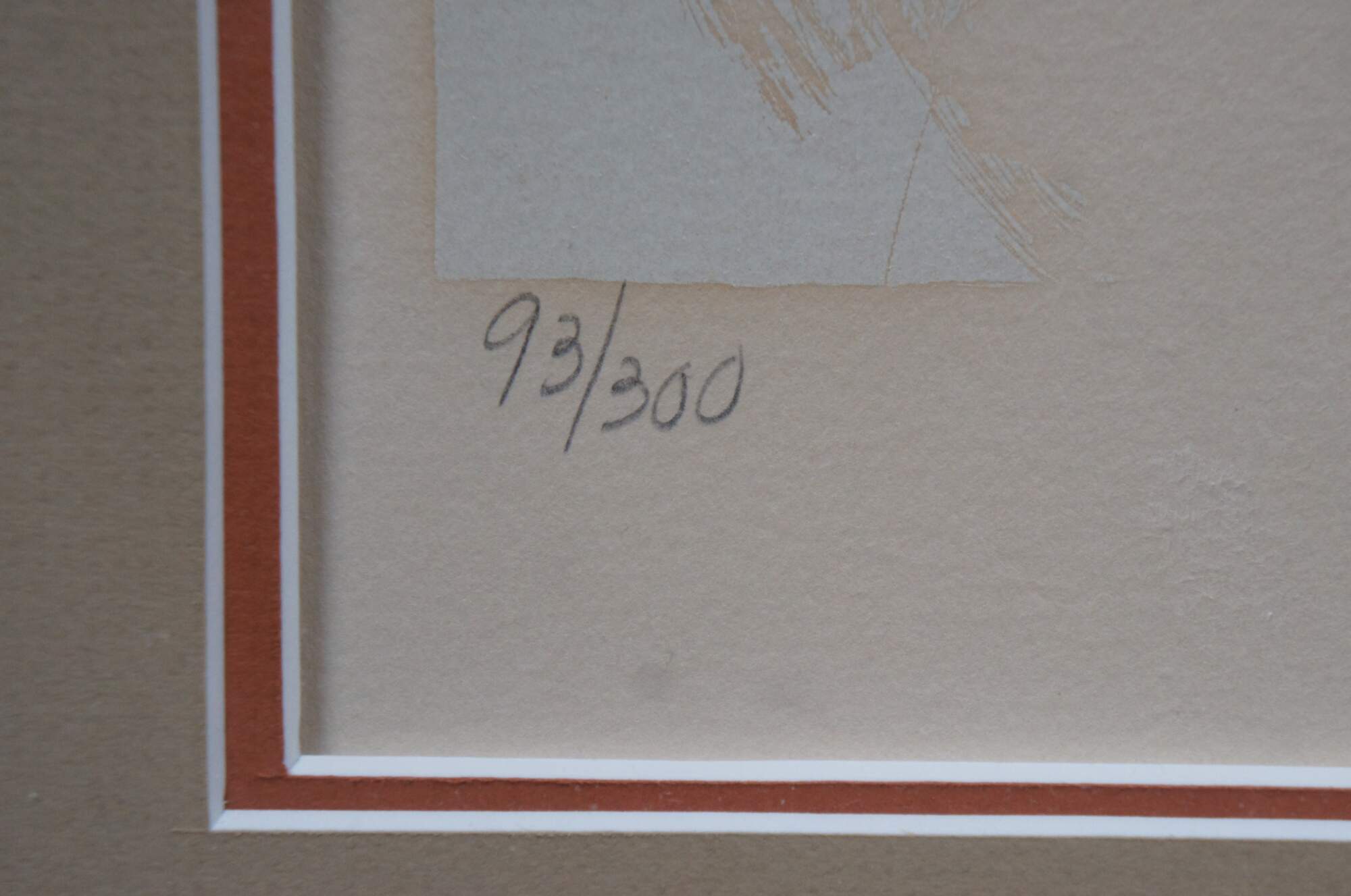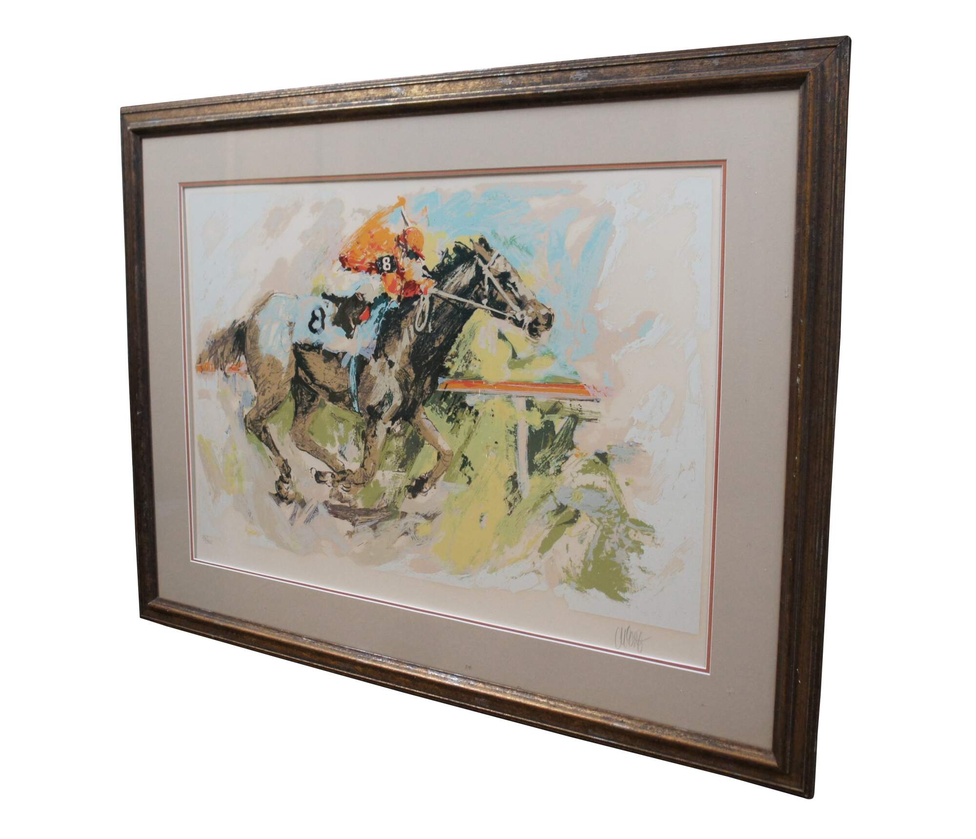 Late 20th century serigraph print titled "Horse Race" by Wayland Moore, featuring a Number 8 horse and jockey in the midst of a race. Pencil signed and numbered 93/300 along the lower edge.