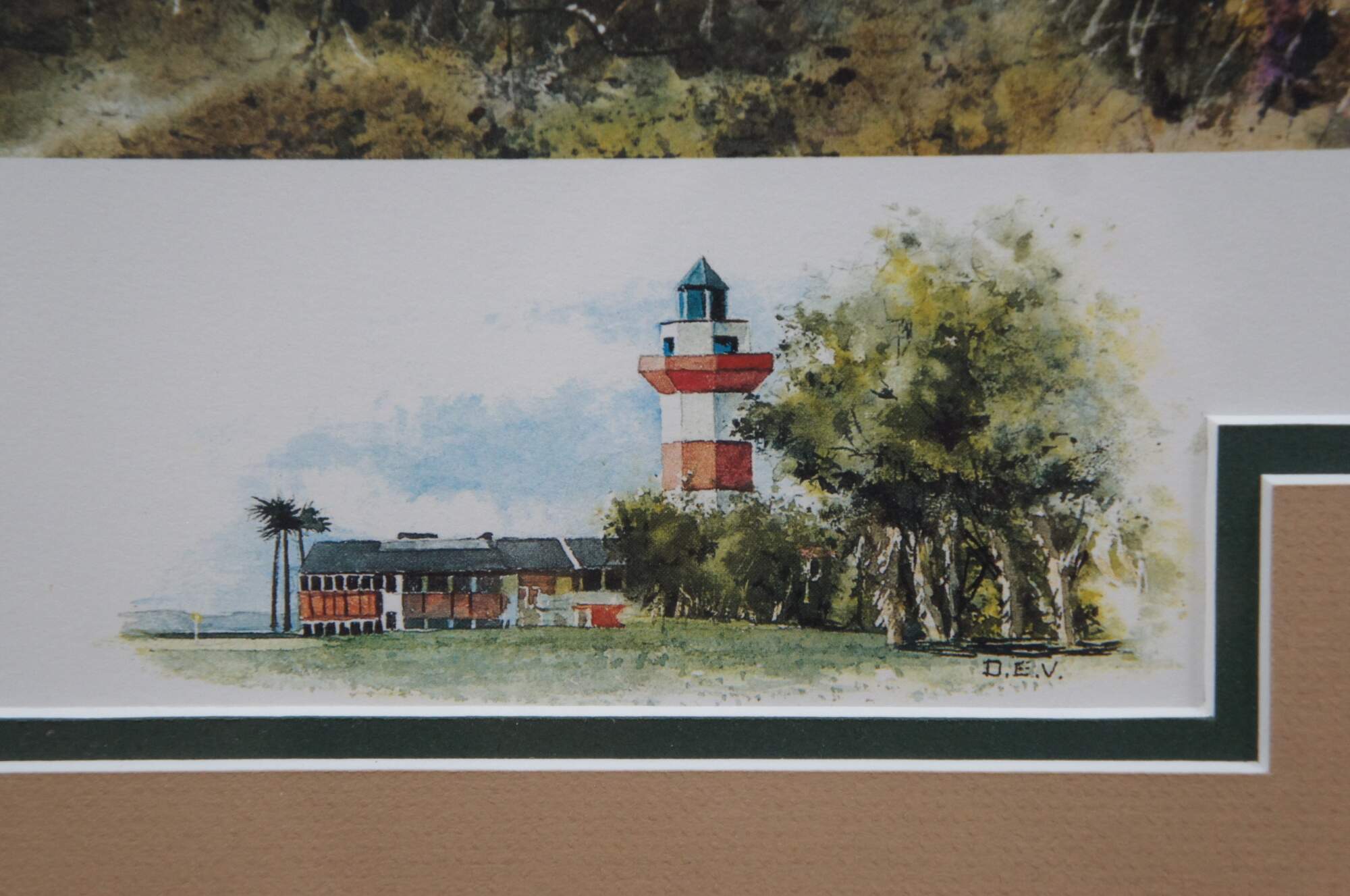 Late 20th century limited edition, signed digital press print of "Southern Classic" golf tournament by Donald Voorhees - The Seventeenth Hole - Harbour Town Golf Links, Hilton Head, S.C. Pencil signed and numbered 190/950 in lower right corner. Beveled / grooved giltwood frame; beige and dark green layered mat.
