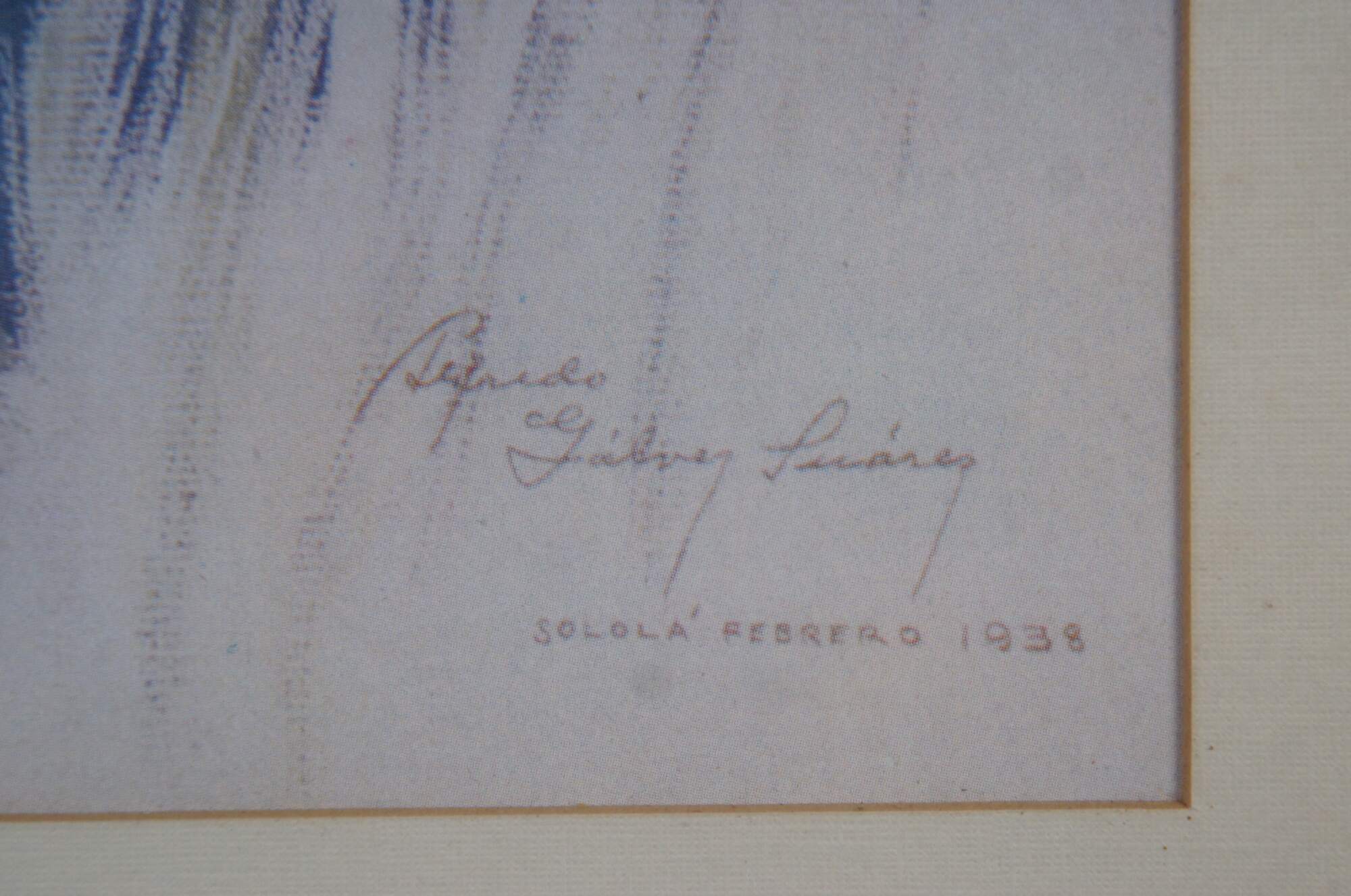 Late 20th century digital press print depicting "The Alderman (Regidor) Mariano Ajcalon" of Solola, Guatemala, painted in 1938 by Alfredo Galvez Suarez. Shows the alderman in an outfit denoting his rank as leader, wearing a blue stripe shirt, red scarf, and floral top hat. From the art portfolio Guatemala Indians, which included 10 of his most famous Native American works. Lightly carved giltwood frame; off white mat.