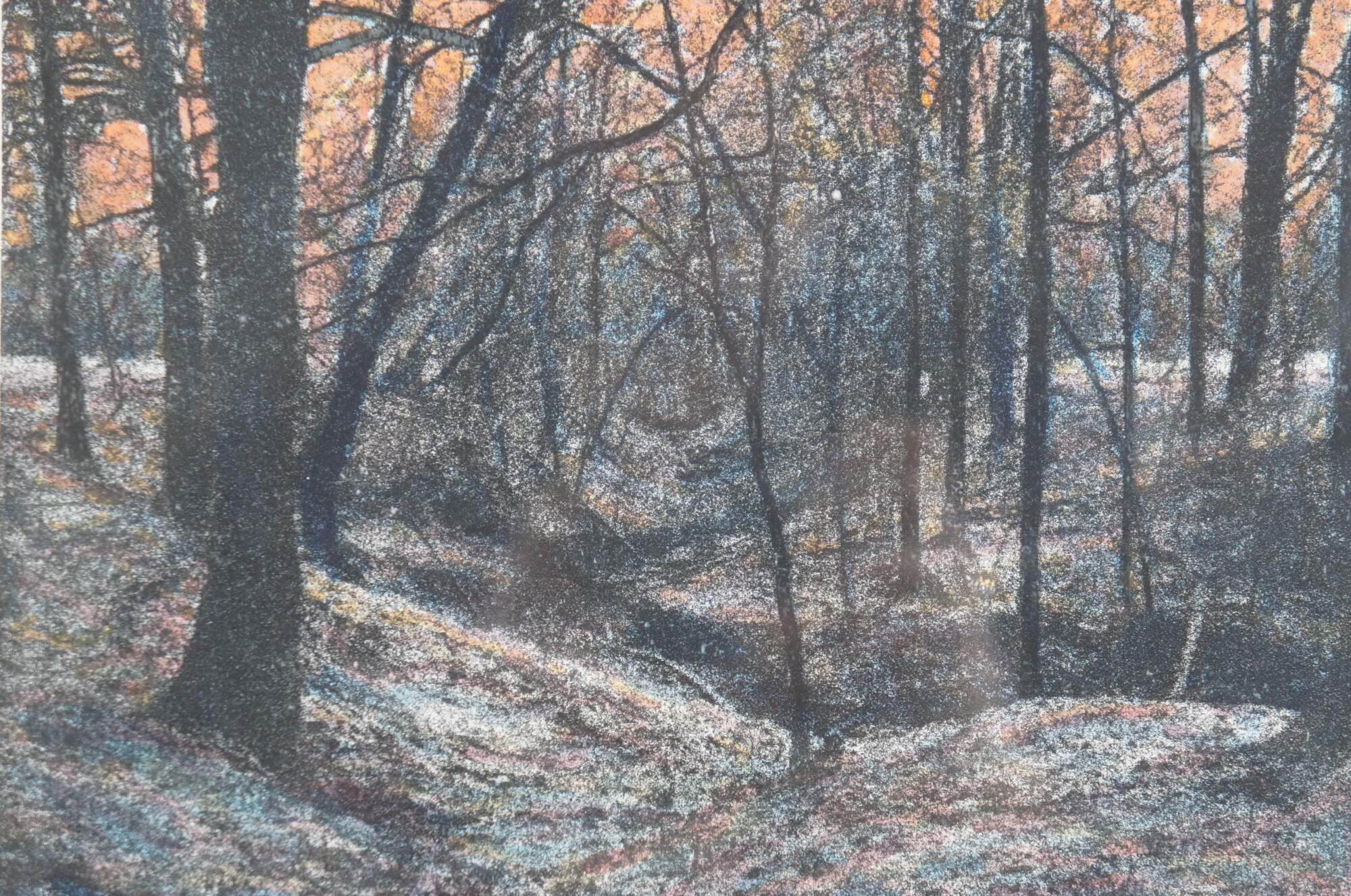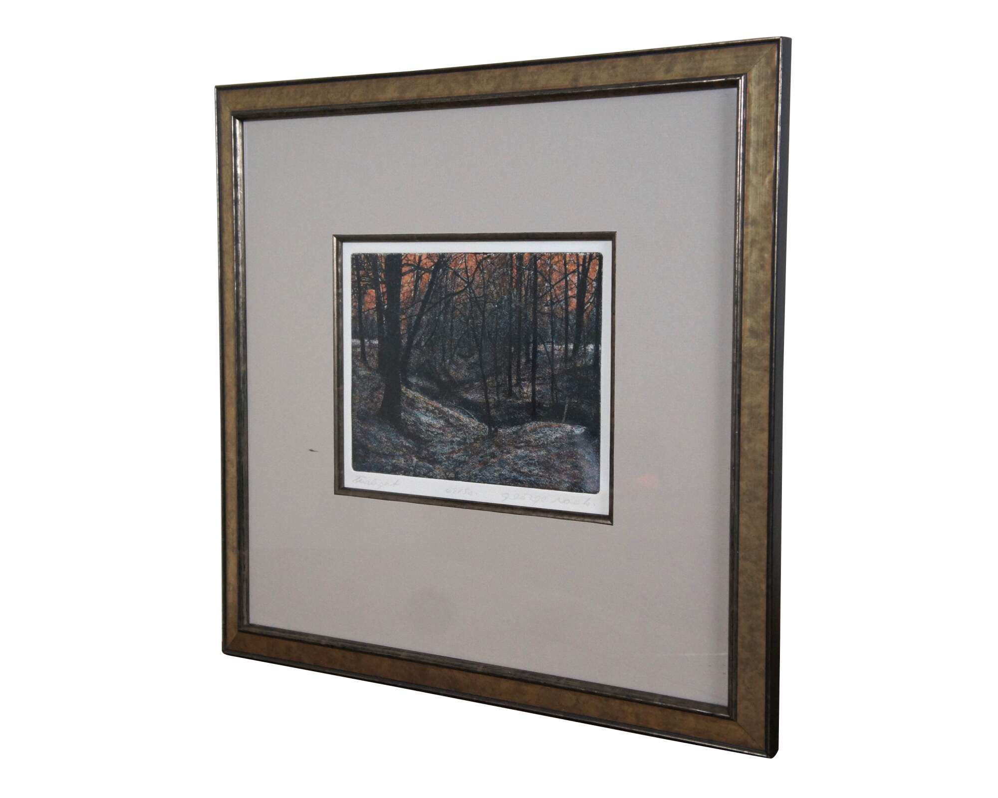 Vintage 20th century print titled Twilight, by George Raab, numbered 49/50, depicting a forest landscape as the sun goes down. Pencil signed, titled, and numbered along lower edge.