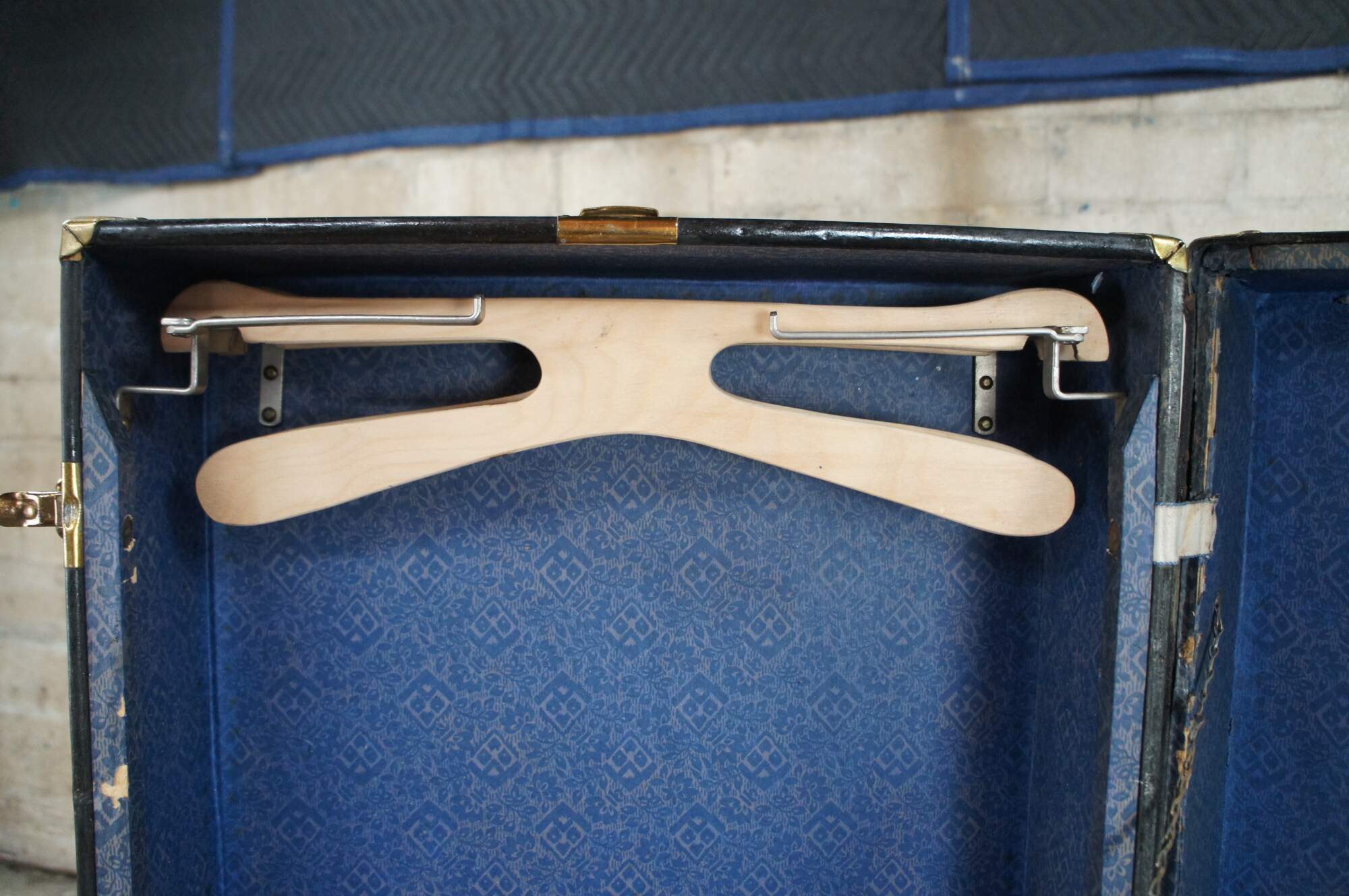 Antique Excelsior wardrobe steamer trunk / suitcase / travel case featuring black exterior with nailhead trim and brass hardware. Opens to original blue interior with hanging rack and hangers, a drop down compartment / drawer, and removable case.