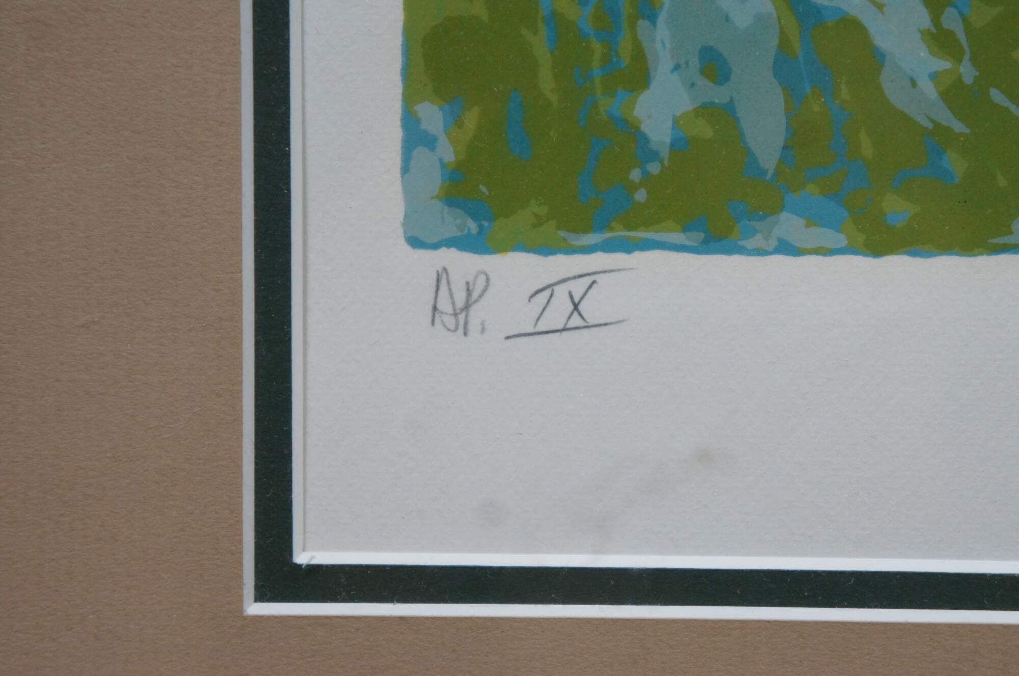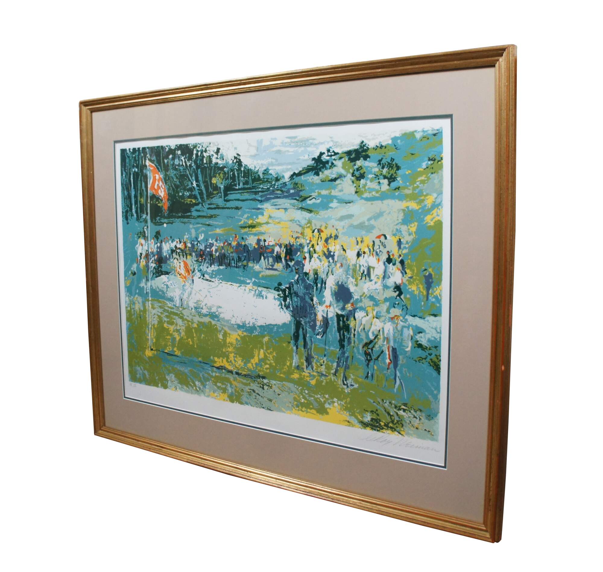 Late 20th century arist's proof serigraph print by LeRoy Neiman, titled Tournament Golf, depicting the participants and onlookers on the 15th hole while a central golfer chips out of a sand trap. Pencil signed and numbered AP IX along lower edge. Beveled giltwood frame; beige and dark green layered mat.