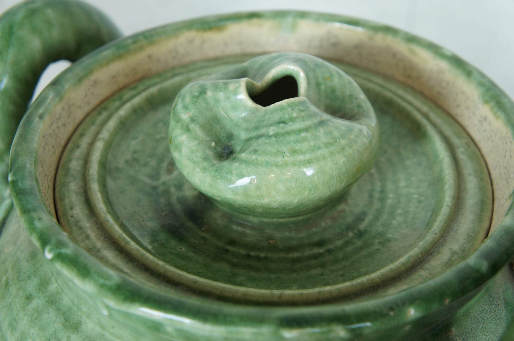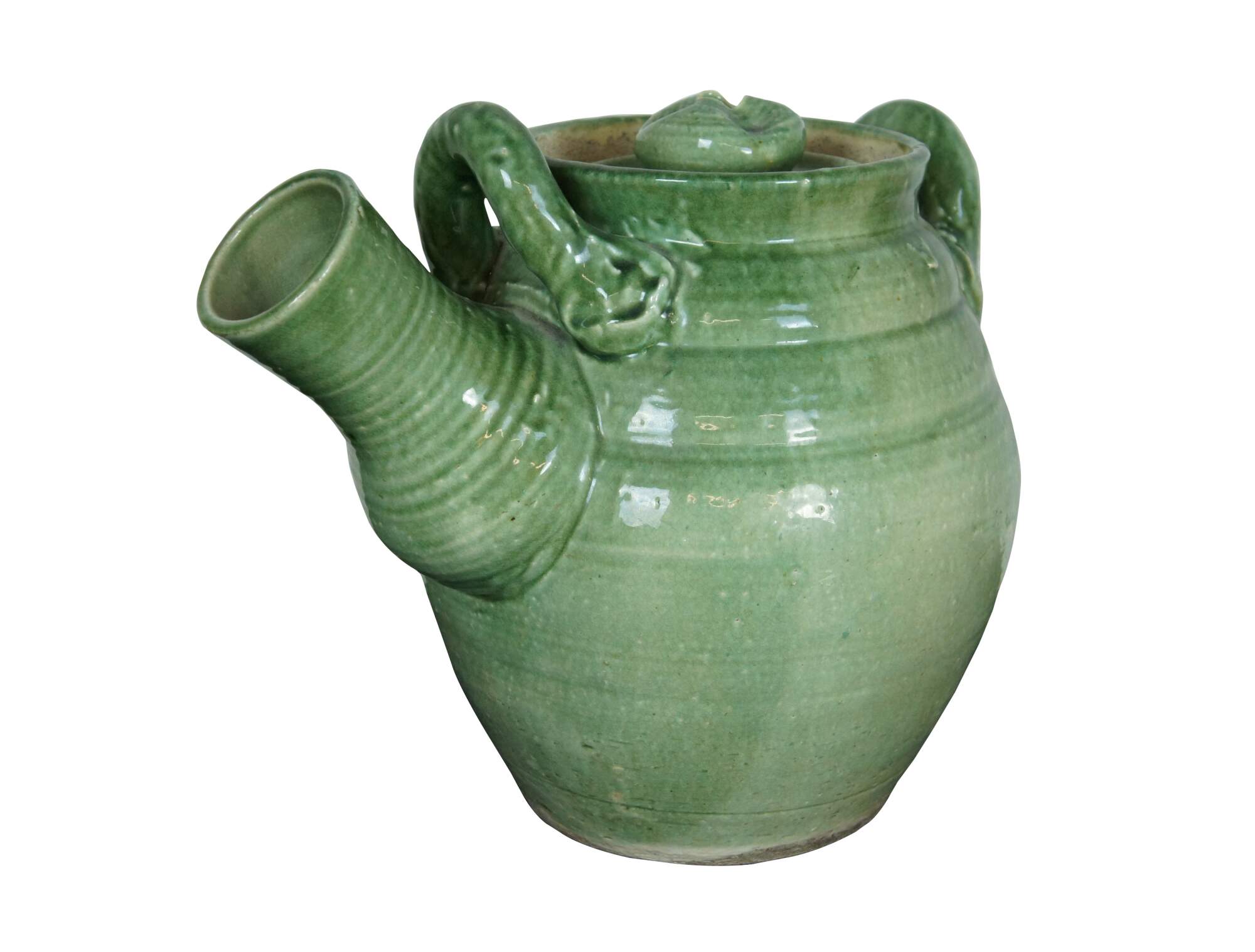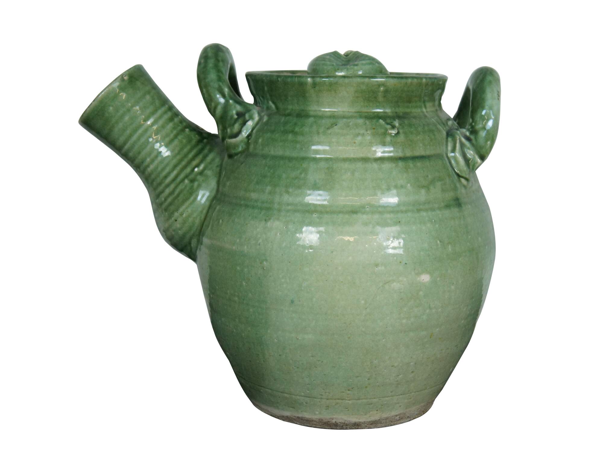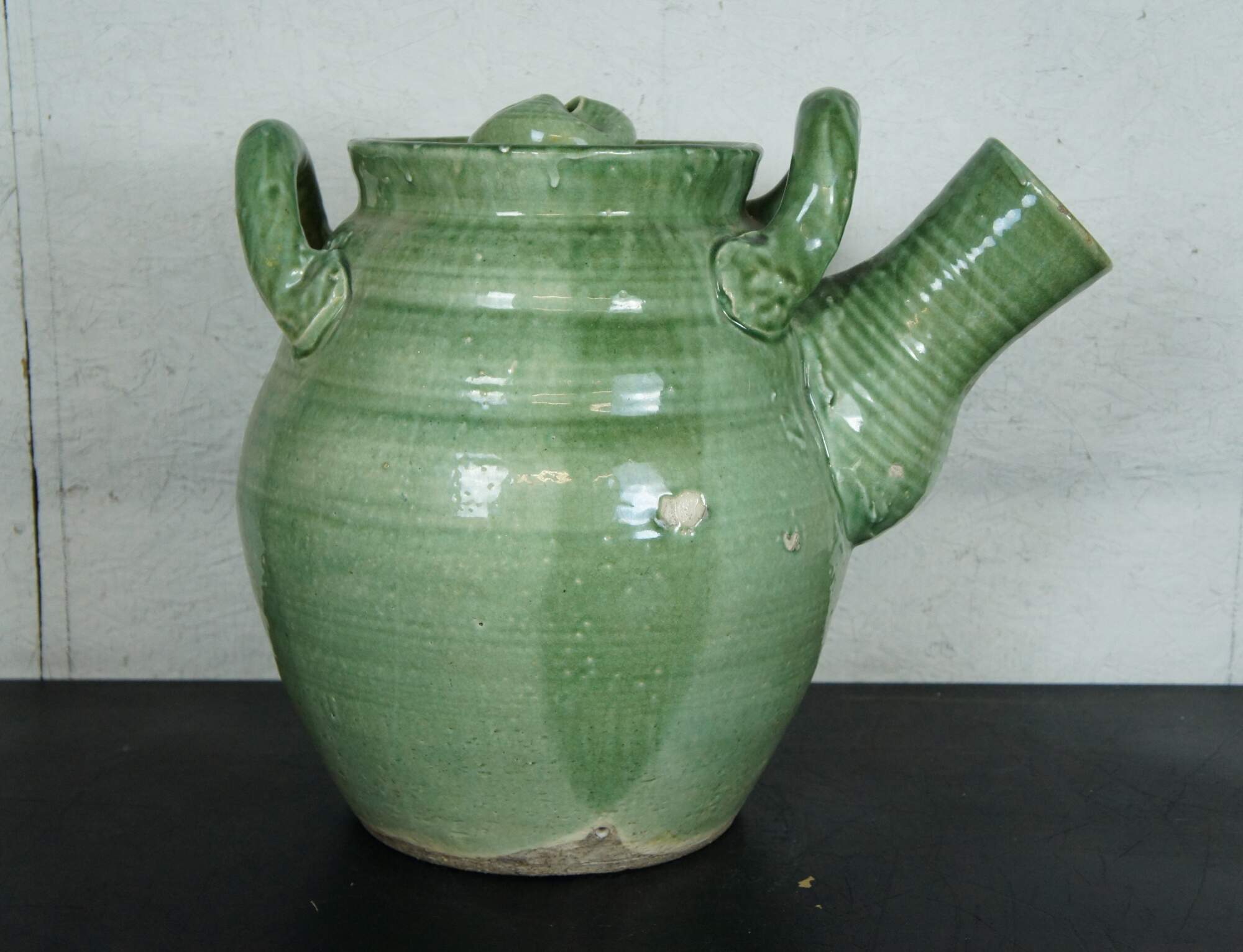 Extra large vintage Japanese earthenware teapot / urn / vase - jar shaped body with two handles and large cylindrical spout with strainer inside where it meets the body, recessed lid with pinched round finial, finished in a grass green glaze. Marked Henkel #6.