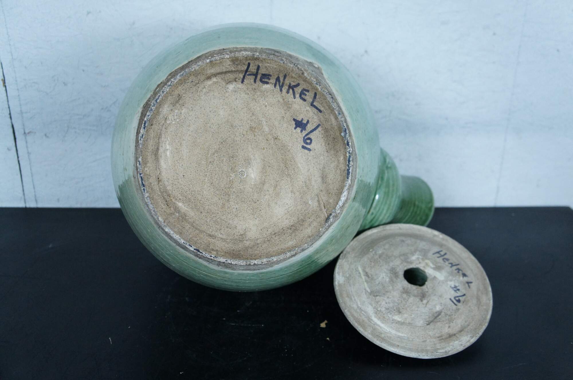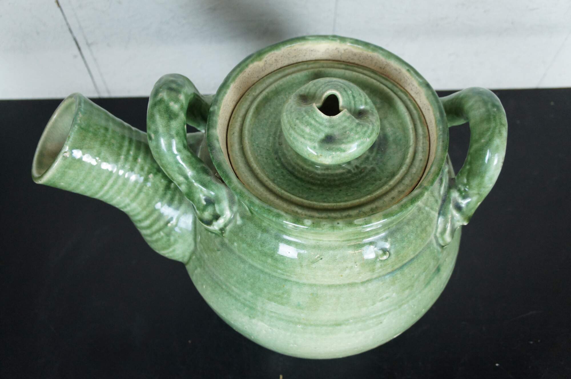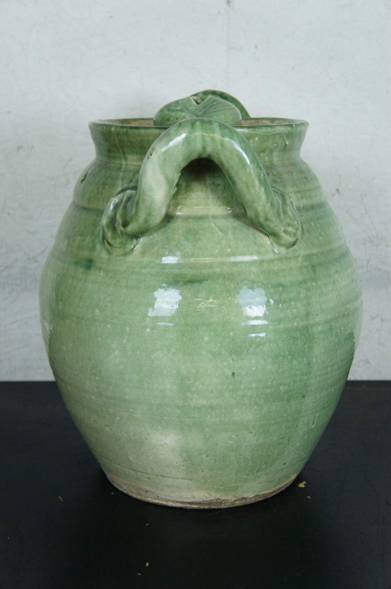 Extra large vintage Japanese earthenware teapot / urn / vase - jar shaped body with two handles and large cylindrical spout with strainer inside where it meets the body, recessed lid with pinched round finial, finished in a grass green glaze. Marked Henkel #6.