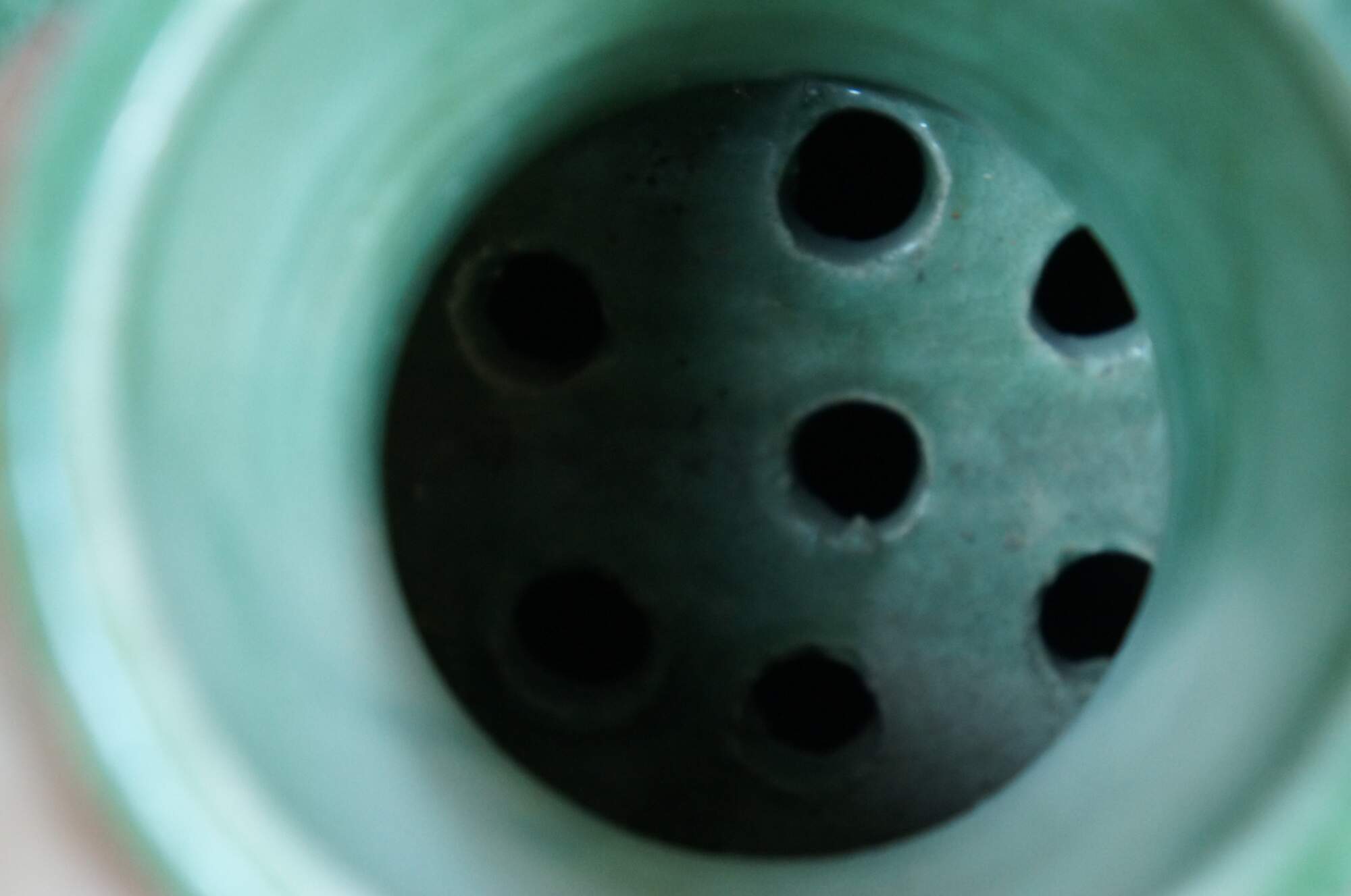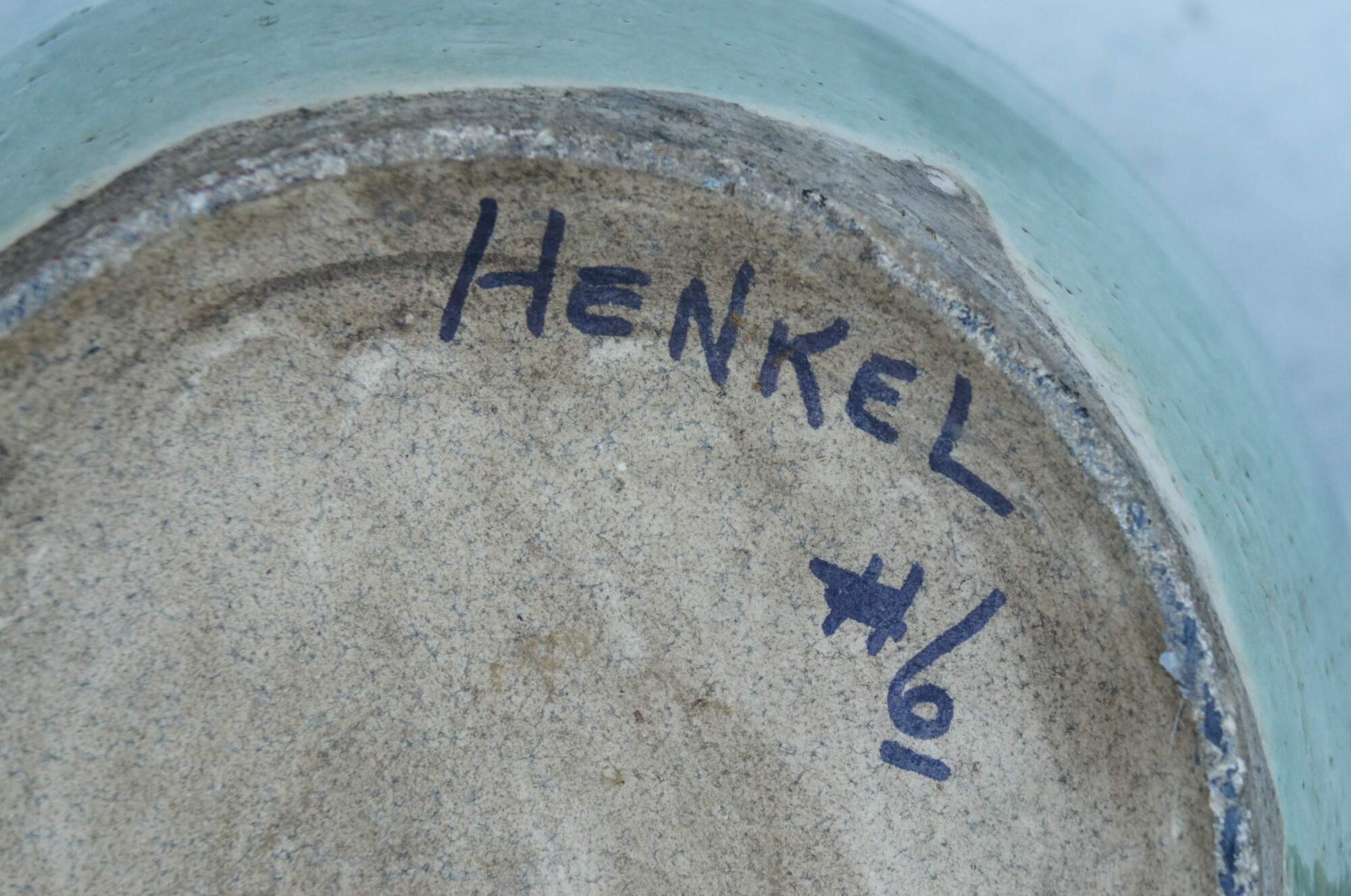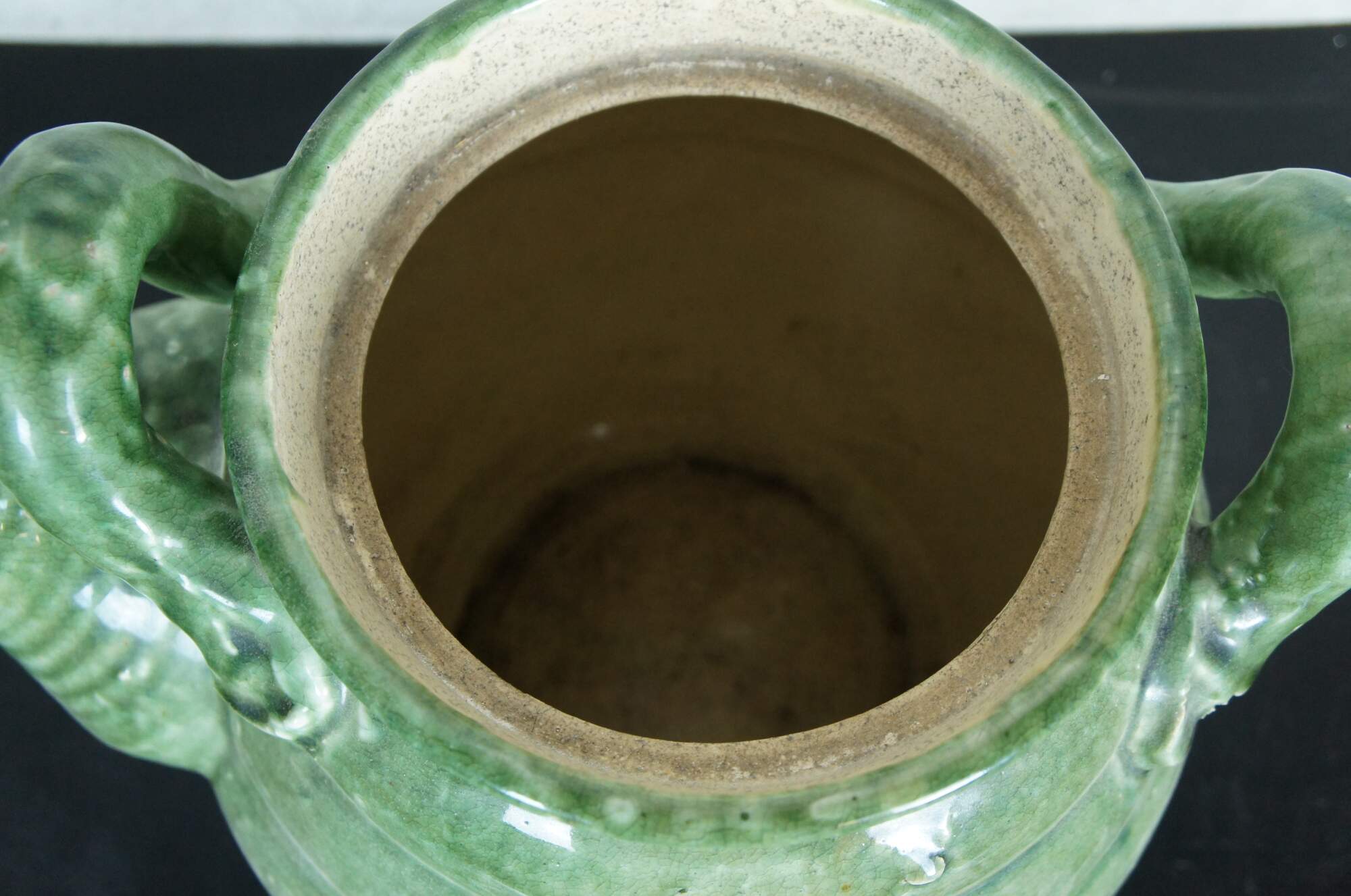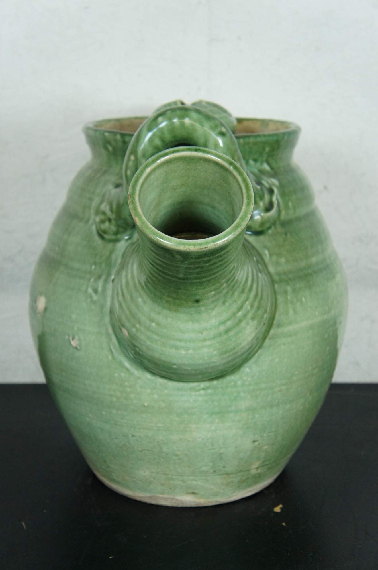 Extra large vintage Japanese earthenware teapot / urn / vase - jar shaped body with two handles and large cylindrical spout with strainer inside where it meets the body, recessed lid with pinched round finial, finished in a grass green glaze. Marked Henkel #6.