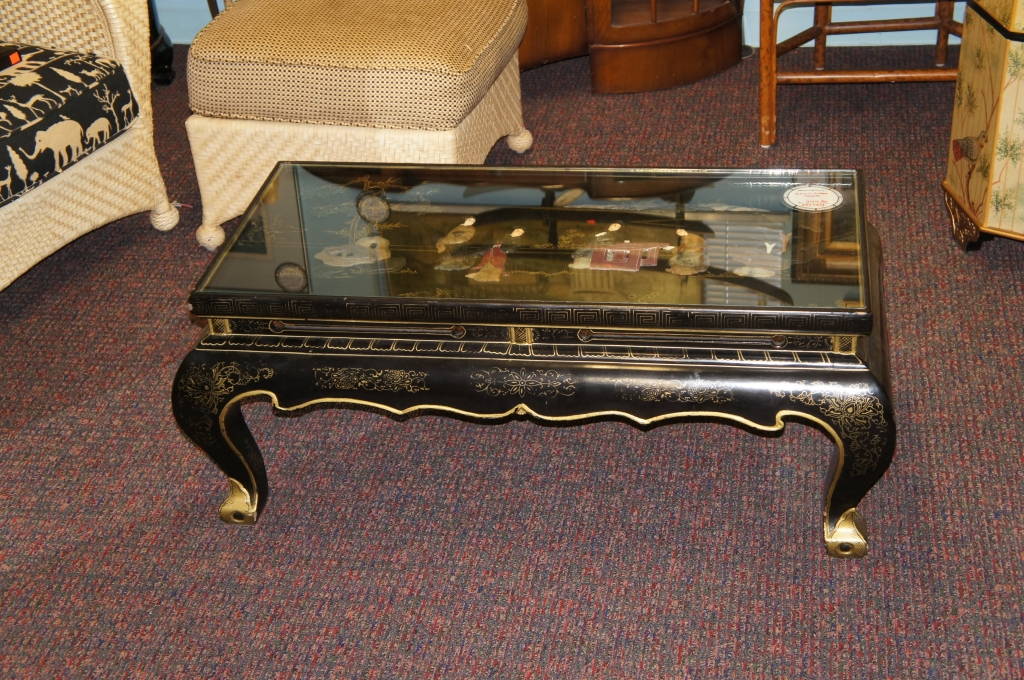 Vintage Asian Black Lacquer Hand Painted Coffee Table Glass Top Gold Trim Ships