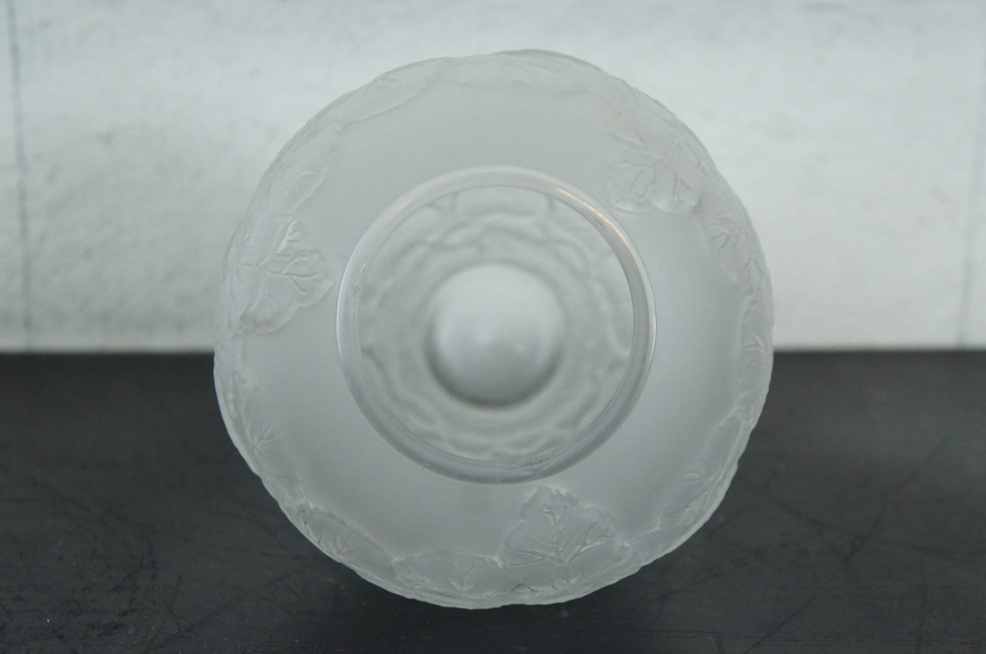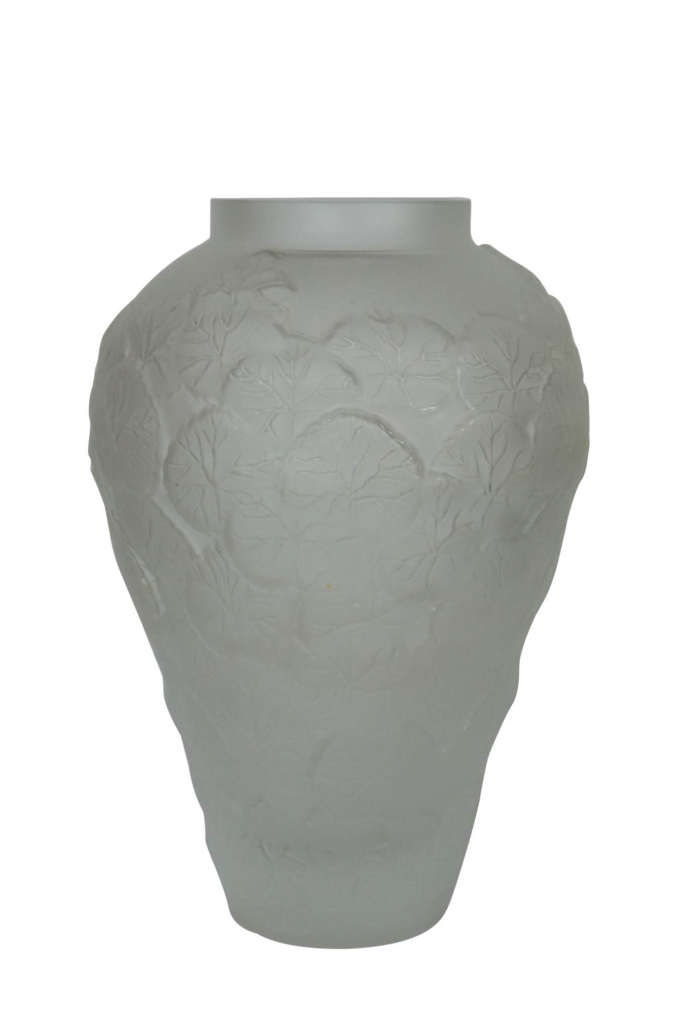 A large vintage Pheonix Consolidated frosted glass vase, featuring a round bulbbous top with a tapered base, molded with an overlapping pattern of heavily veined lotus leaves.