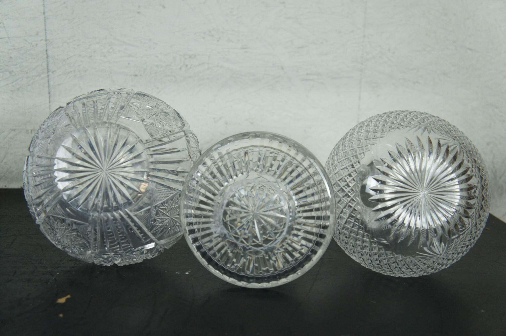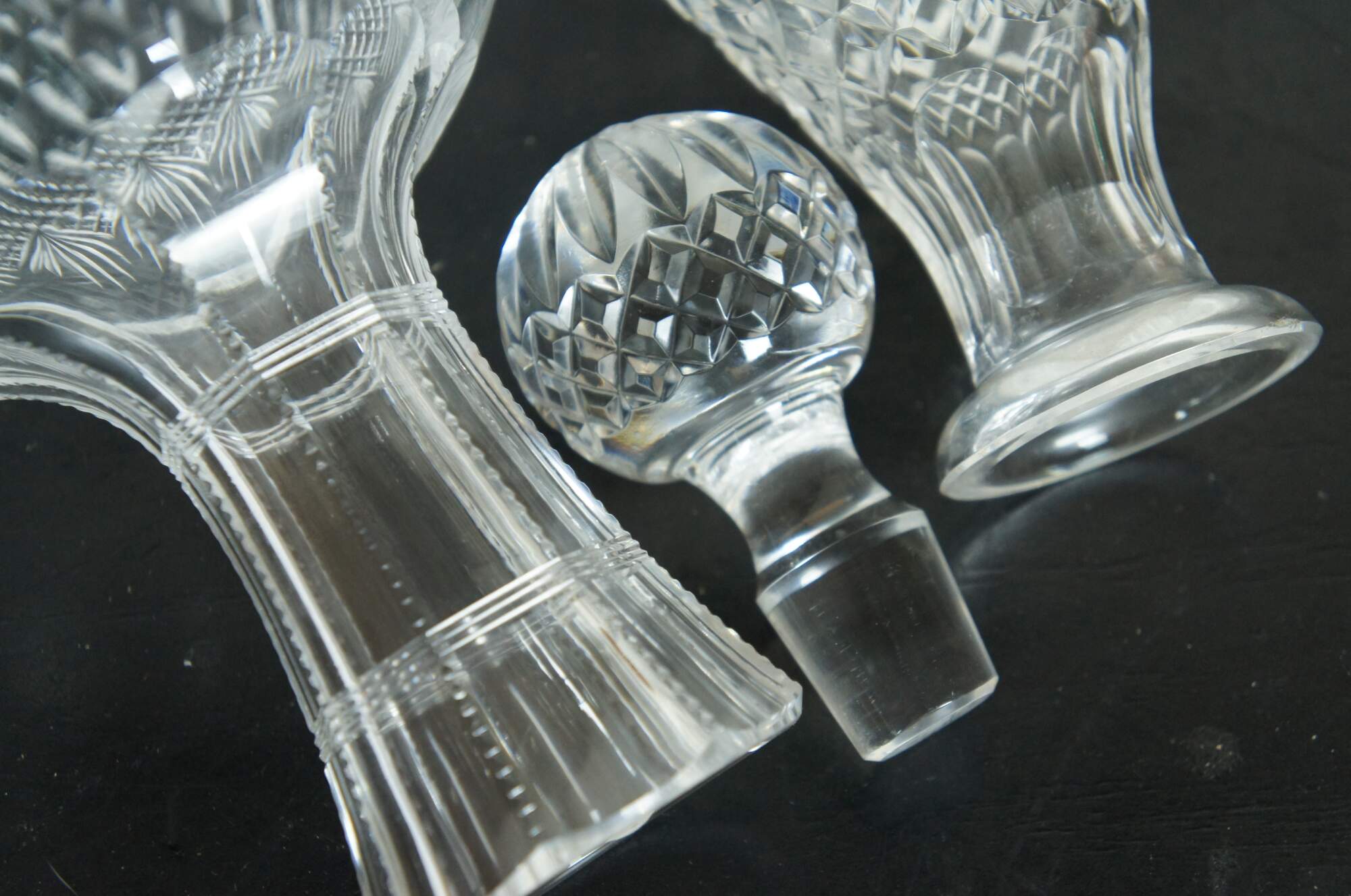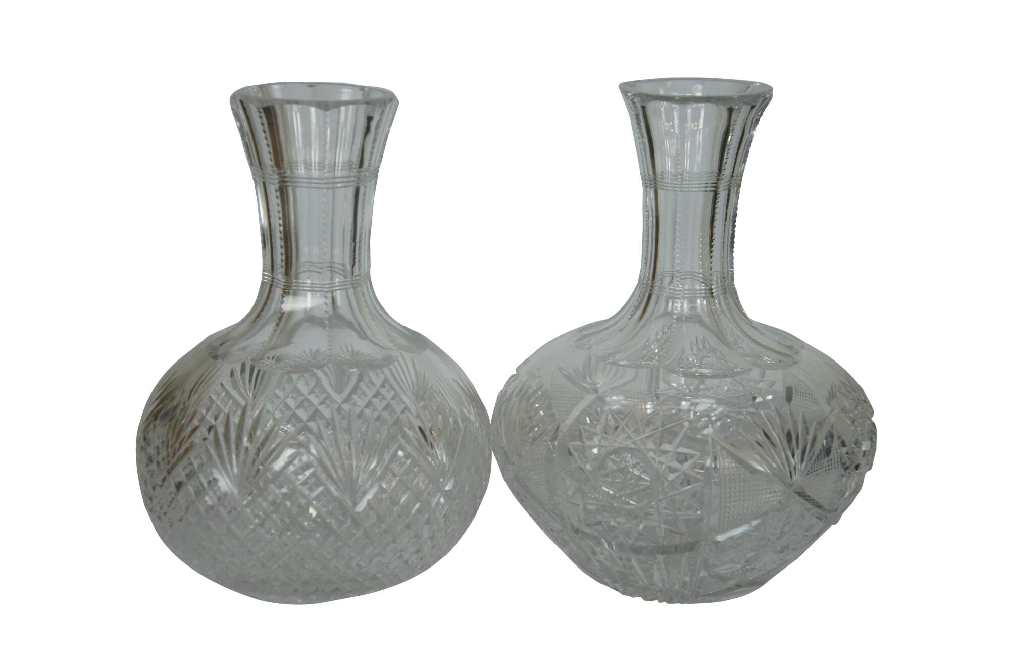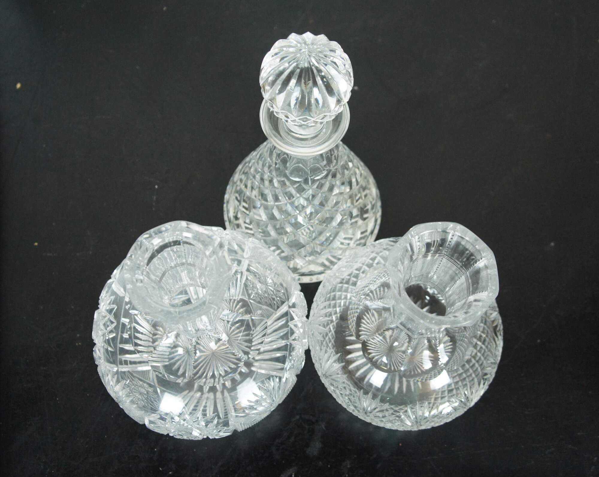 Set of three mid to late 20th century cut crystal decanters / carafes, cut with a variety of mixed patterns including diamonds, fan / leafs designs and many pointed stars / pinwheels. Two round bodied with tapered neck and flared mouth (no stoppers), and one conical shape with cut orb stopper. No makers marks.