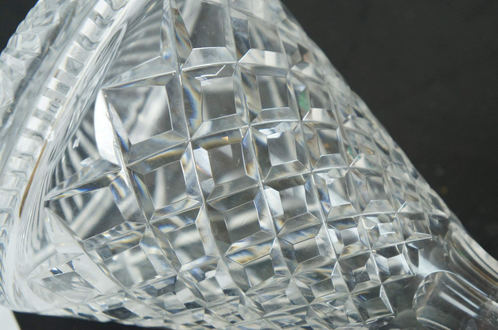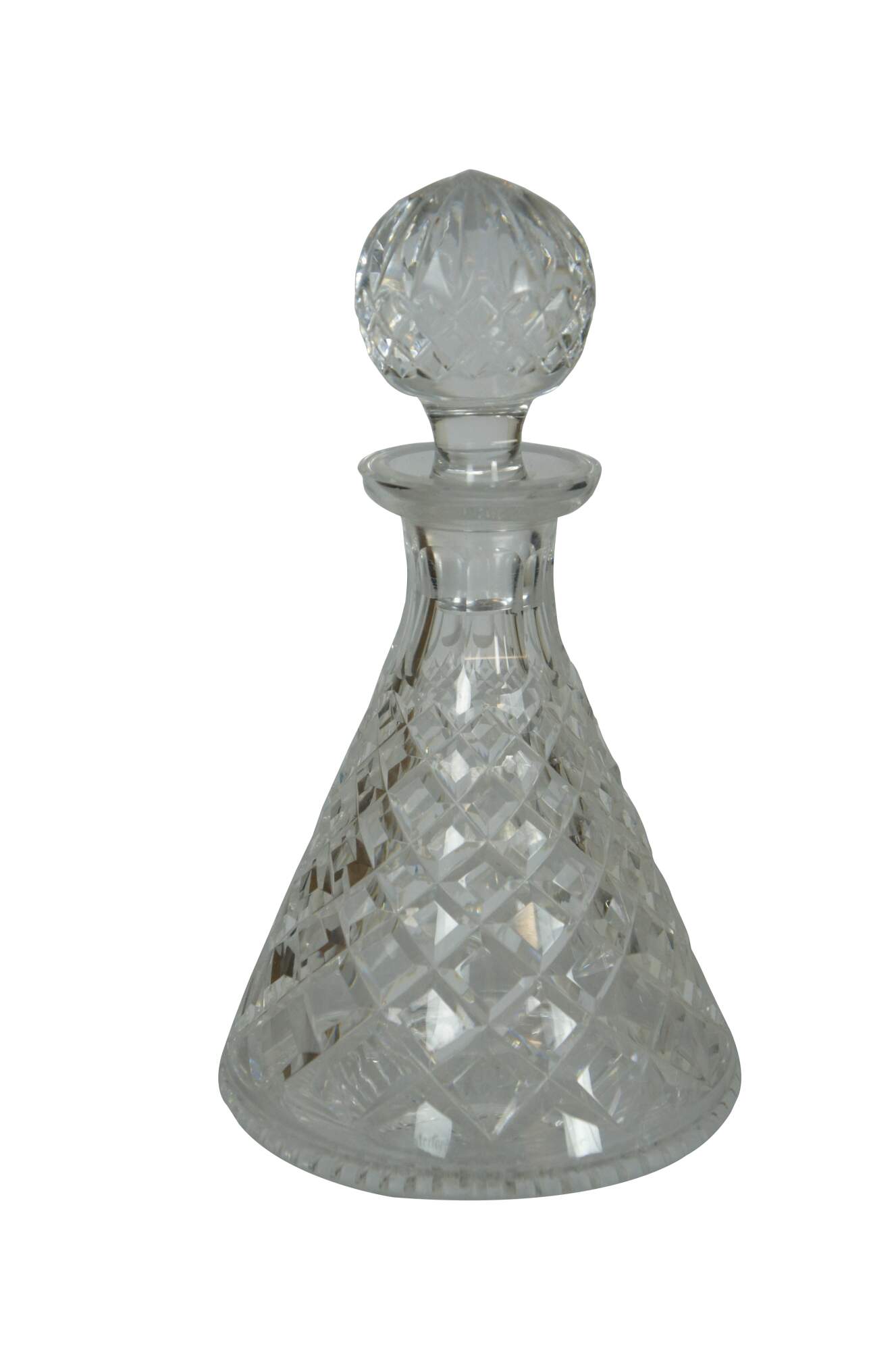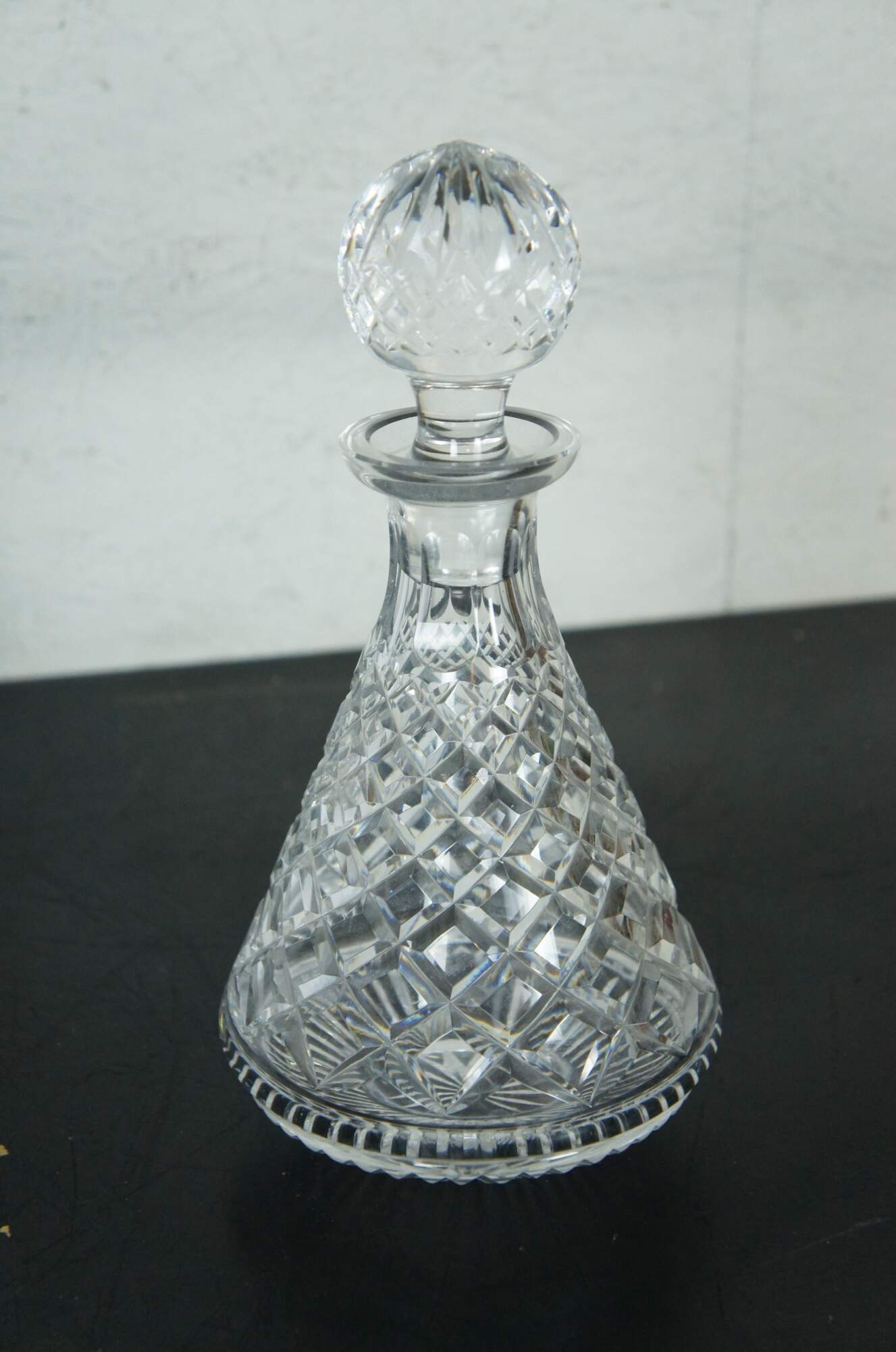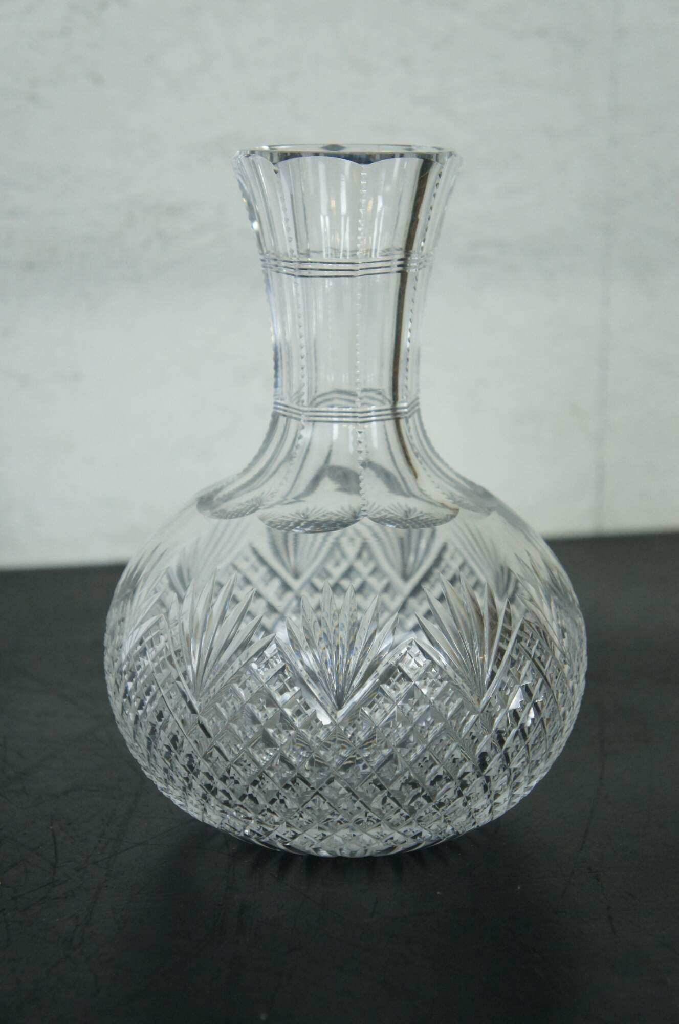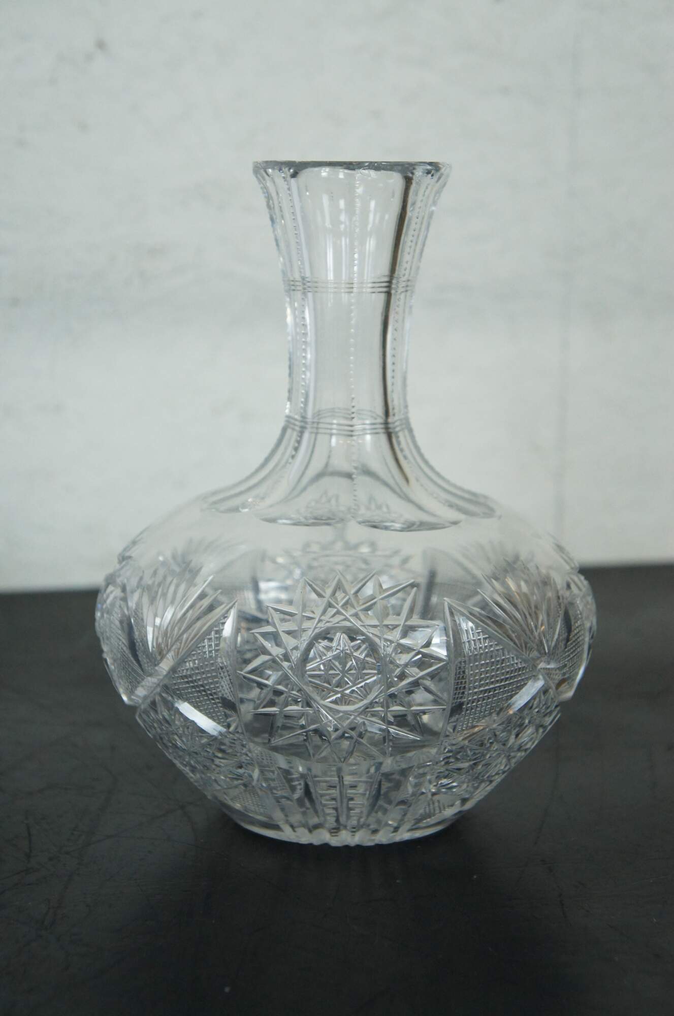 Set of three mid to late 20th century cut crystal decanters / carafes, cut with a variety of mixed patterns including diamonds, fan / leafs designs and many pointed stars / pinwheels. Two round bodied with tapered neck and flared mouth (no stoppers), and one conical shape with cut orb stopper. No makers marks.