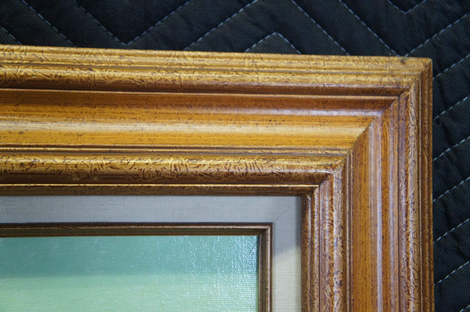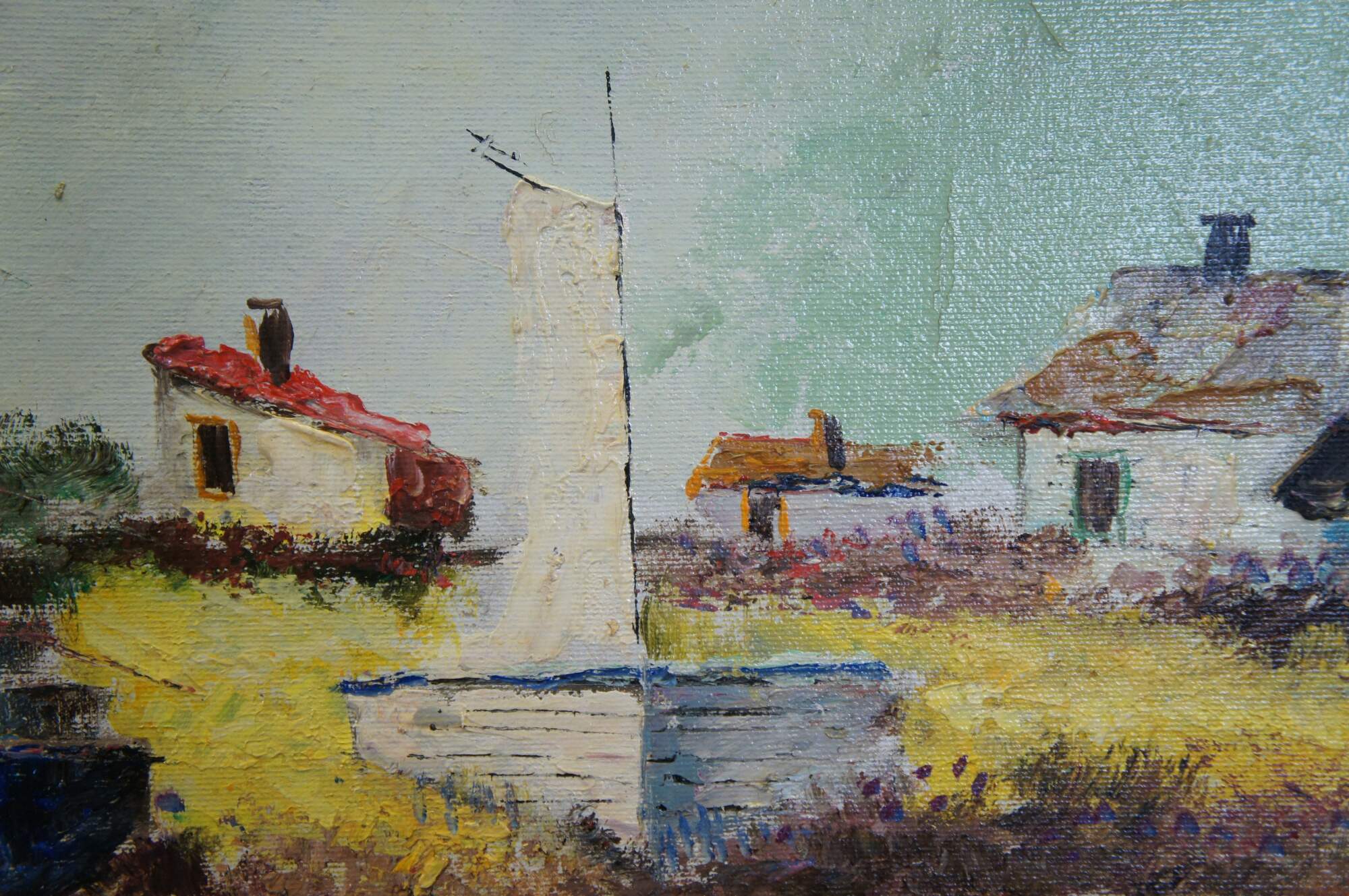 Vintage Impressionist oil painting on canvas by Joseph Nagy. It features a landscape theme of houses overlooking two beached sailboats / boats and water. Signed lower right.