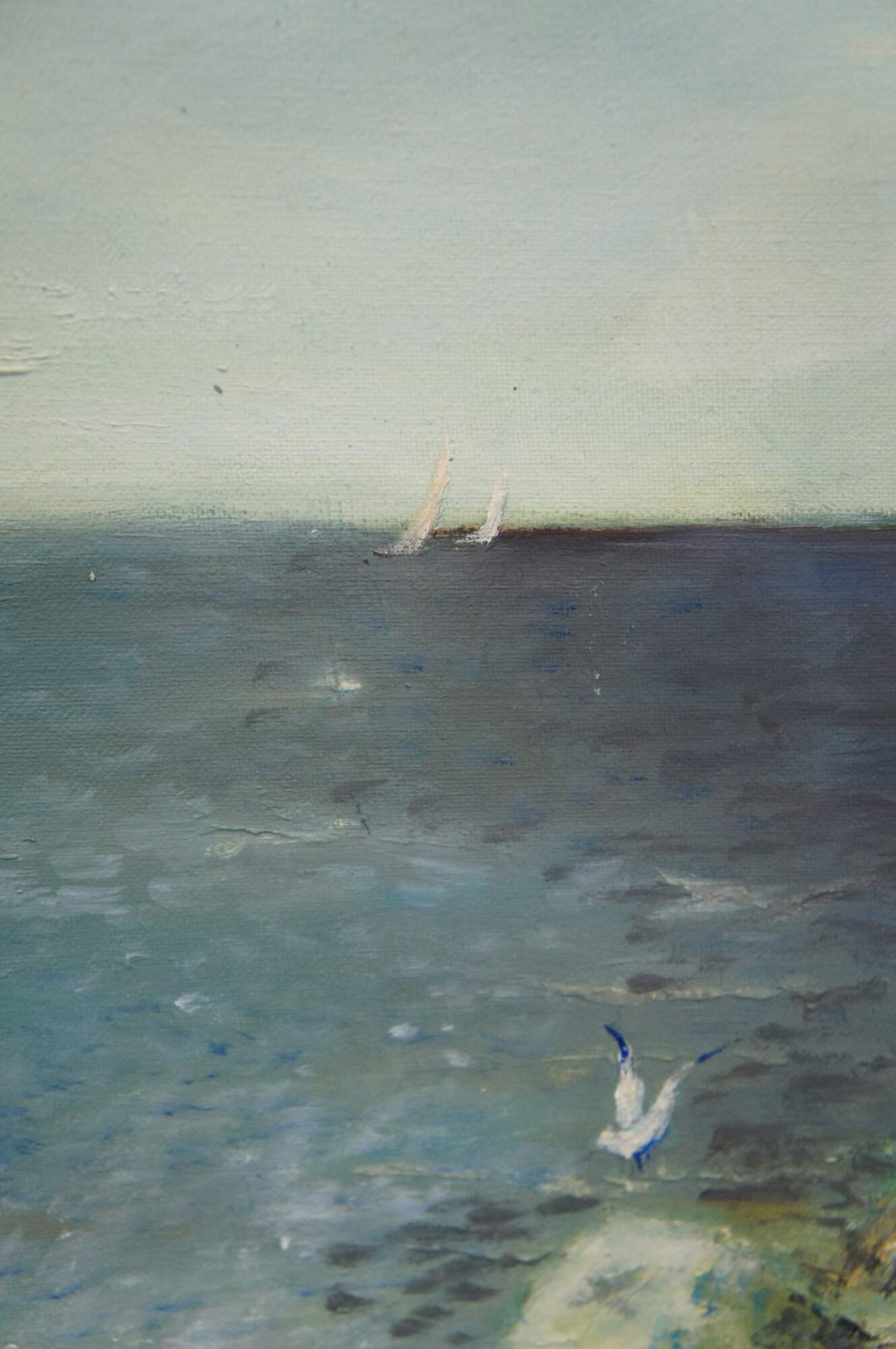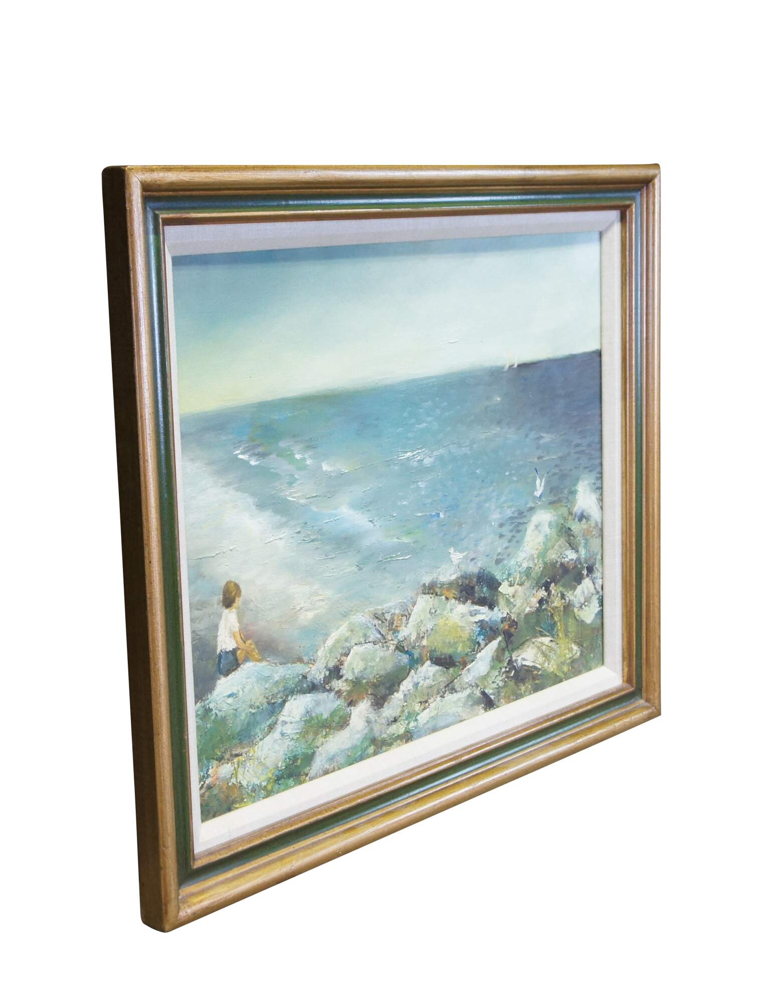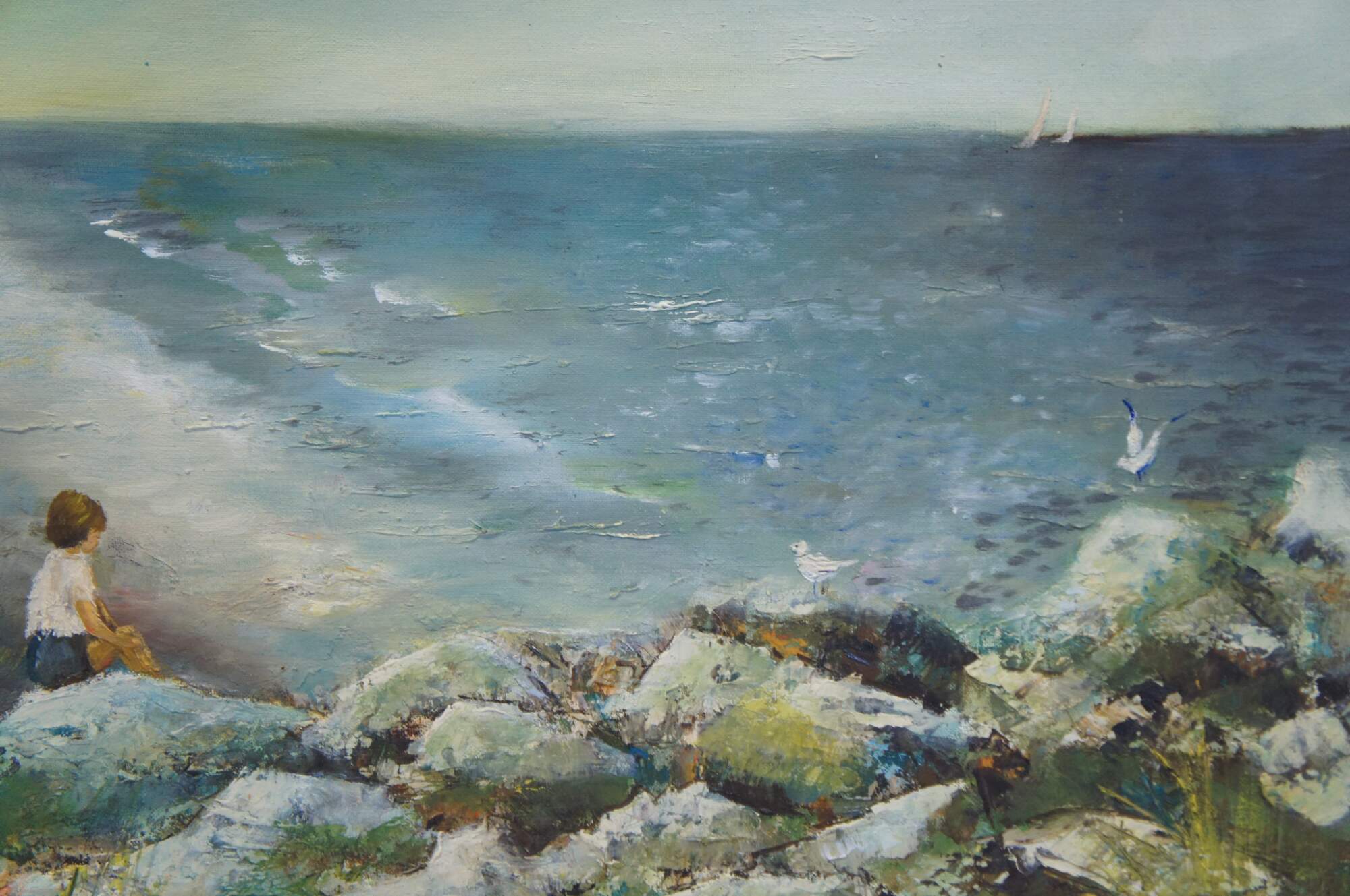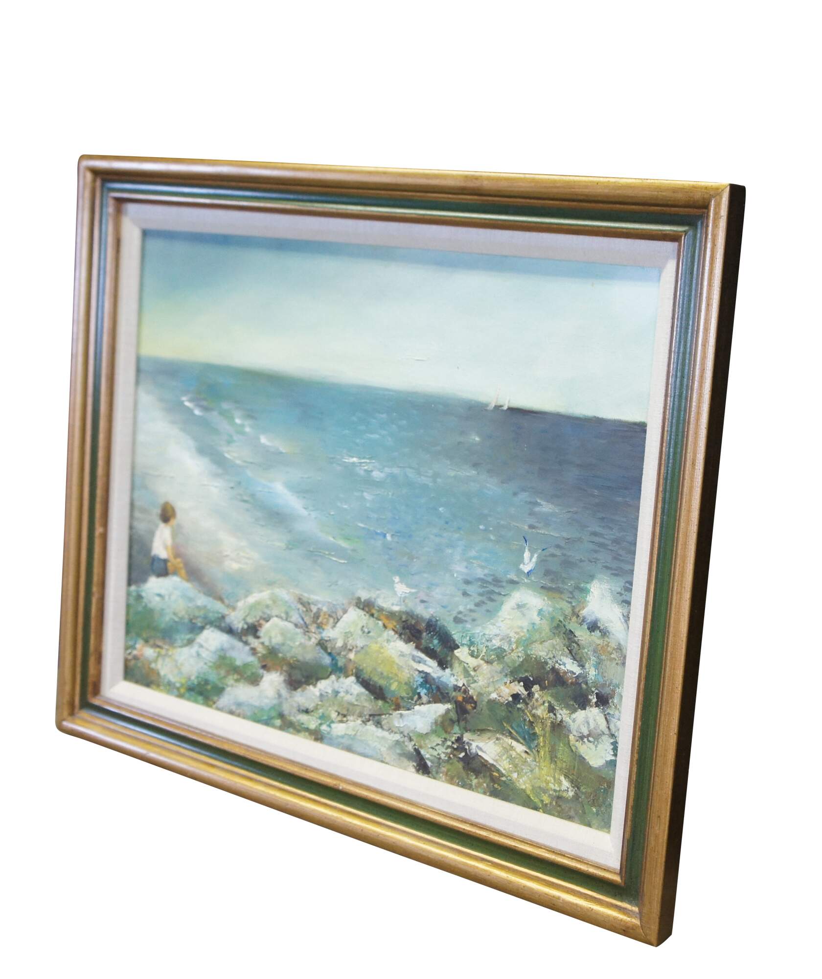 Vintage nautical maritime seascape oil painting on board featuring a child sitting on the rocks overlooking seagulls and the ocean with two sailboats.