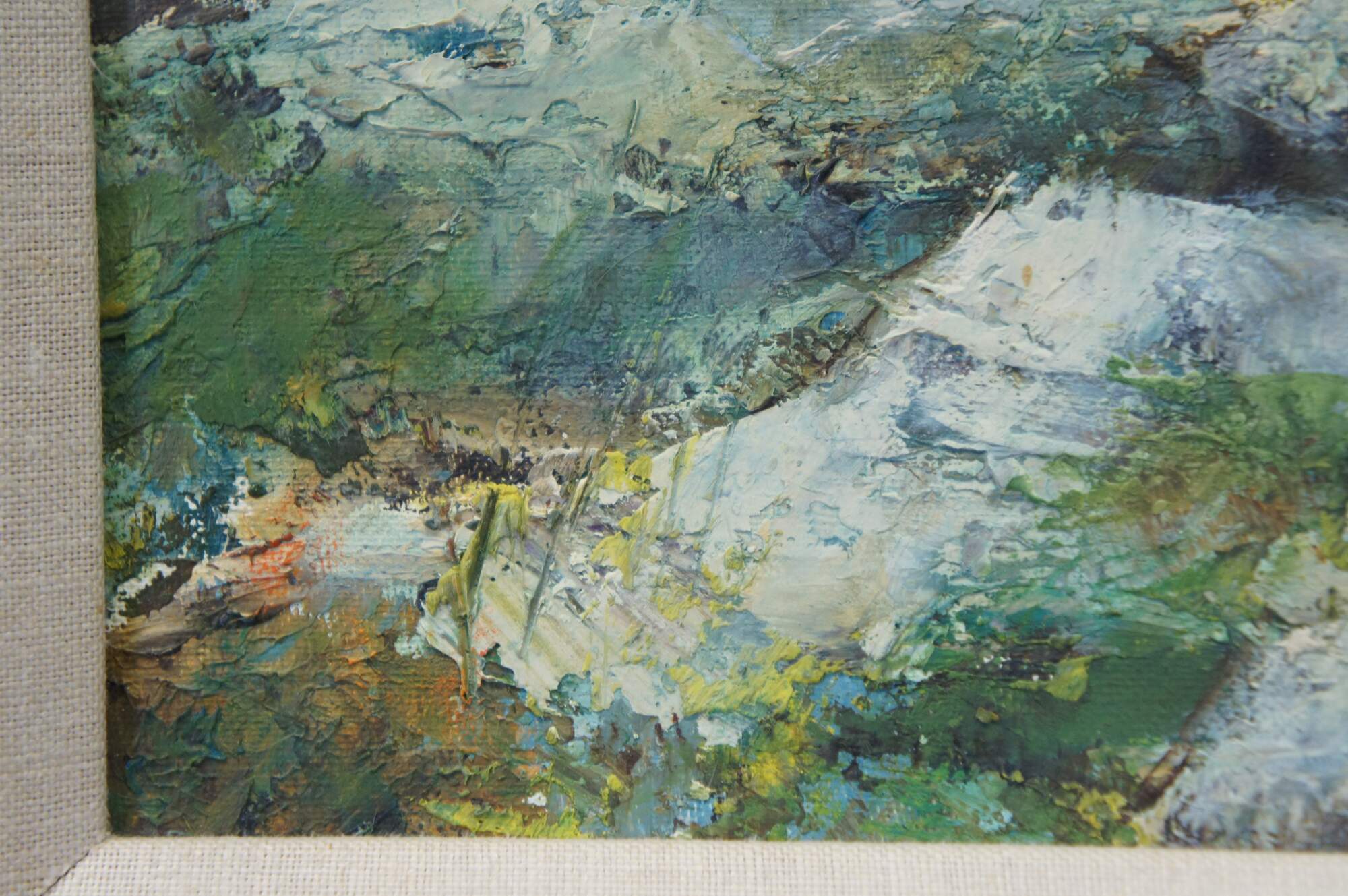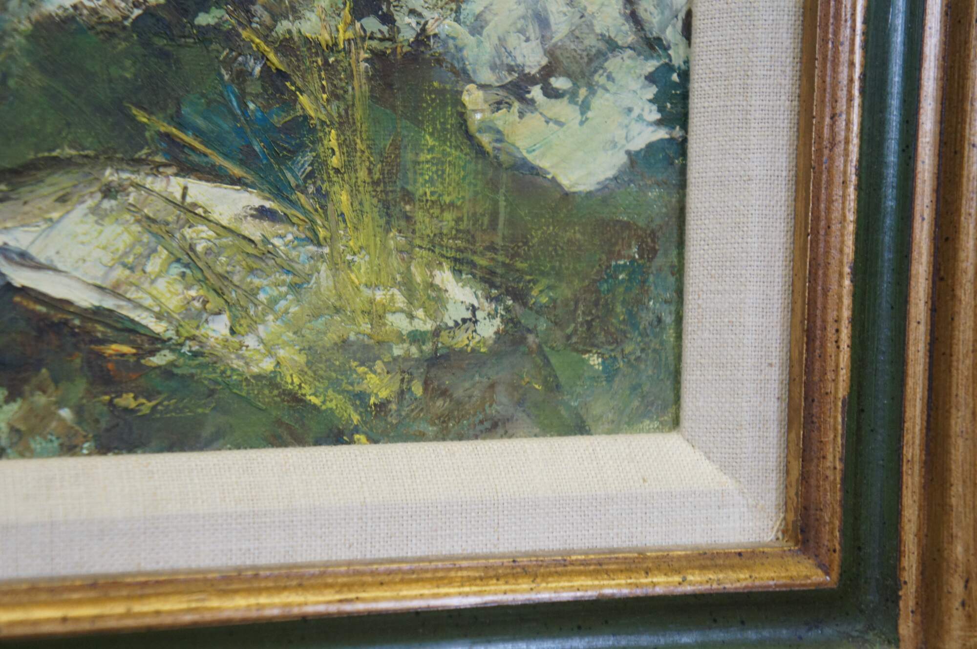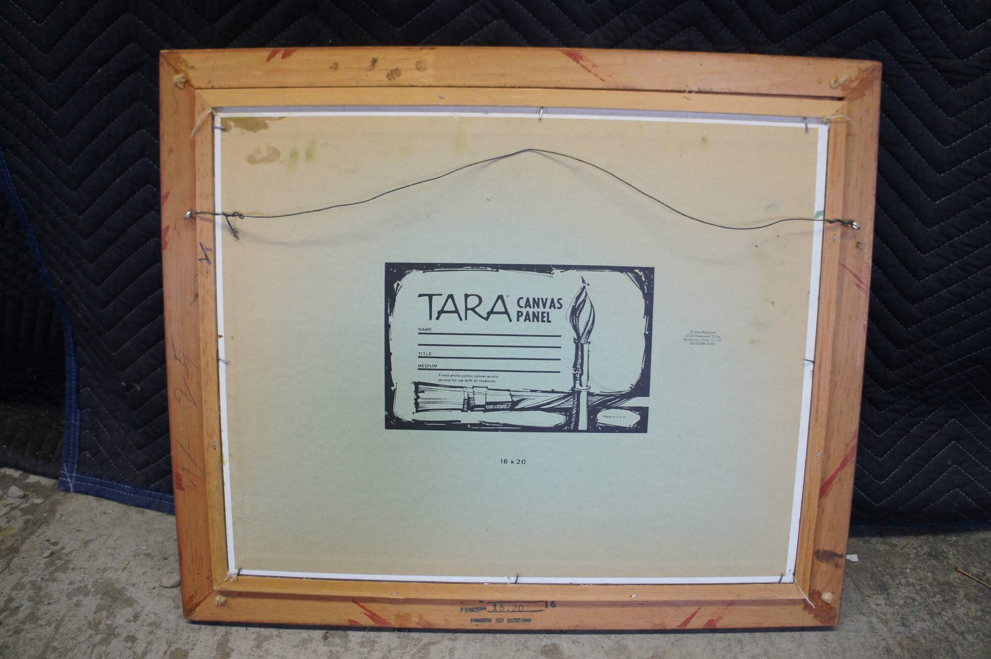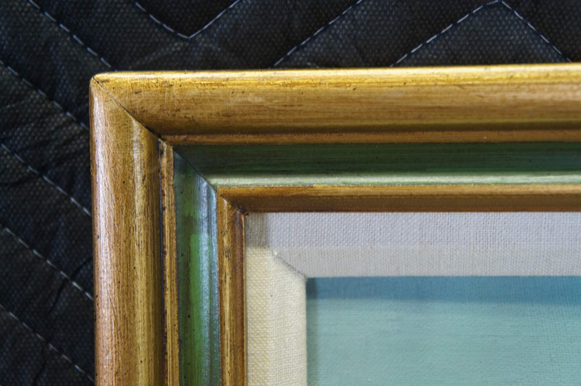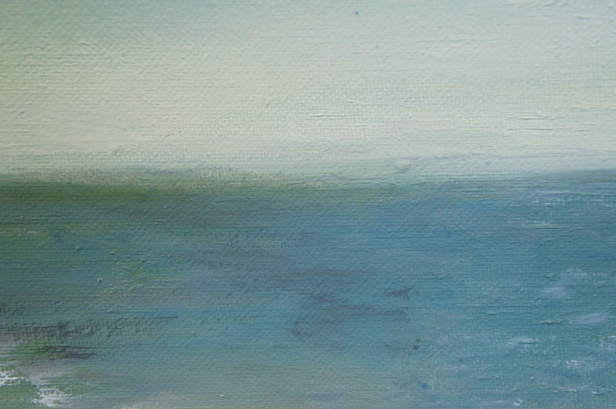 Vintage nautical maritime seascape oil painting on board featuring a child sitting on the rocks overlooking seagulls and the ocean with two sailboats.