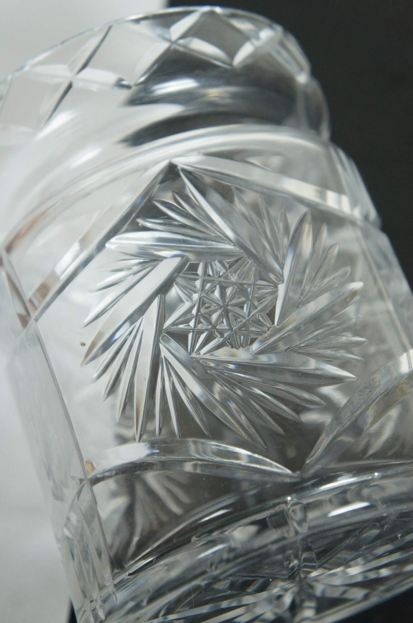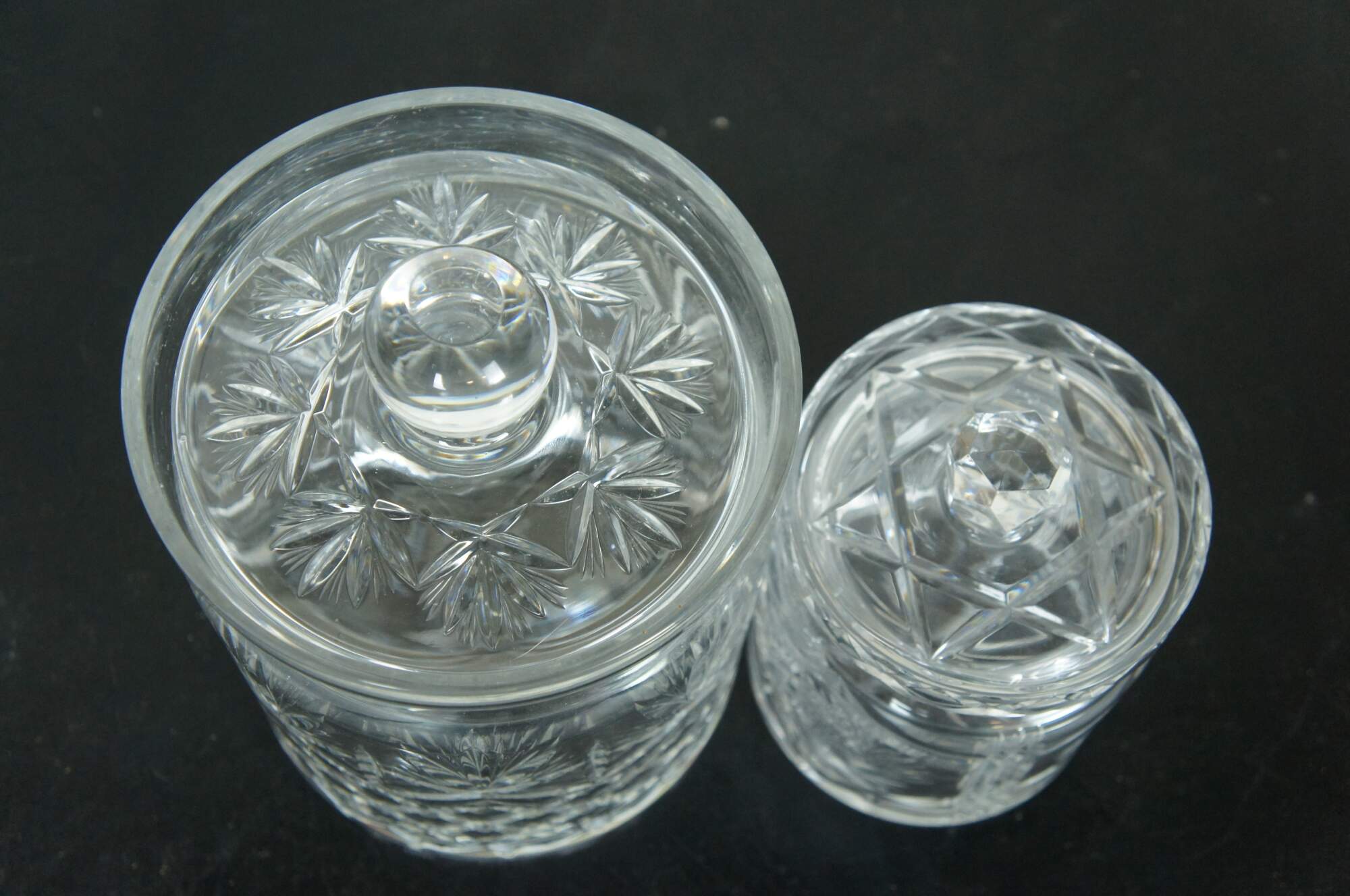 Pair of mid to late 20th century cut crystal lidded biscuit apothecary jars. One features a diamond and fan / leaf design. The other features a pinsheel motif around an eight pointed star.