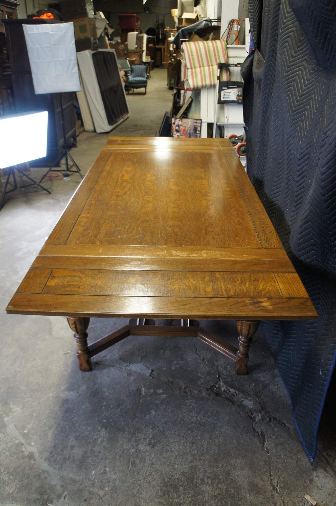 An Impressive early 20th century Elizabethan or Jacobean style Oak Draw-Leaf table. Features a rectangular plank top with pull-out leaves on each end, Bulbous carved legs and notched feet connected by stretchers.