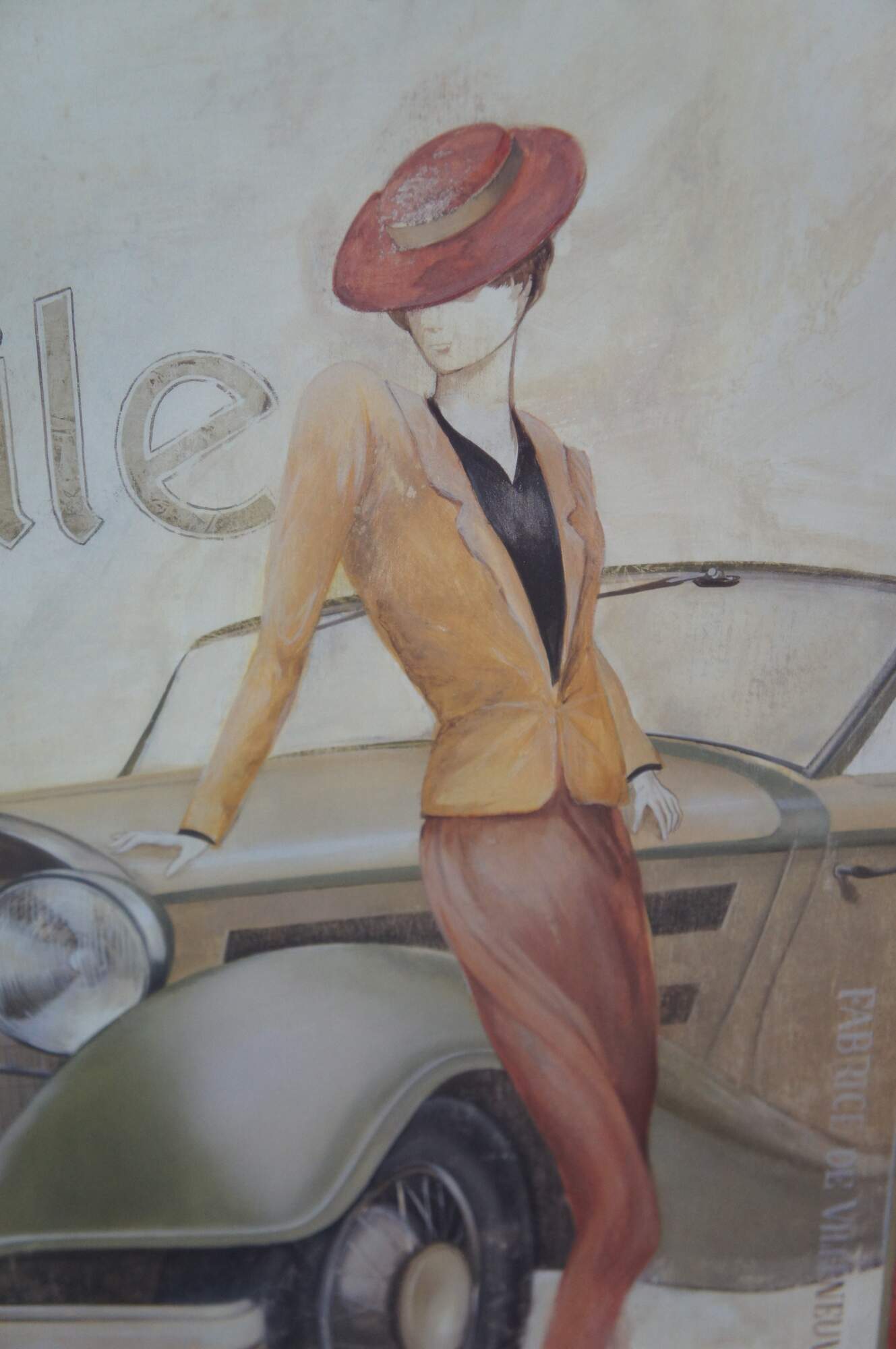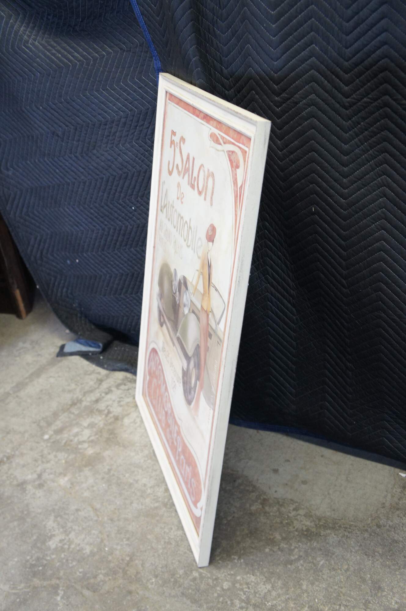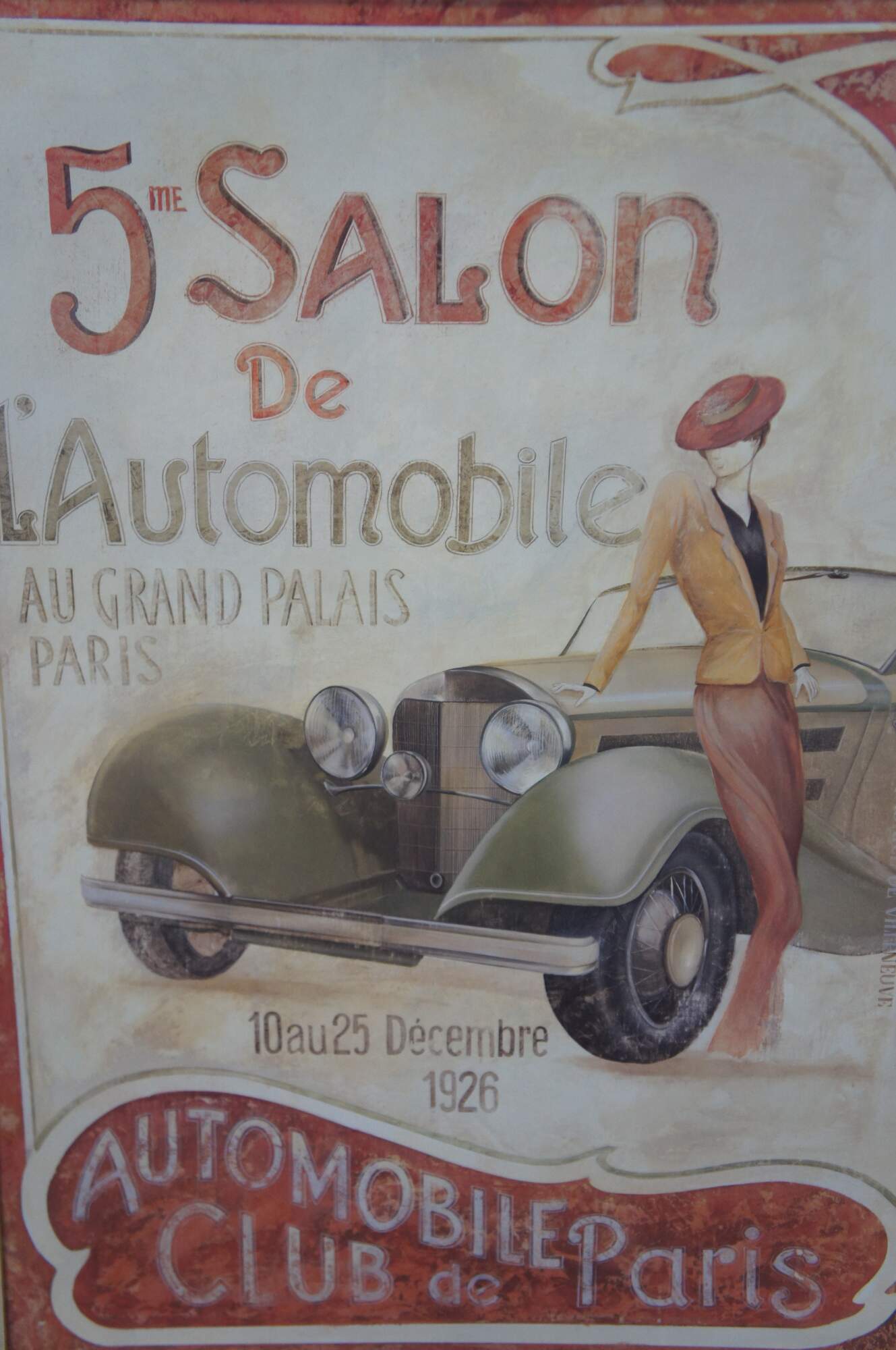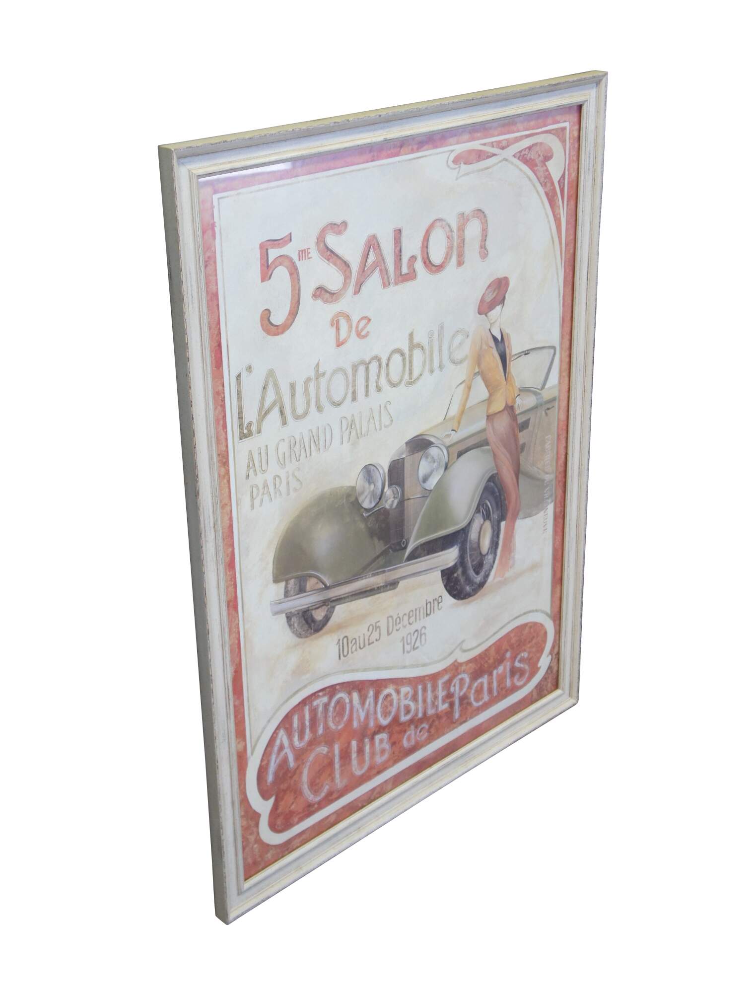 Vintage French Fabrice de Villeneuve framed car show poster print featuring a Victorian Art Deco themed advertisement for the Automobile Club of Paris France in 1926. 5 Me Salon De L'Automobile Au Grand Palais Paris, 10au25 December 1926.