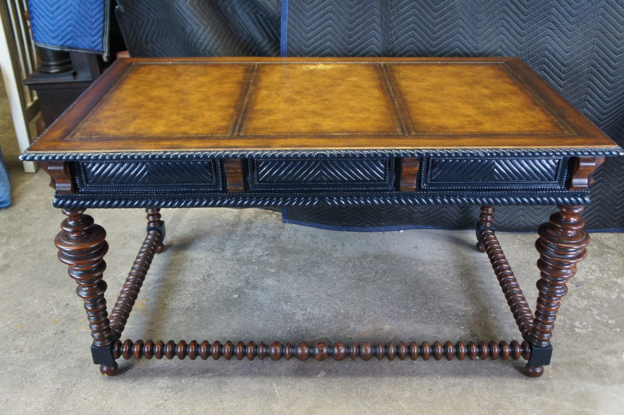 Vintage William & Mary style / Spanish / Colonial / Renaissance Revival library desk featuring a mahogany finish with ribbed and stacked design supporting a tooled leather top with three frieze drawers.
