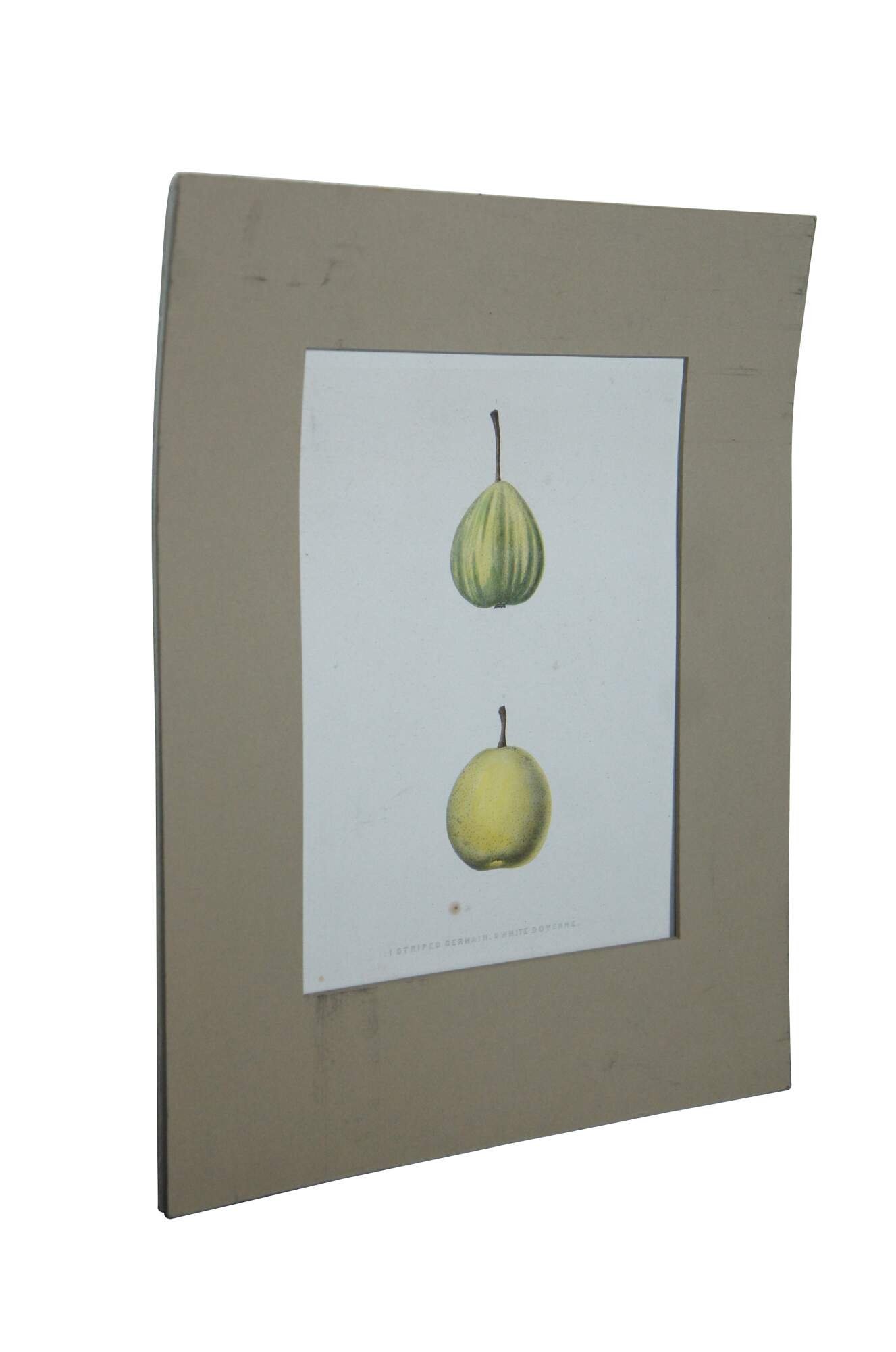 Antique Victorian ear circa 1851 colored botanical engraving / print depicting 1) Striped Germain and 2) White Doyenne pears. Drawn by Joseph Prestele. Engraved and Printed by J.I. and R.H. Pease. Matted in beige; un-framed.