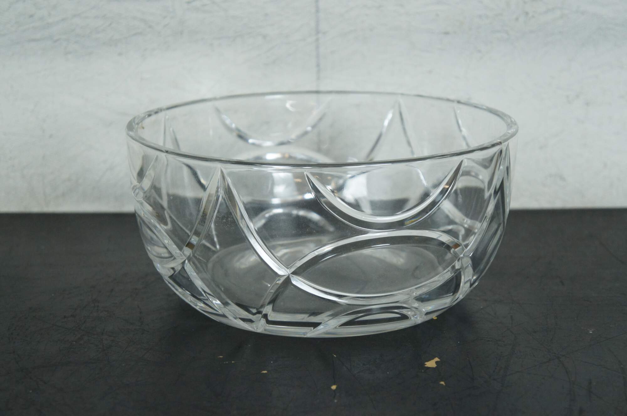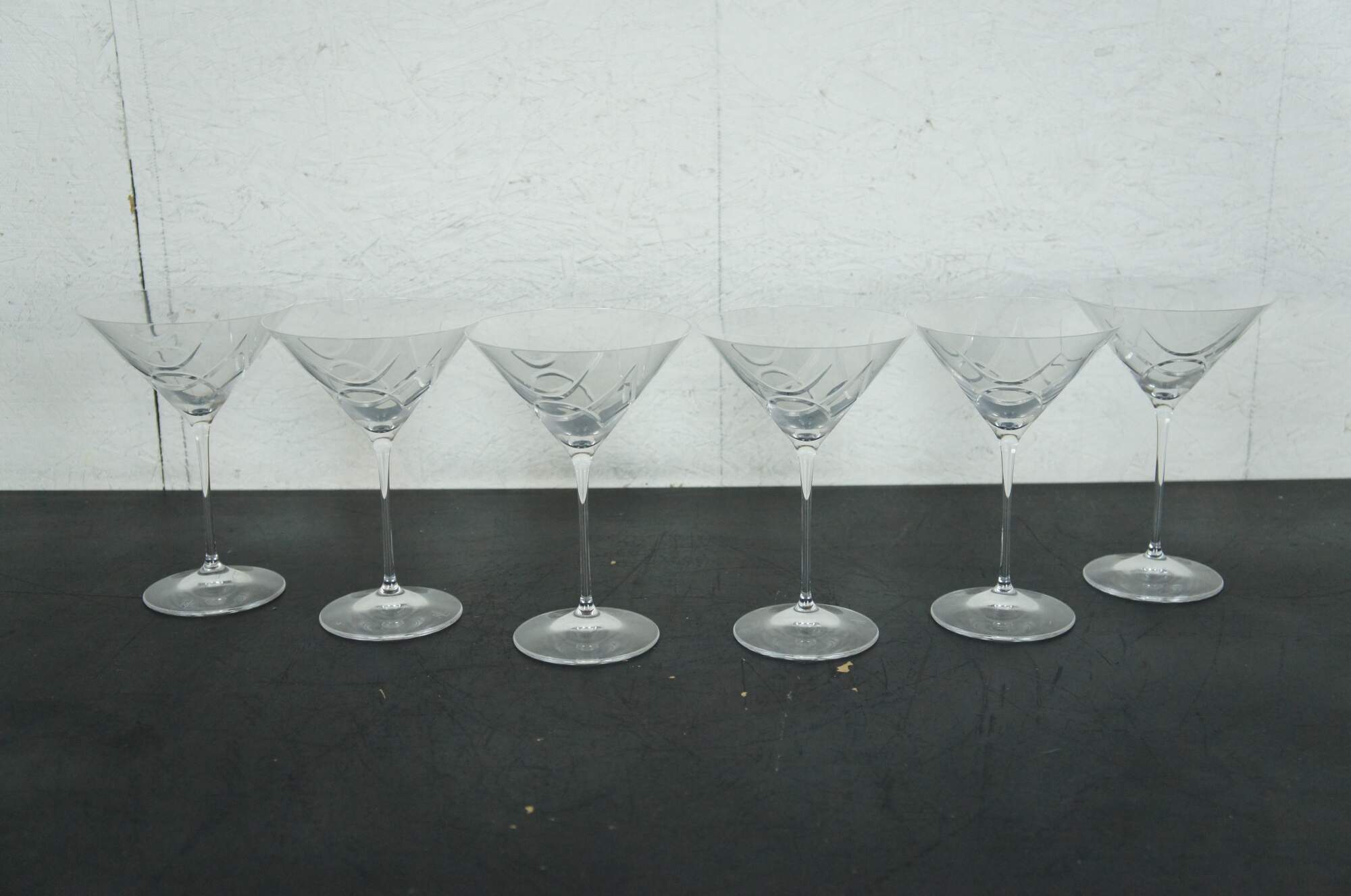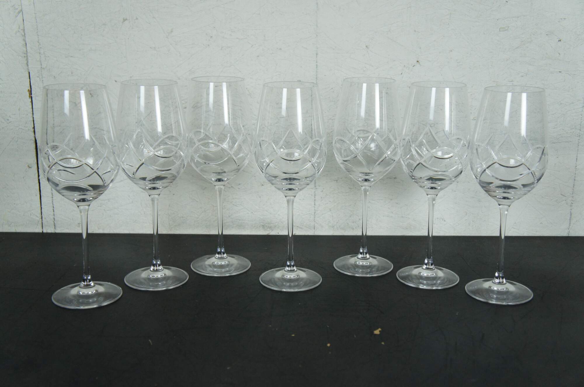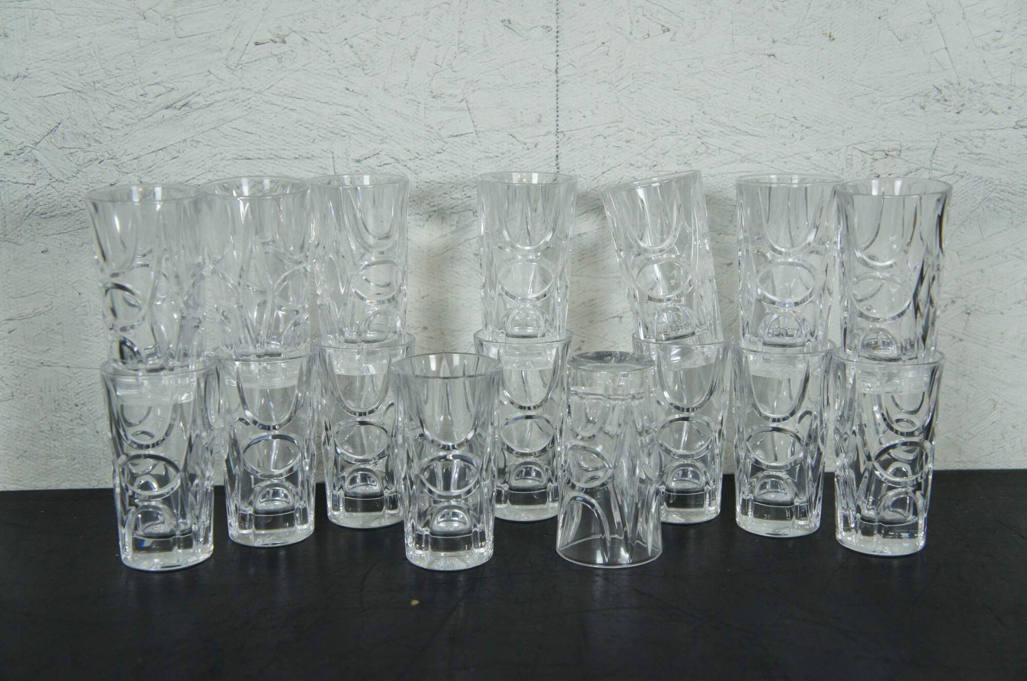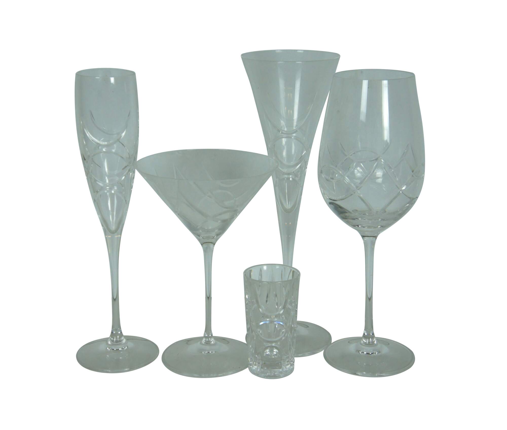 Late 20th century 46 piece lot of Ralph Lauren cut crystal barware / glassware in the Royalton pattern. Lot includes: whiskey decanter with stopper, vase, round bowl, 16 shot glasses, 7 wine glasses, 7 trumpet champagne flutes, 7 standard champagne flutes, and 6 martini glasses. Retired design. Marked on base.