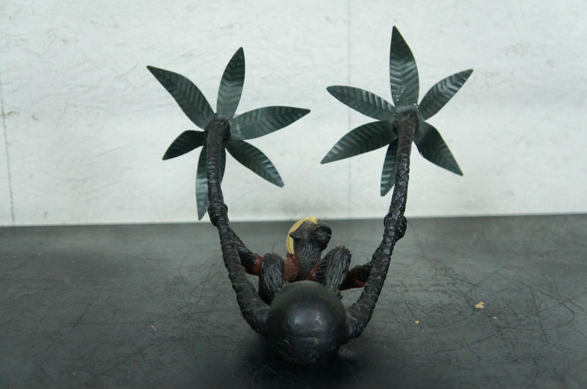 Vintage cast metal wall hanging sconce, featuring a monkey wearing a red jacket and yellow hat, perched on a ball between a pair of palm trees, the tops of which hold a single taper candle.