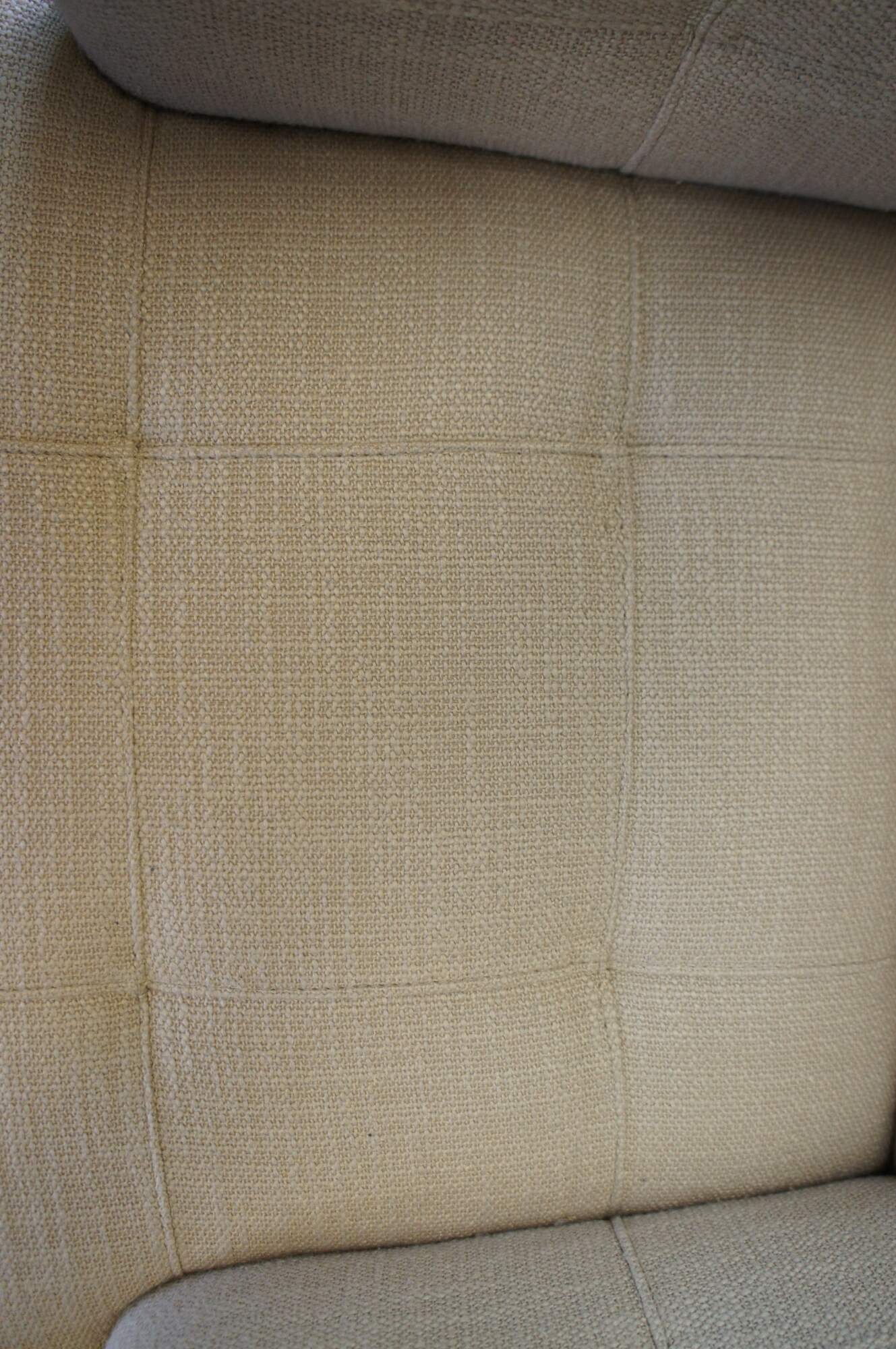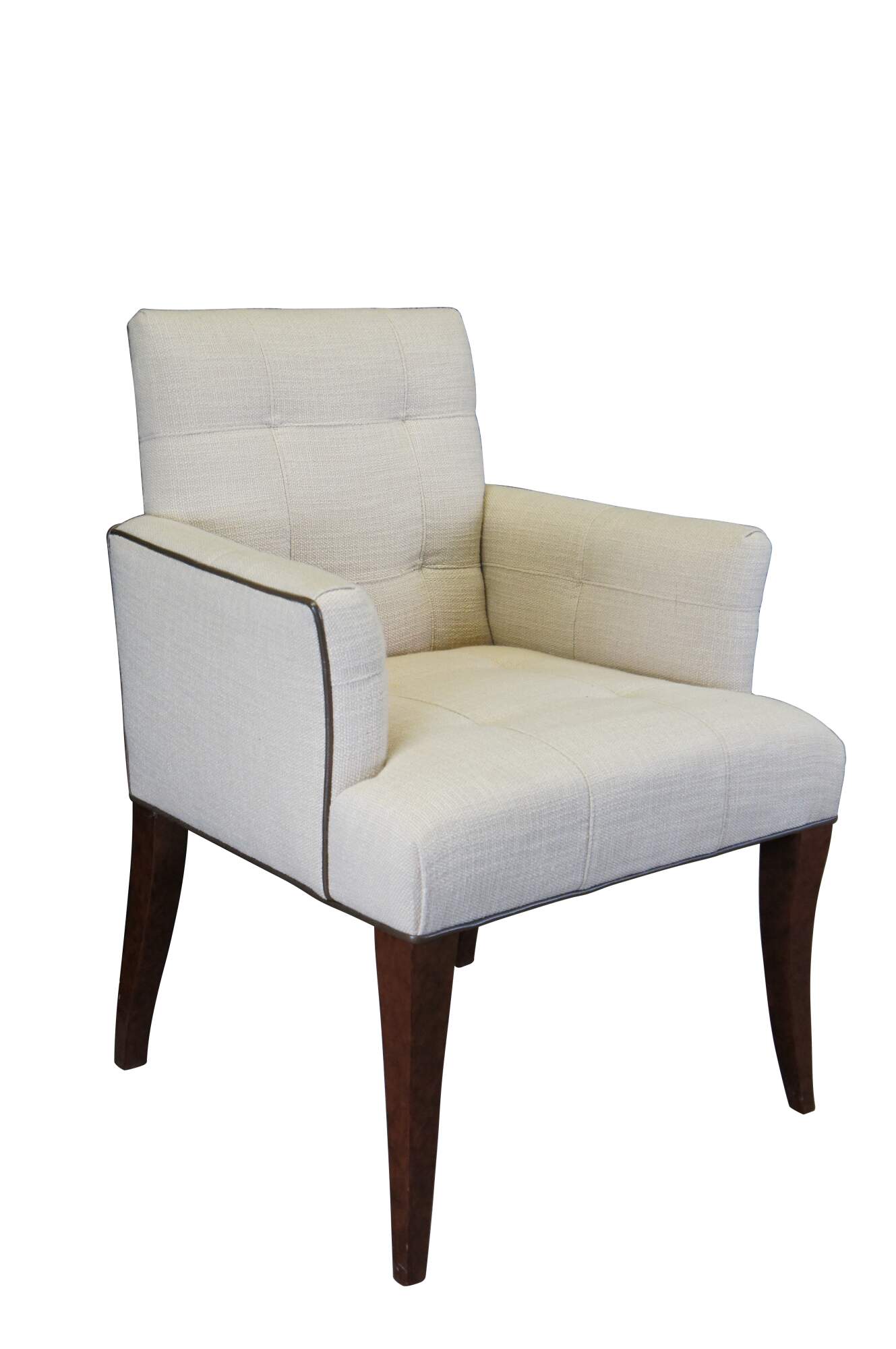 Set of four vintage Jessica Charles for Hickory Chair Co Mann half arm dining chairs featuring a slightly faired form with tufted upholstery, half arms and tapered legs.