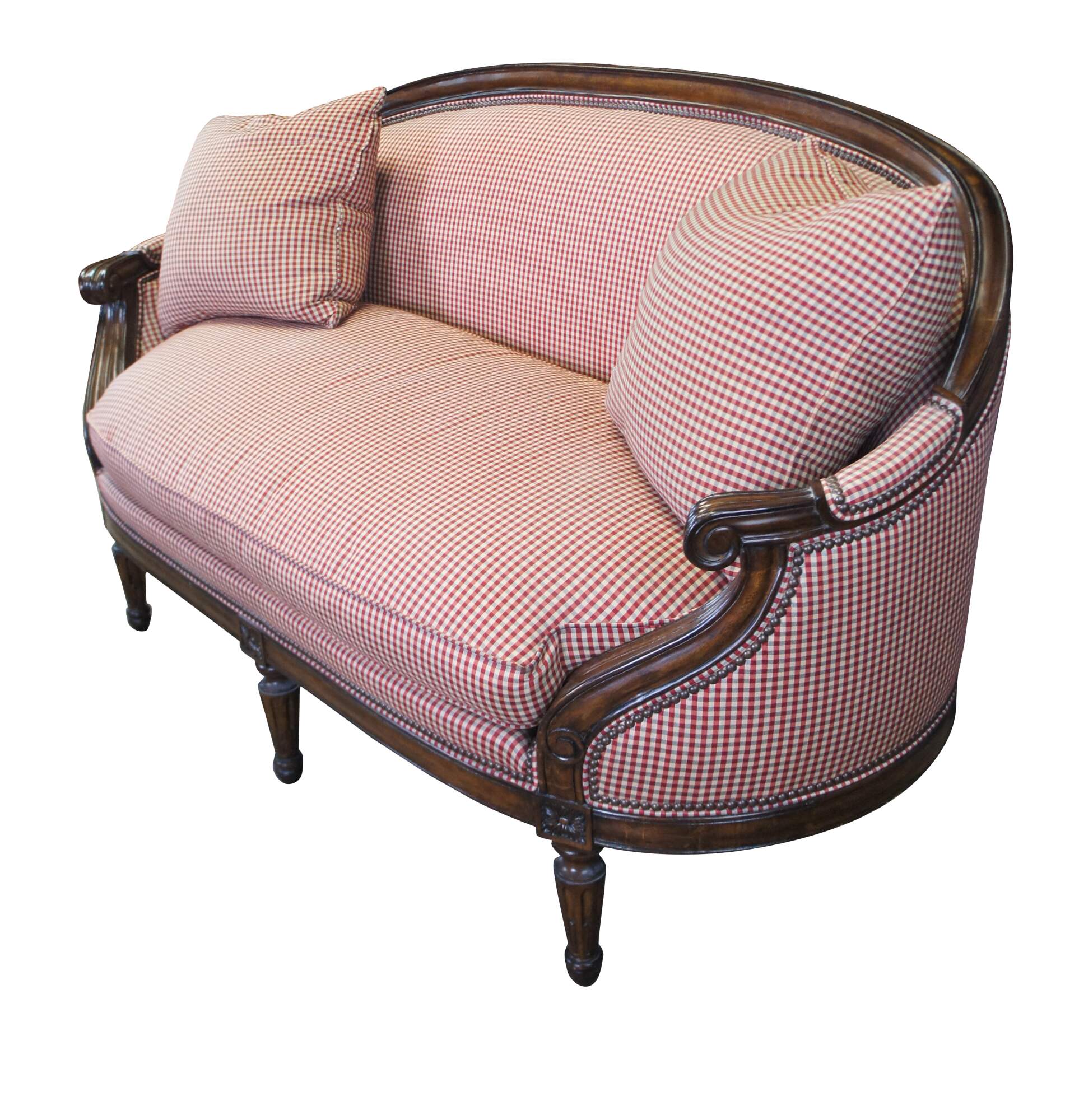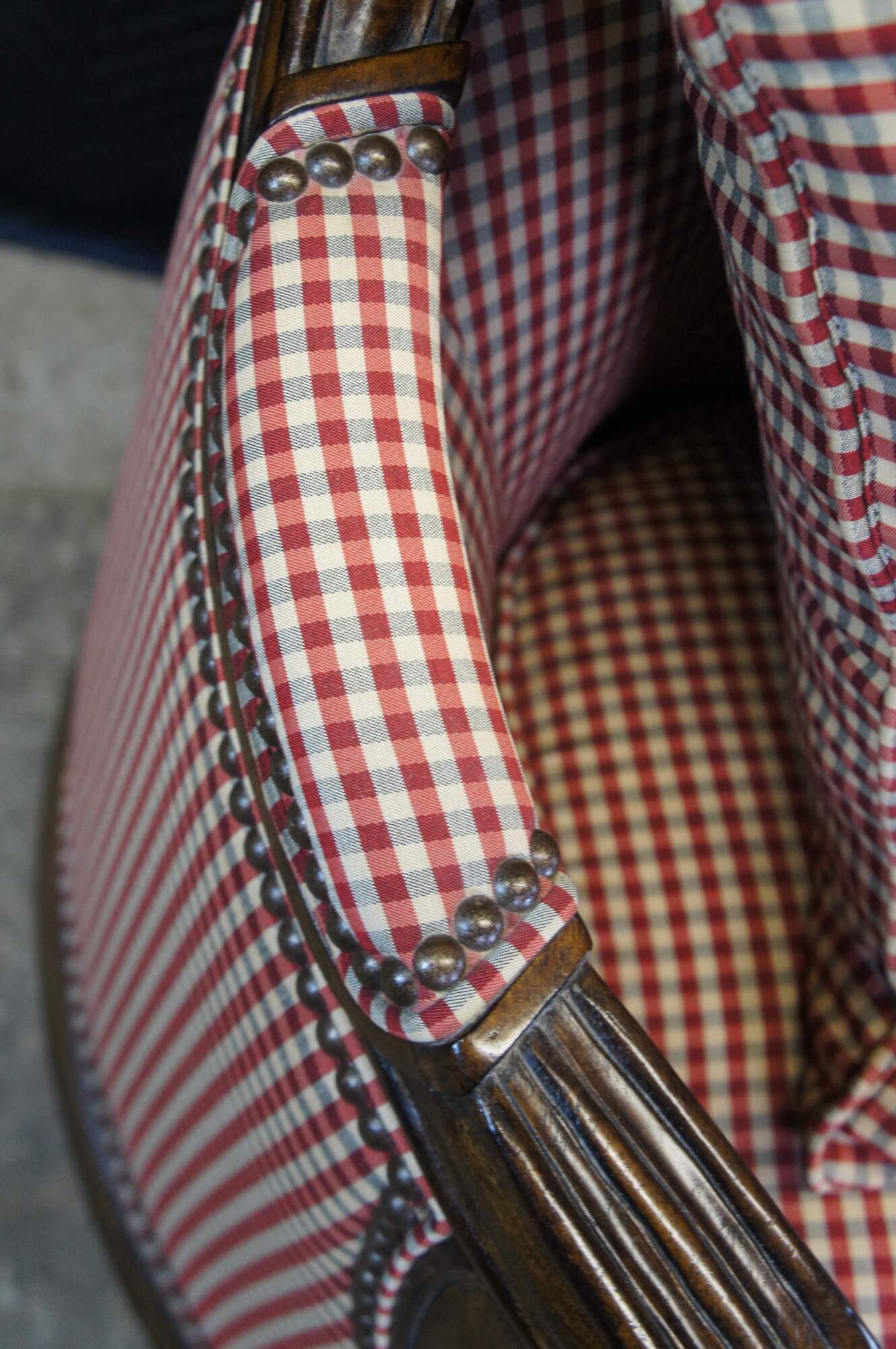 Vintage Hickory Chair company Park Avenue parlor settee / love seat / bench. Made of mahogany featuring round form with padded arm, red plaid upholstery, nailhead trim, floral carved accents and tapered fluted legs.