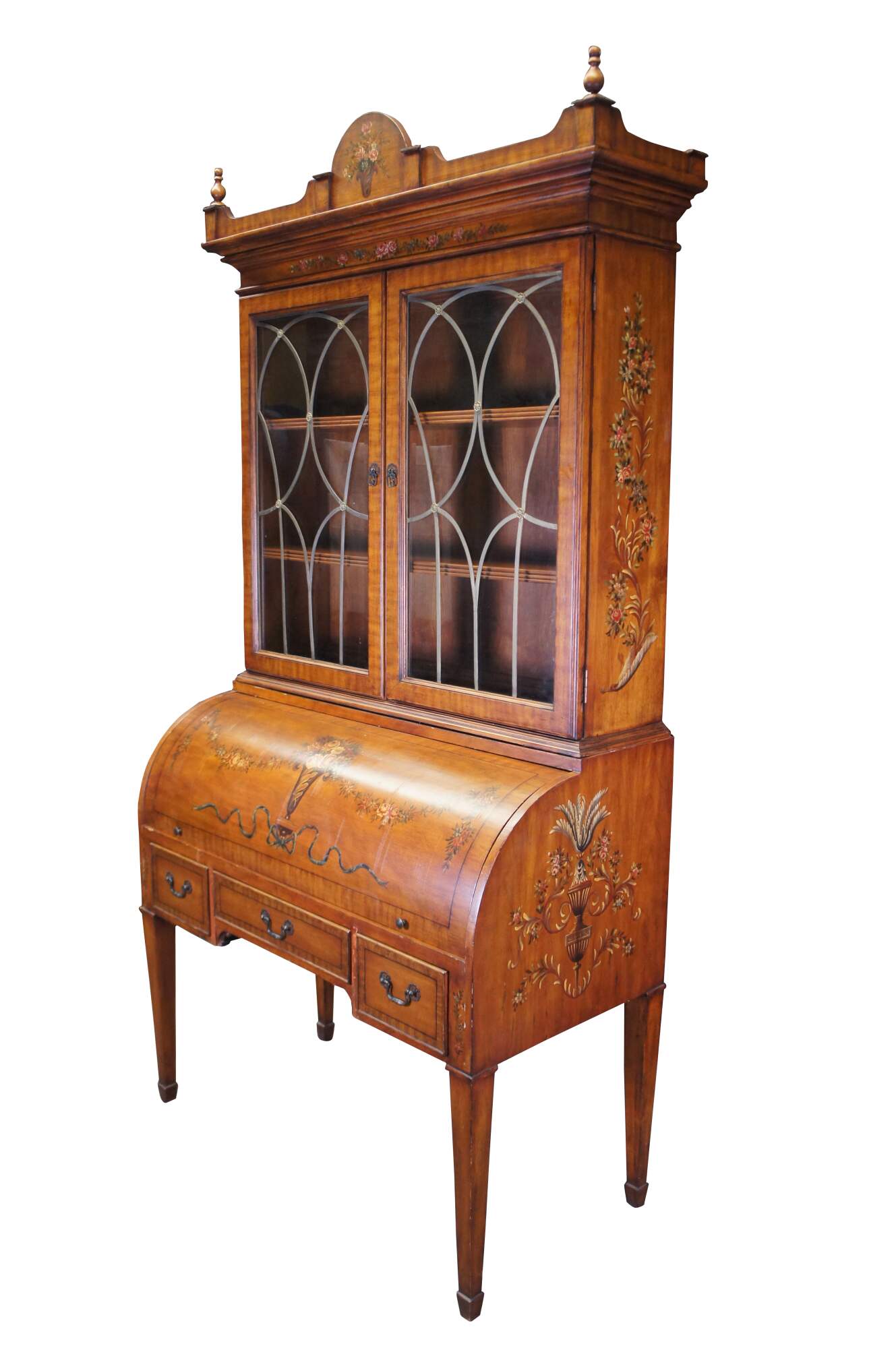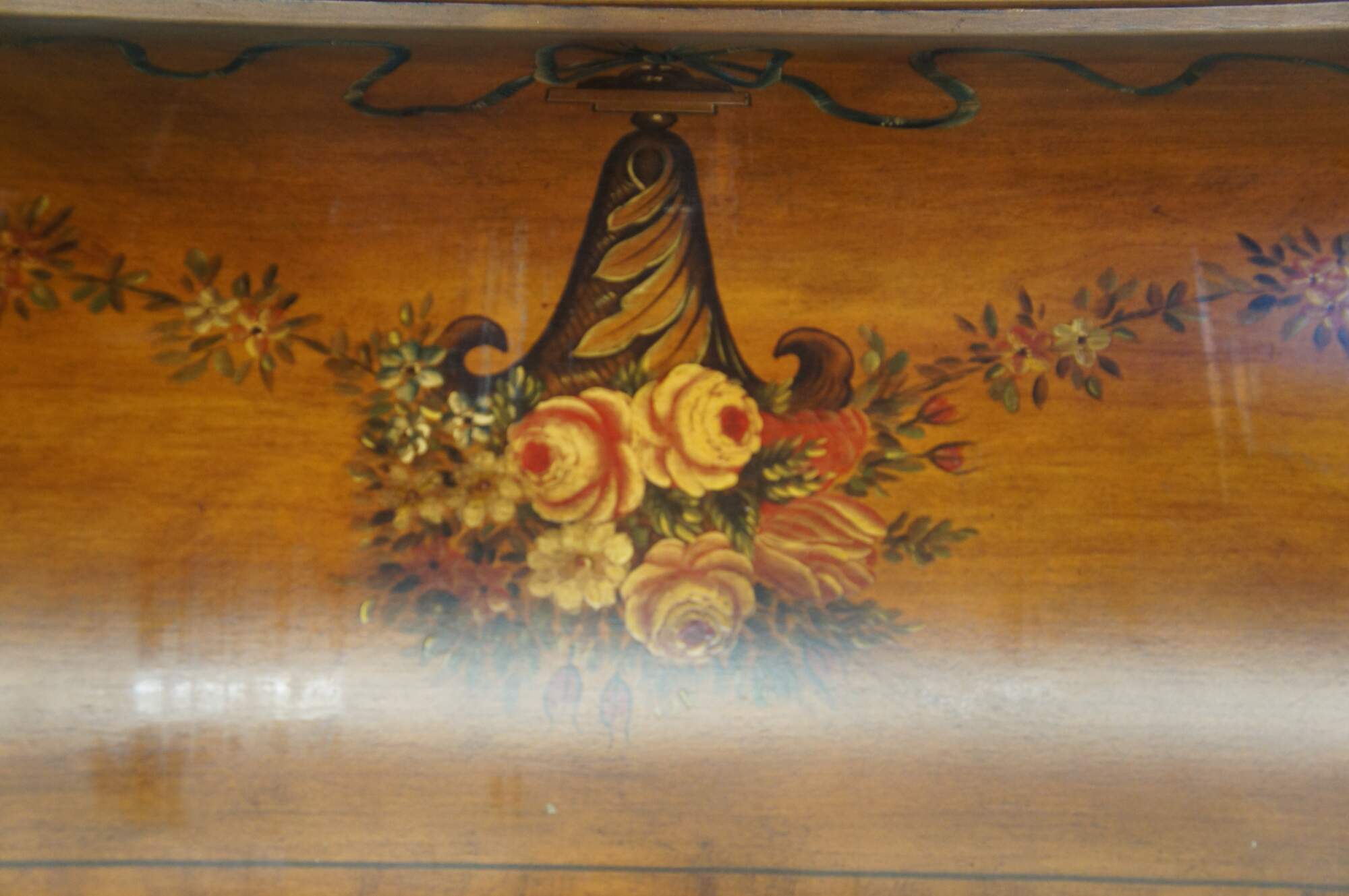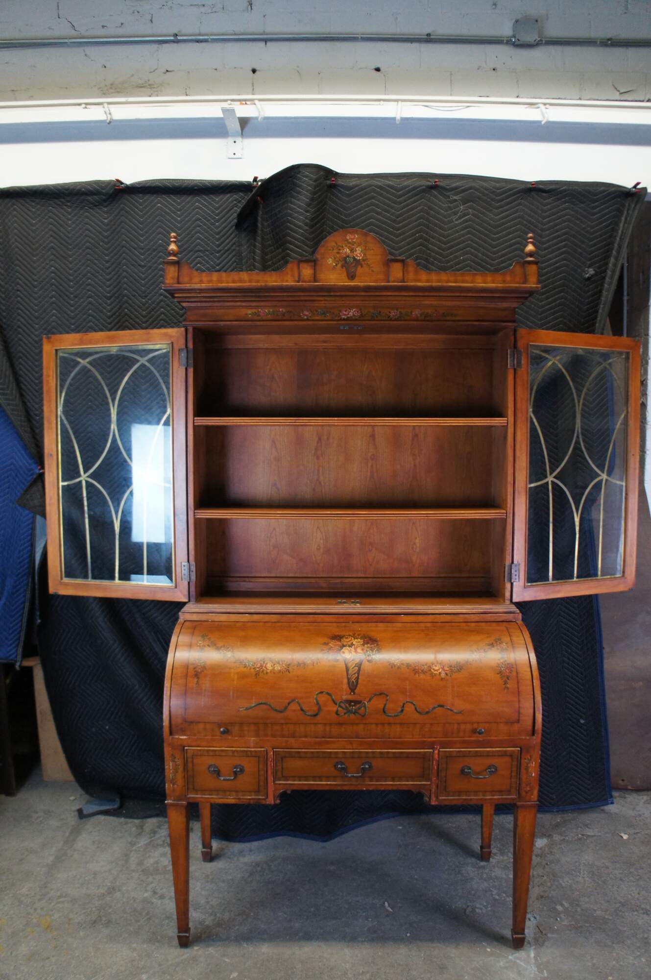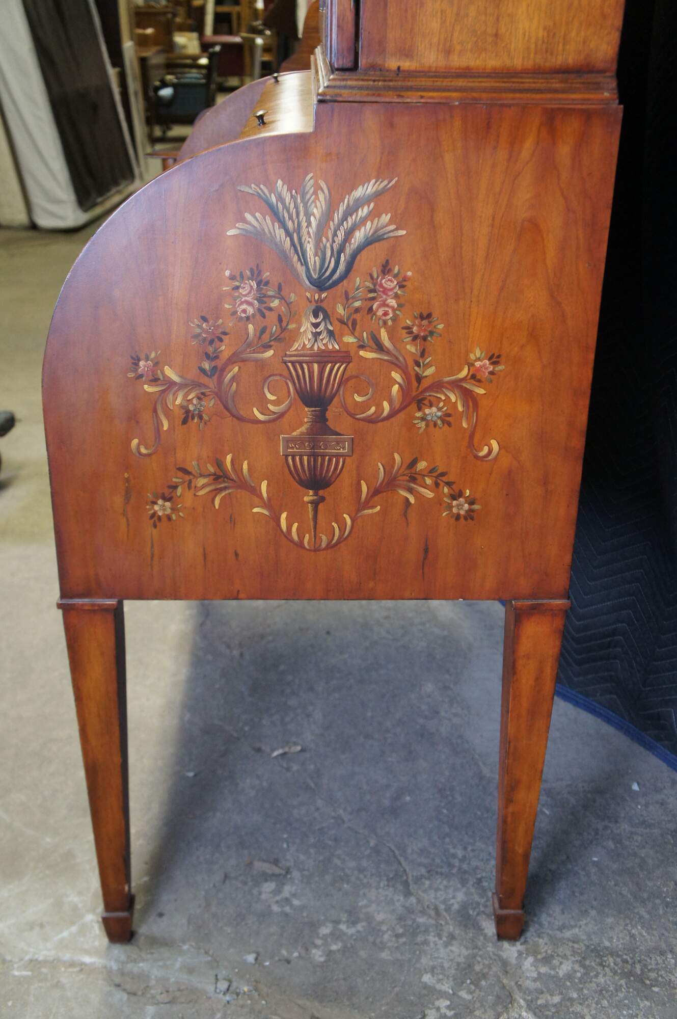 A very large and impressive vintage Adams style half cylinder secretary desk / hutch featuring a mahogany finish with upper bookcase curio cabinet with fretwork doors supported by a lower secretary desk that opens to tooled leather writing surface with multiple drawers and cubbies. The secretary features a painted Neoclassical floral theme with scrolled flower bouquets, acanthus leaves, ribbons and trophy urns.