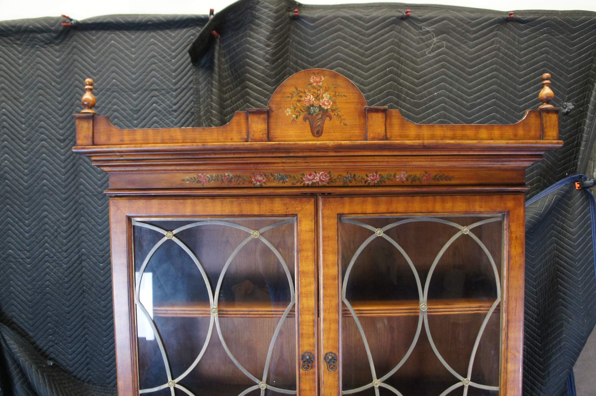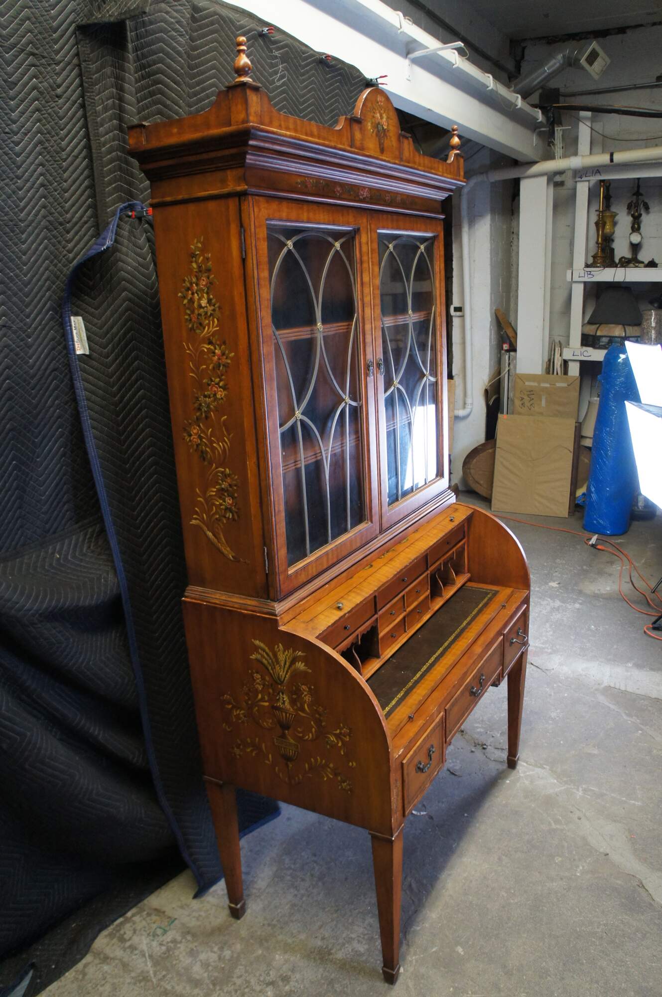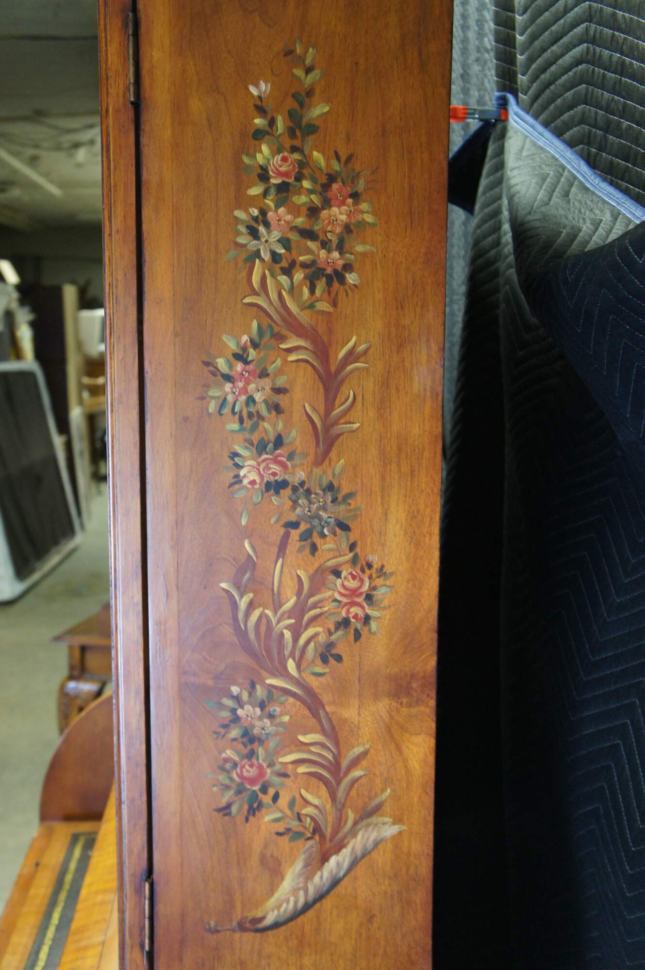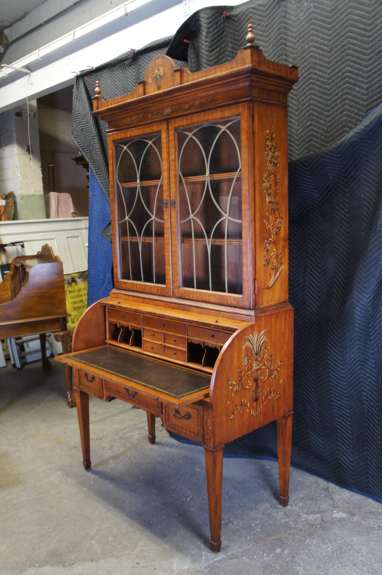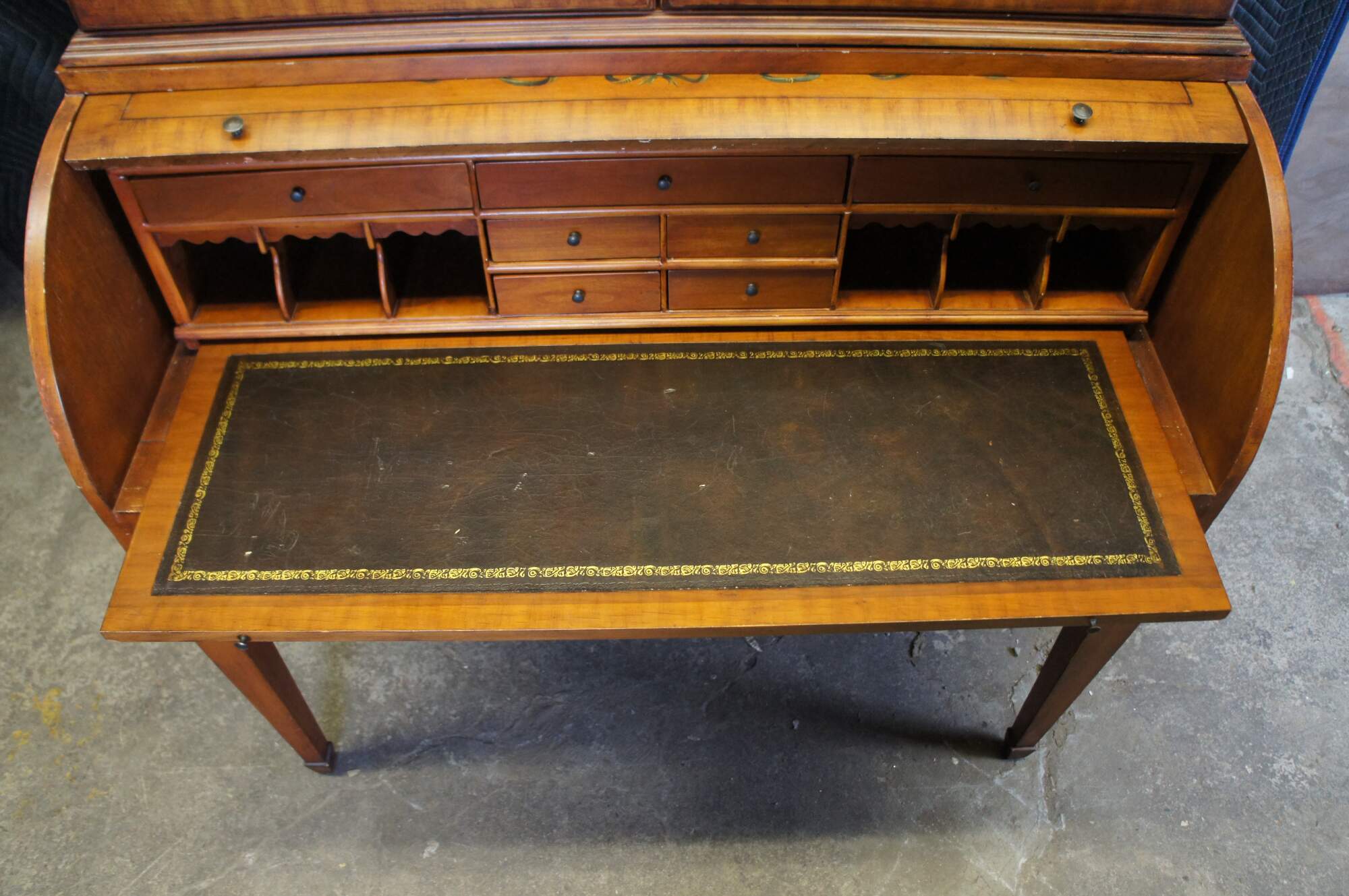 A very large and impressive vintage Adams style half cylinder secretary desk / hutch featuring a mahogany finish with upper bookcase curio cabinet with fretwork doors supported by a lower secretary desk that opens to tooled leather writing surface with multiple drawers and cubbies. The secretary features a painted Neoclassical floral theme with scrolled flower bouquets, acanthus leaves, ribbons and trophy urns.
