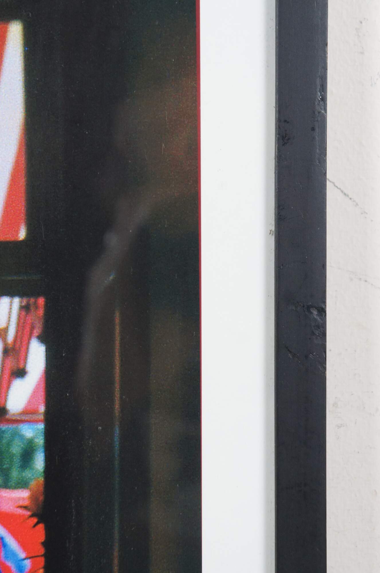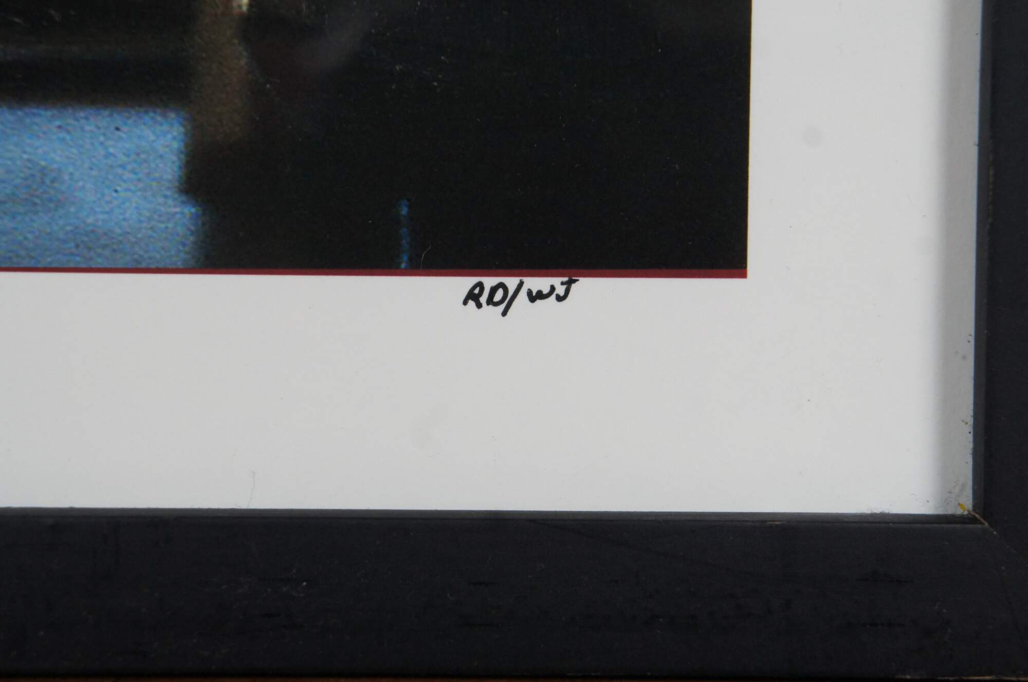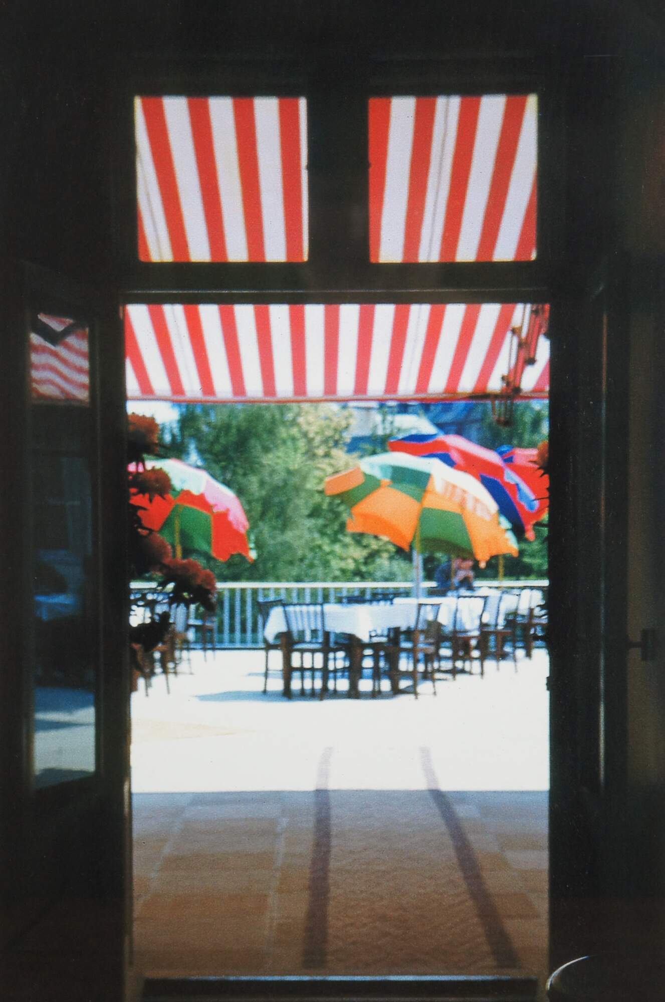 Late 20th century color photograhic art print, showing a view shot a doorway of a sunny pool patio in the summertime with tables, chairs, bright umbrellas under a red and white striped awning. Signed RD/WJ in lower right corner. Black painted frame. Attributed to Dayton Country Club.