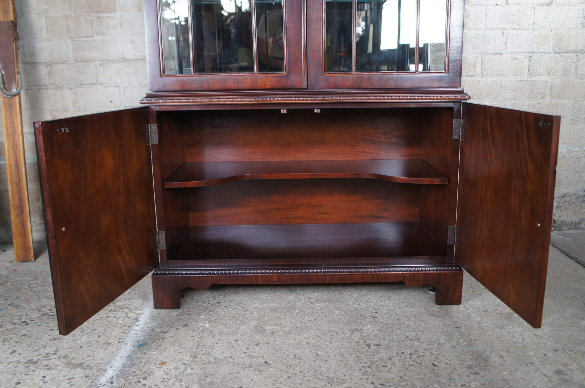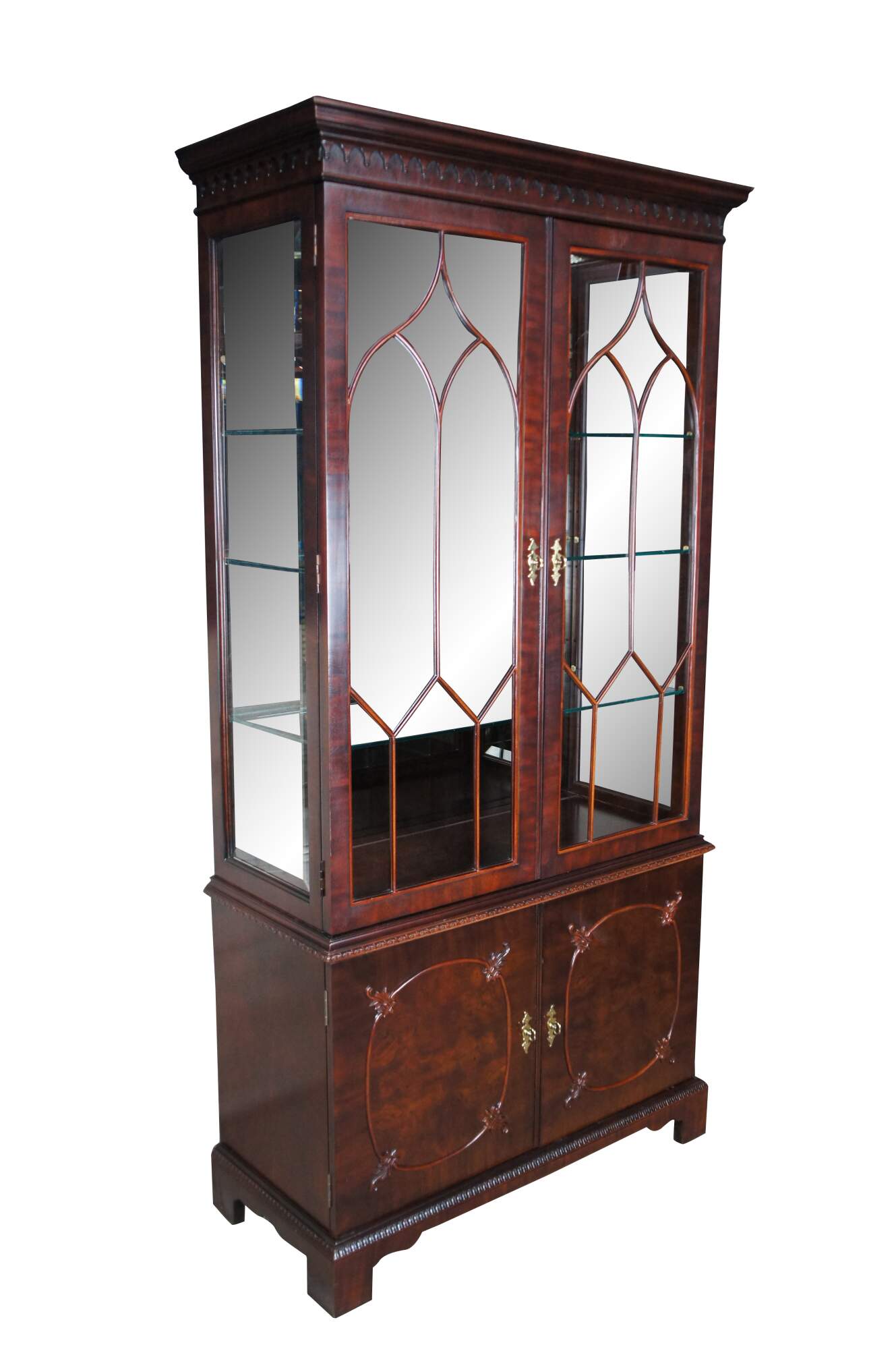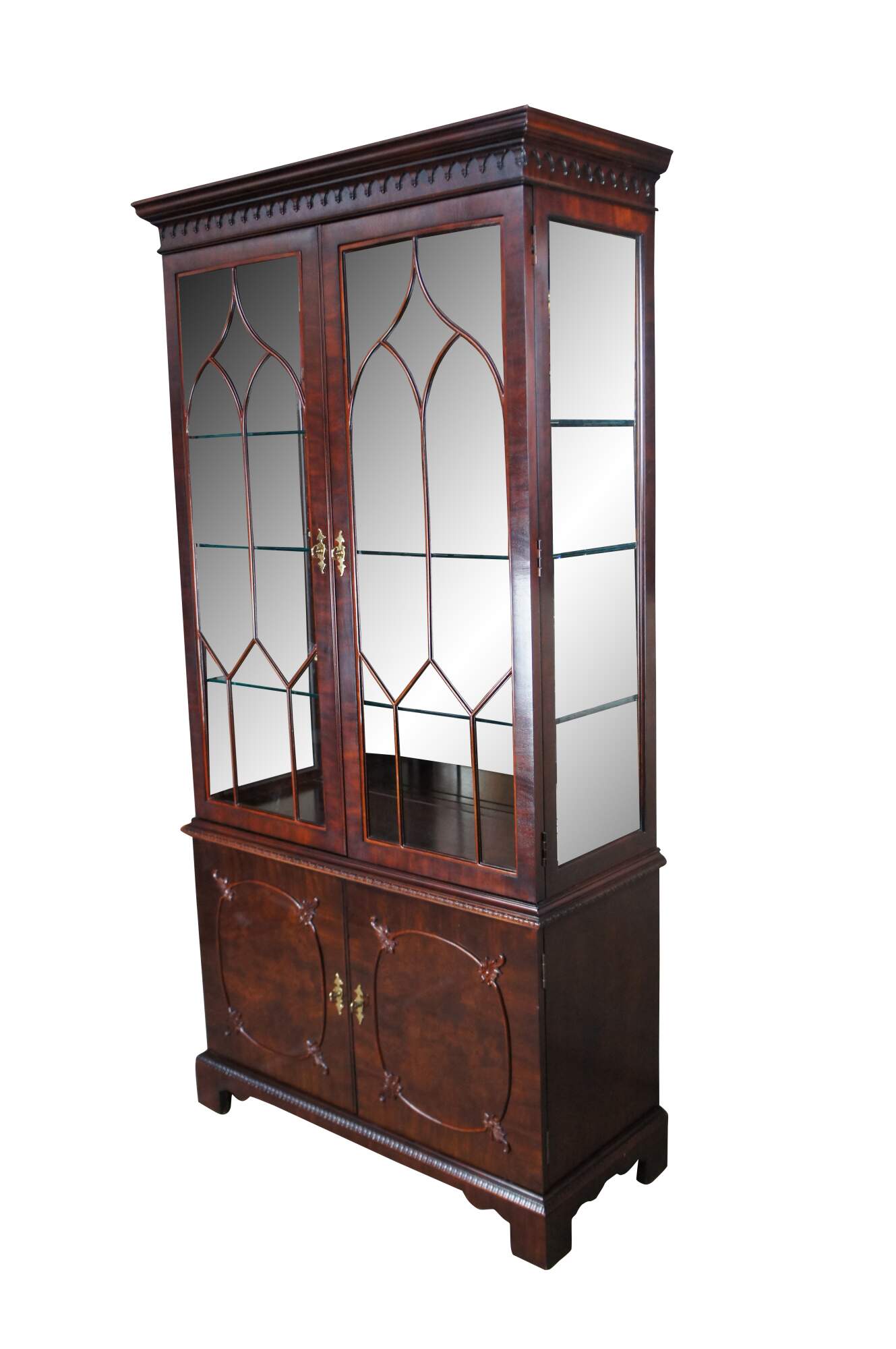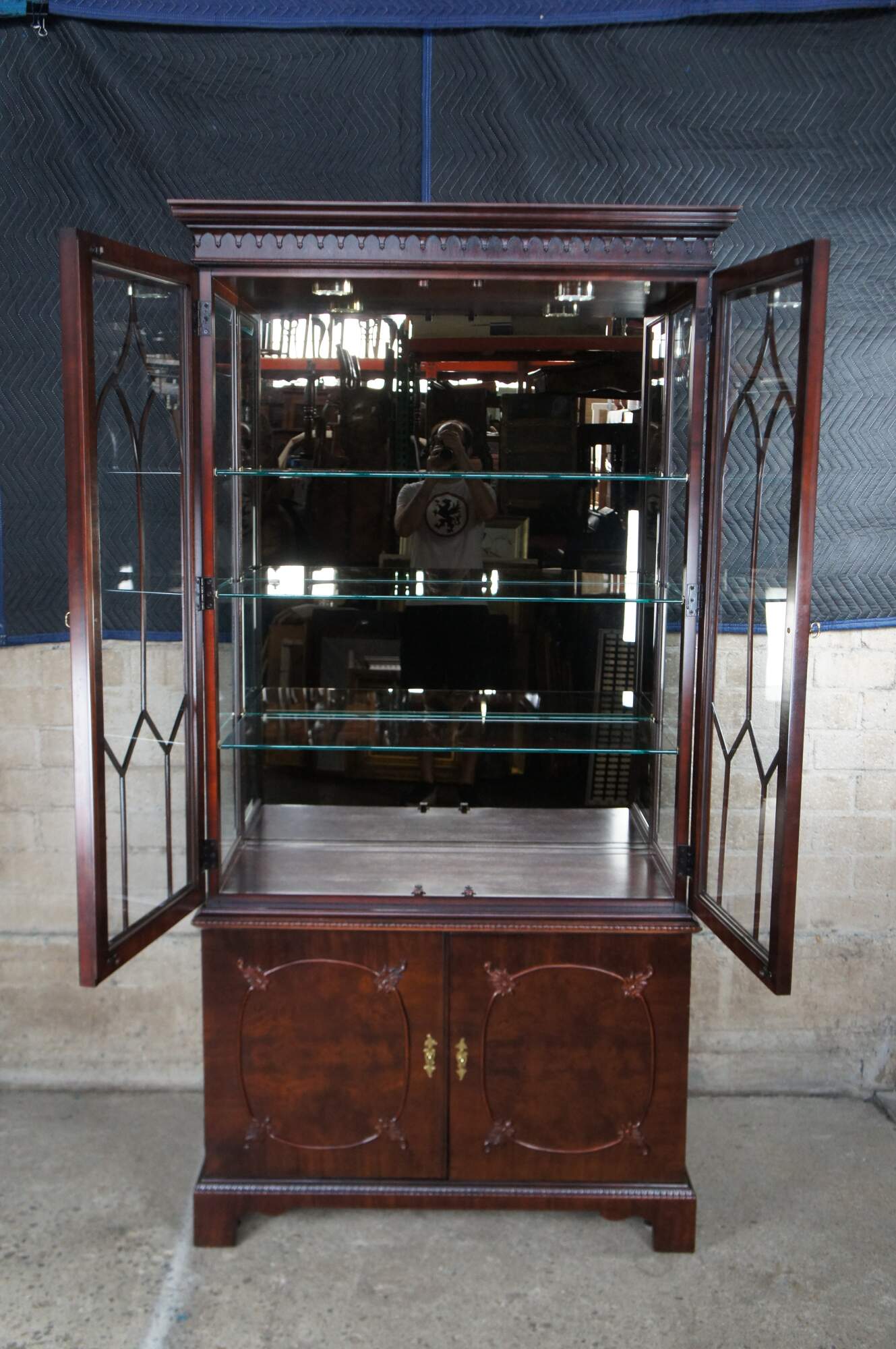 Vintage Century Furniture Claridge Collection crotch mahogany china curio cabinet / display case. Made of mahogany featuring fretwork doors, illuminated display shelves with plate groove, and lower cabinet with paneled design supported by bracket feet.