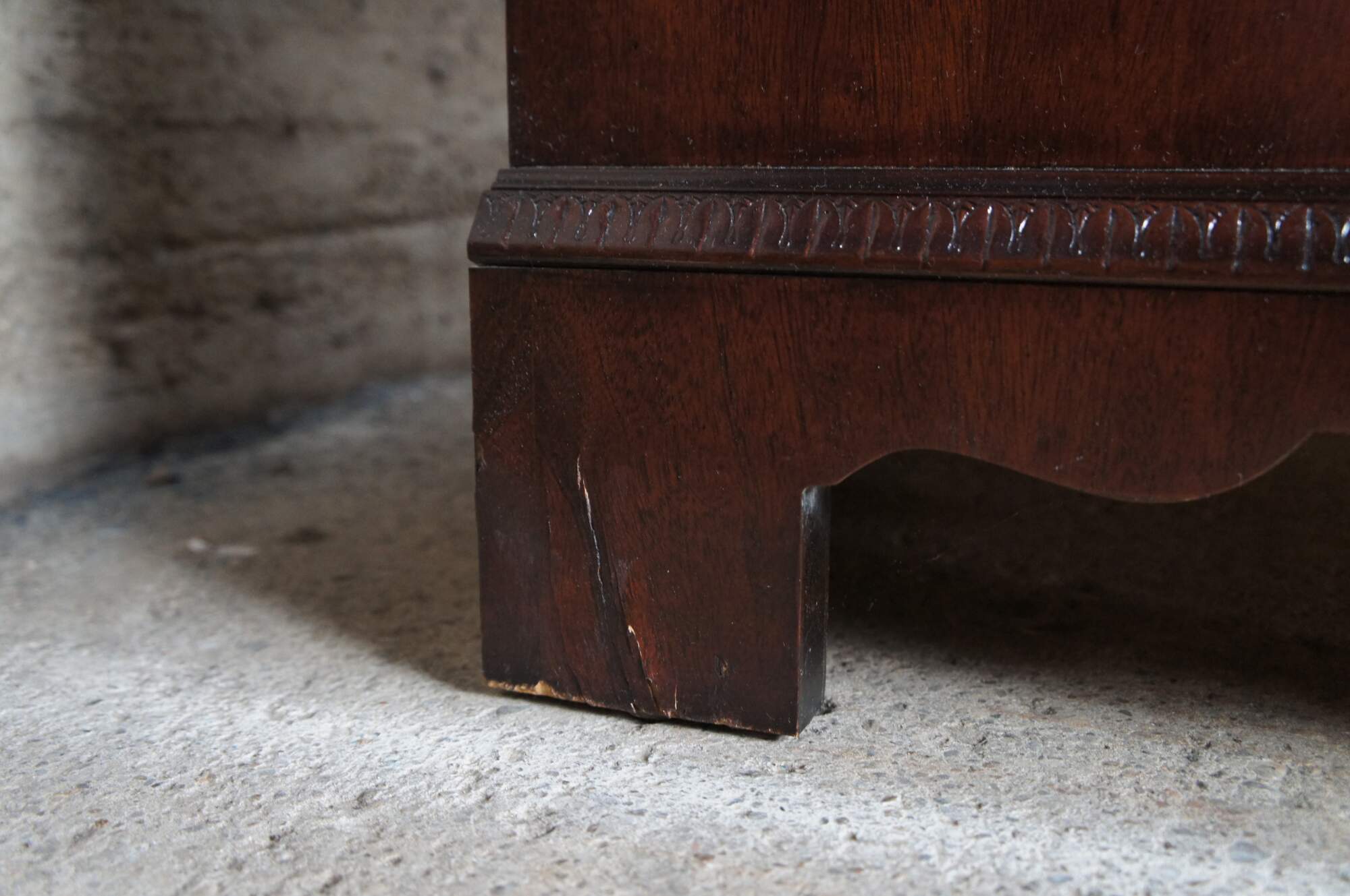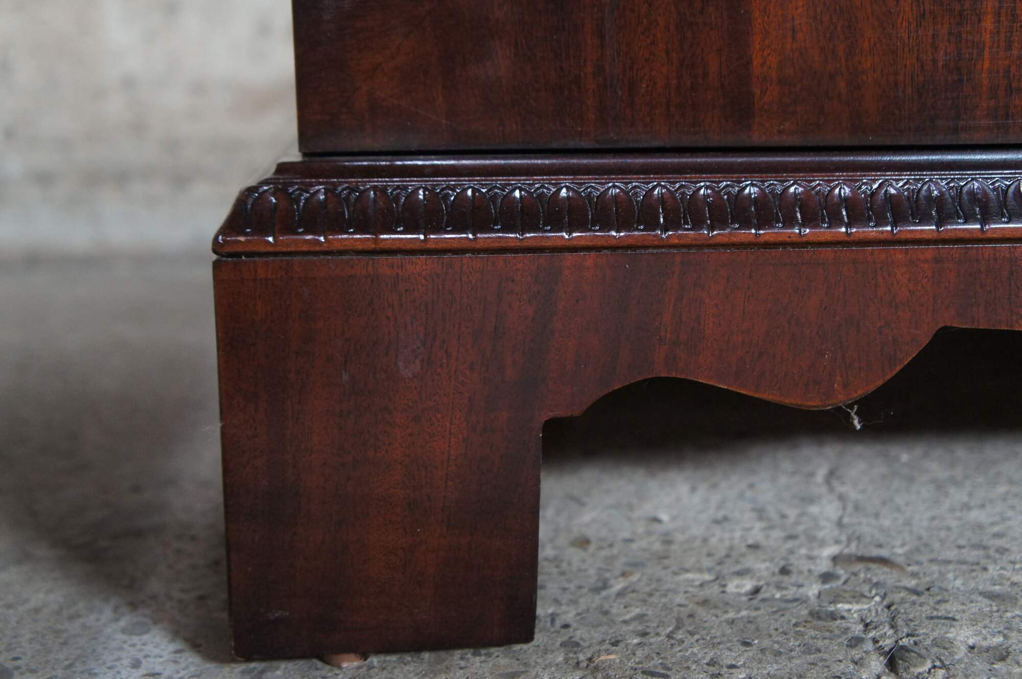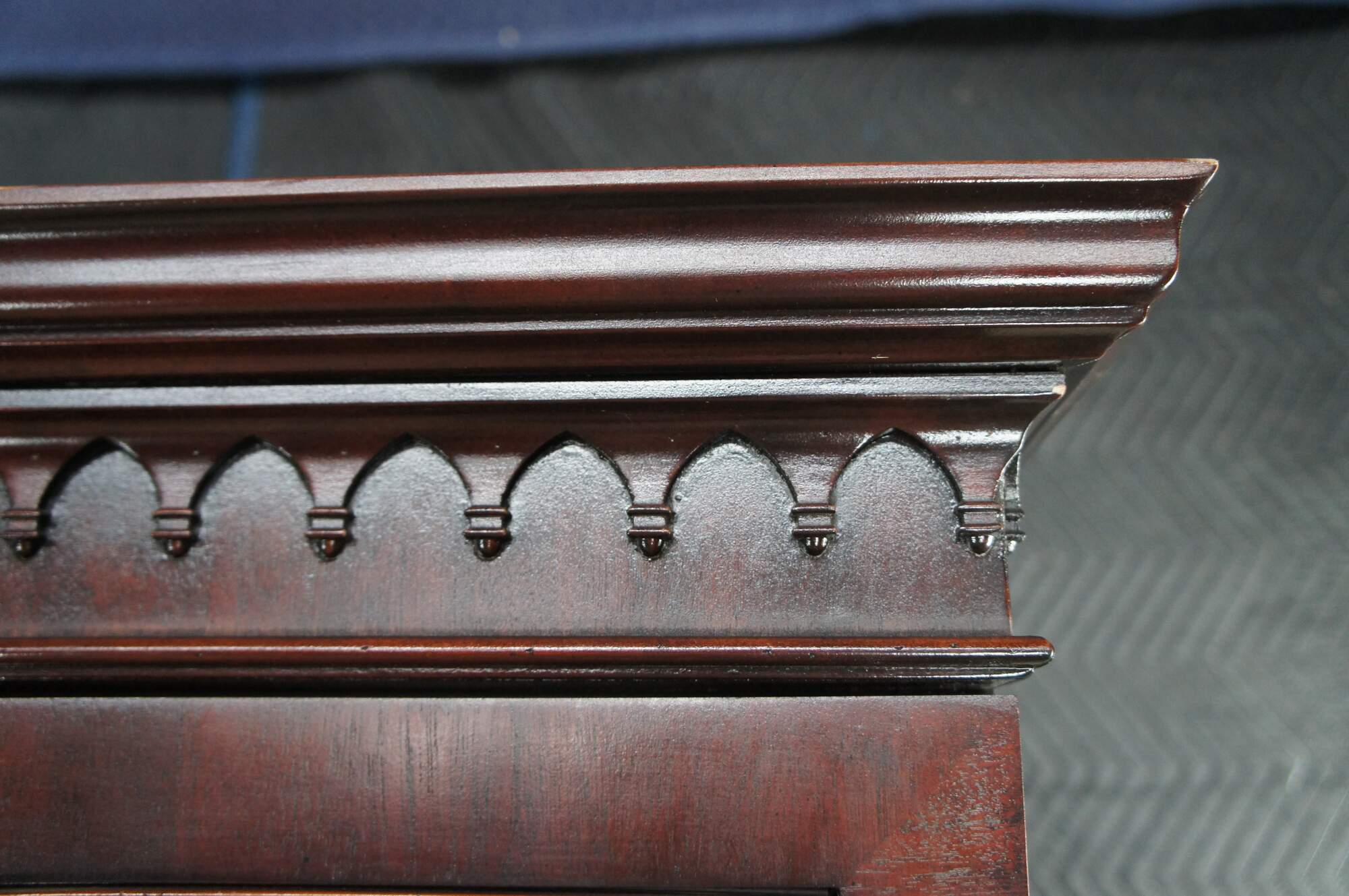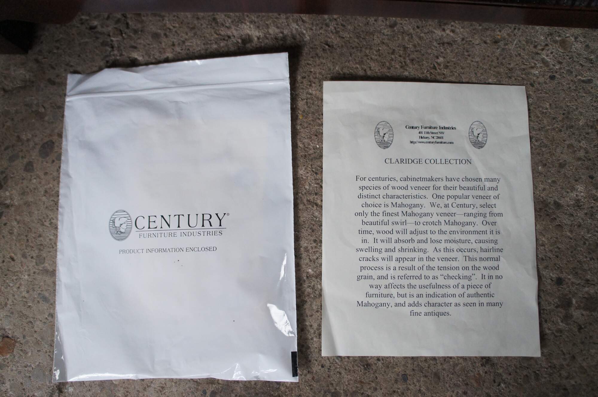 Vintage Century Furniture Claridge Collection crotch mahogany china curio cabinet / display case. Made of mahogany featuring fretwork doors, illuminated display shelves with plate groove, and lower cabinet with paneled design supported by bracket feet.