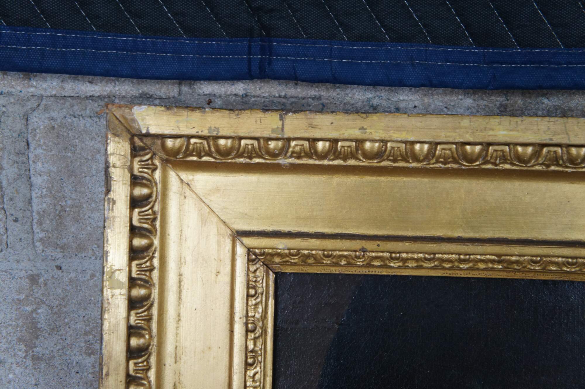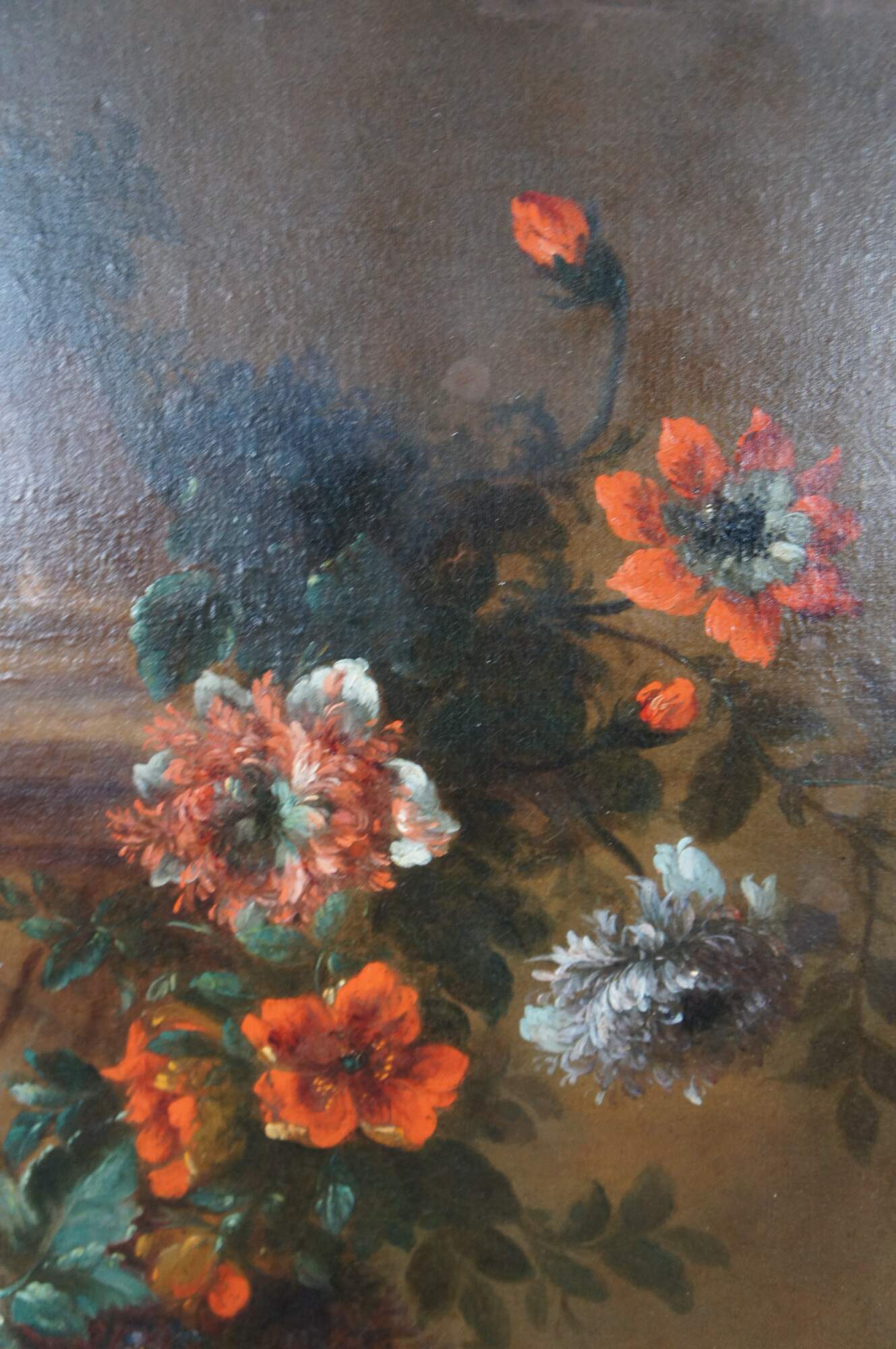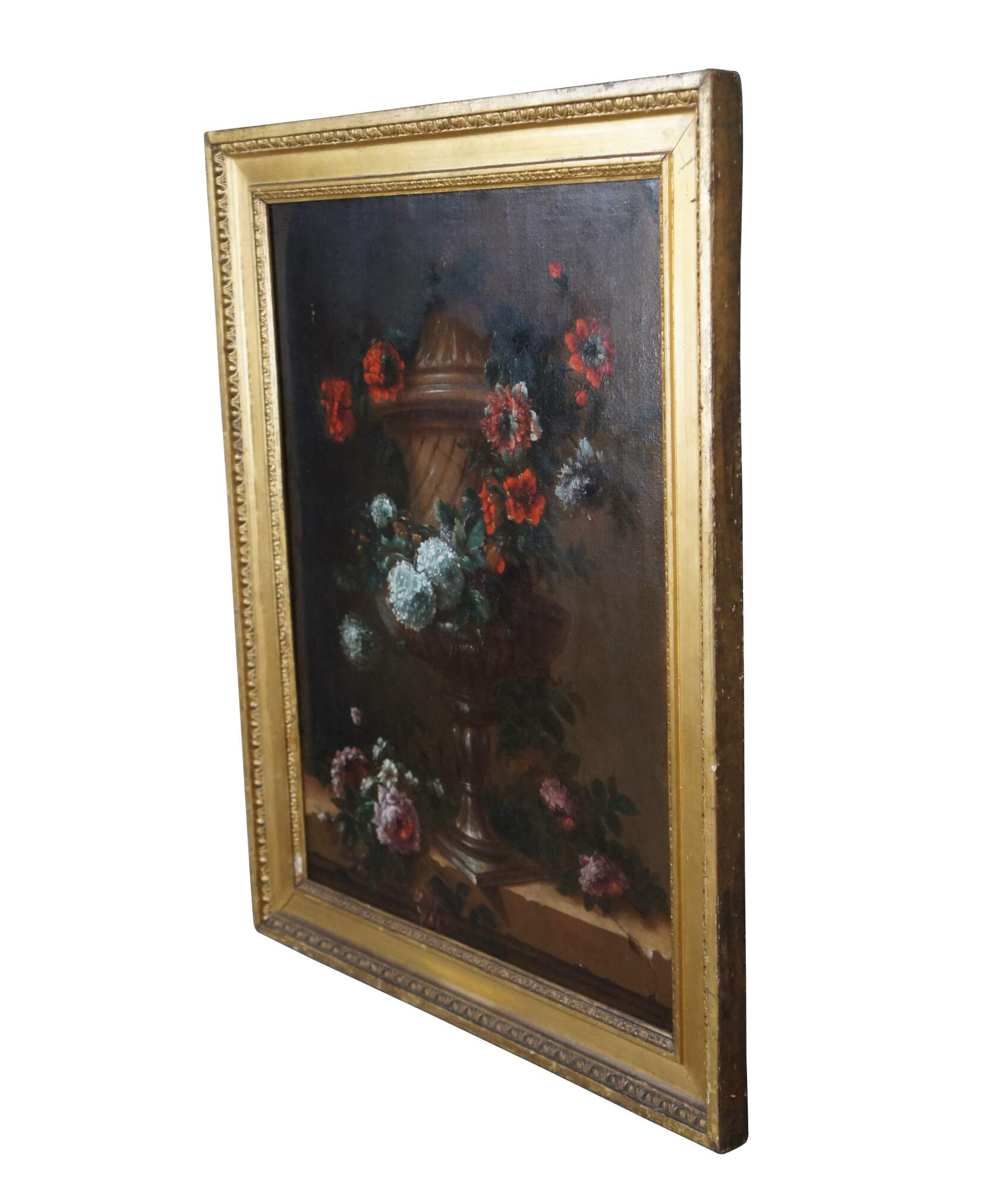 A large antique 19th Century still life featuring a Garland of Flowers surrounding a Grecian Vase. The piece is styled in the manner of a painting by Jean Baptiste Belin de Fontenay, aptly titled Vase Surrounded by a Garland of Flowers. The painting is on vanvas and framed in wood with a gold finish showcasing an egg and dart molding. The painting is unsigned.