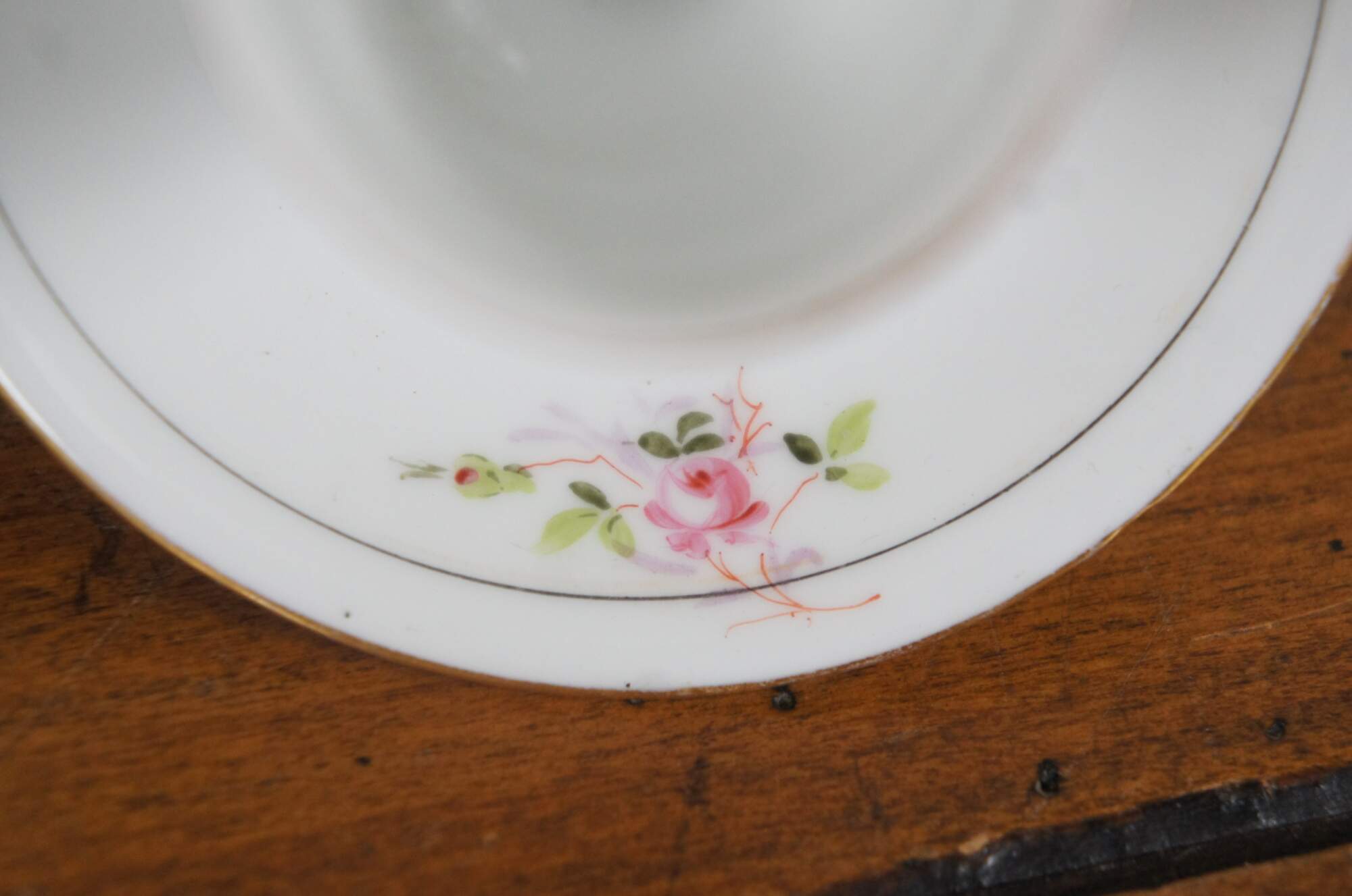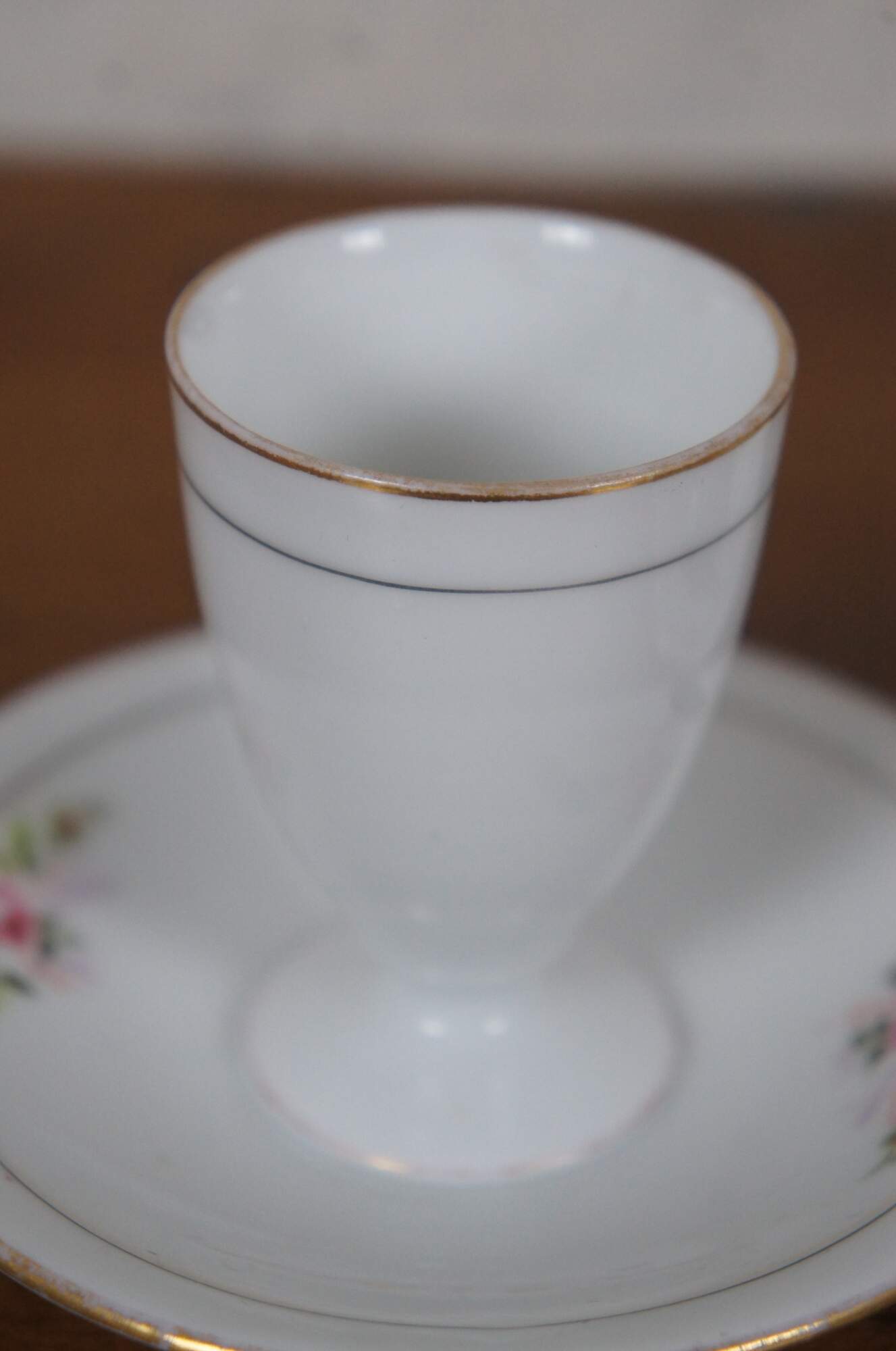 Pair of Fischer & Mieg / Pirkenhammer porcelain egg cups with attached underplate, hand painted with sprigs of pink roses and gilded accents. Mark used circa 1853-1873.