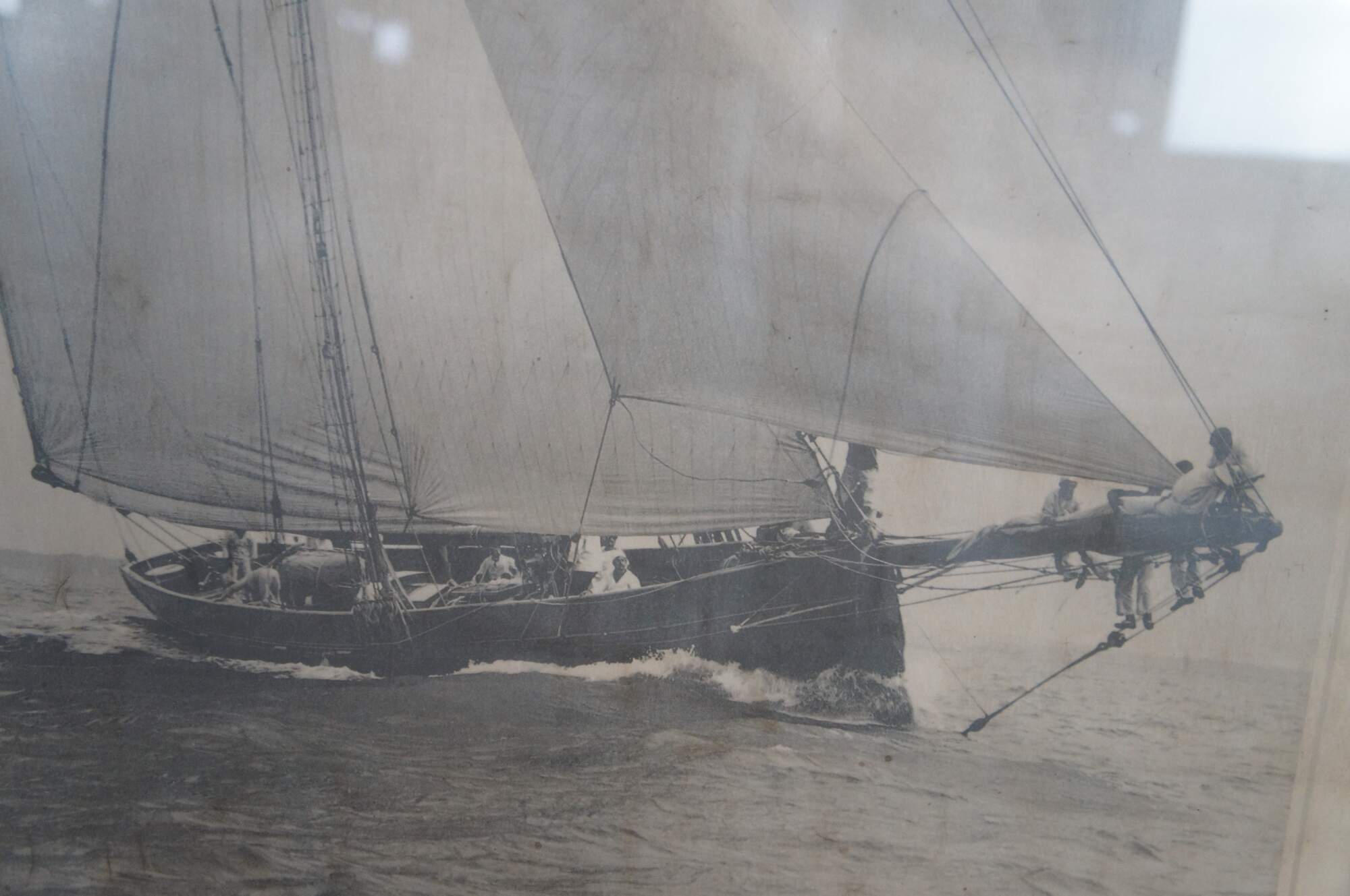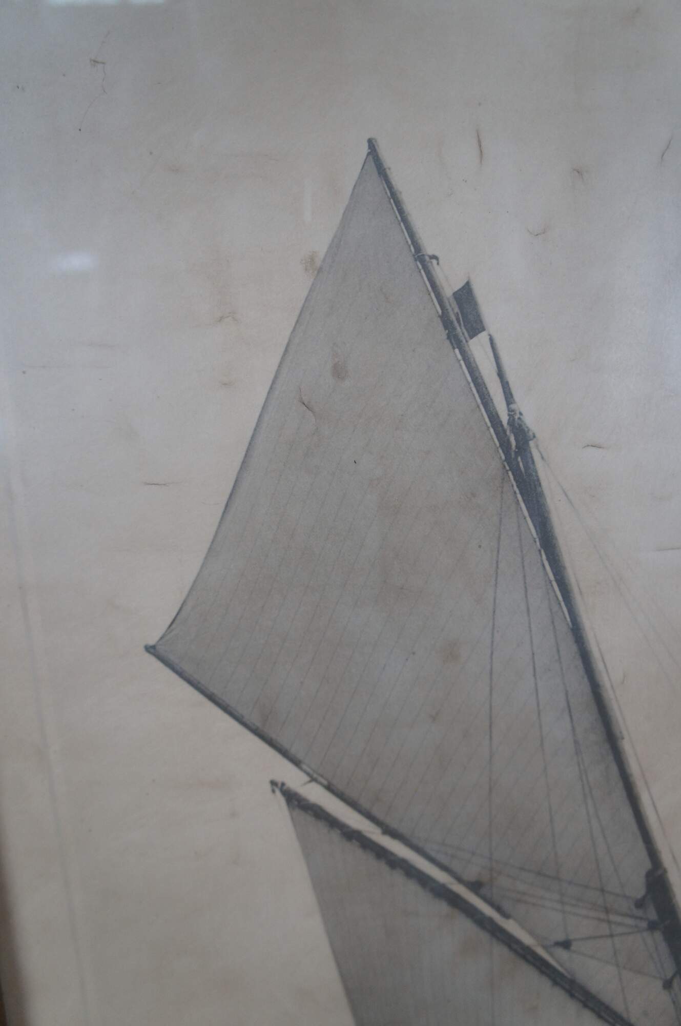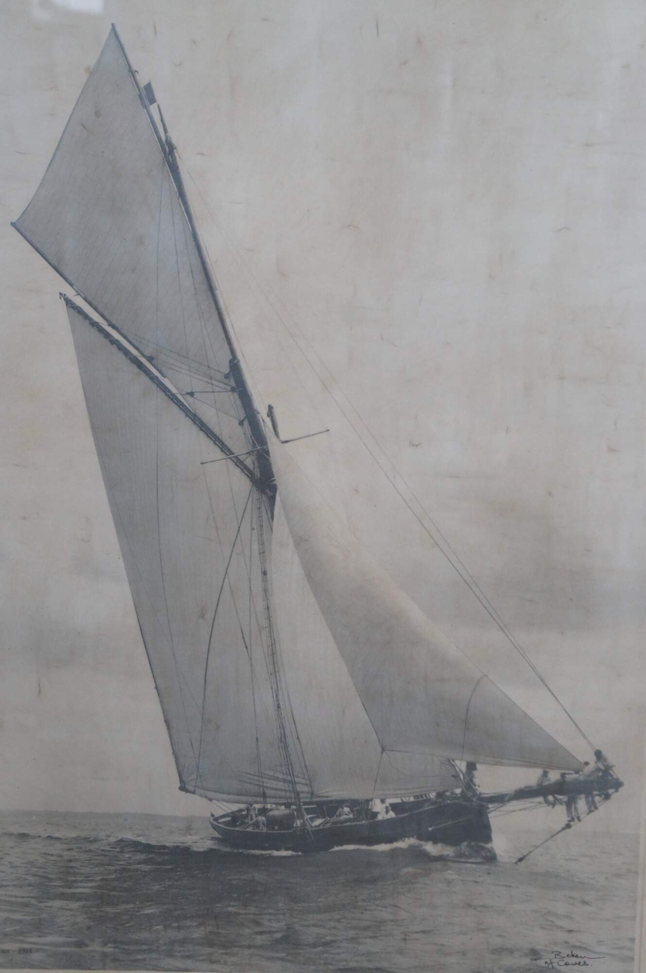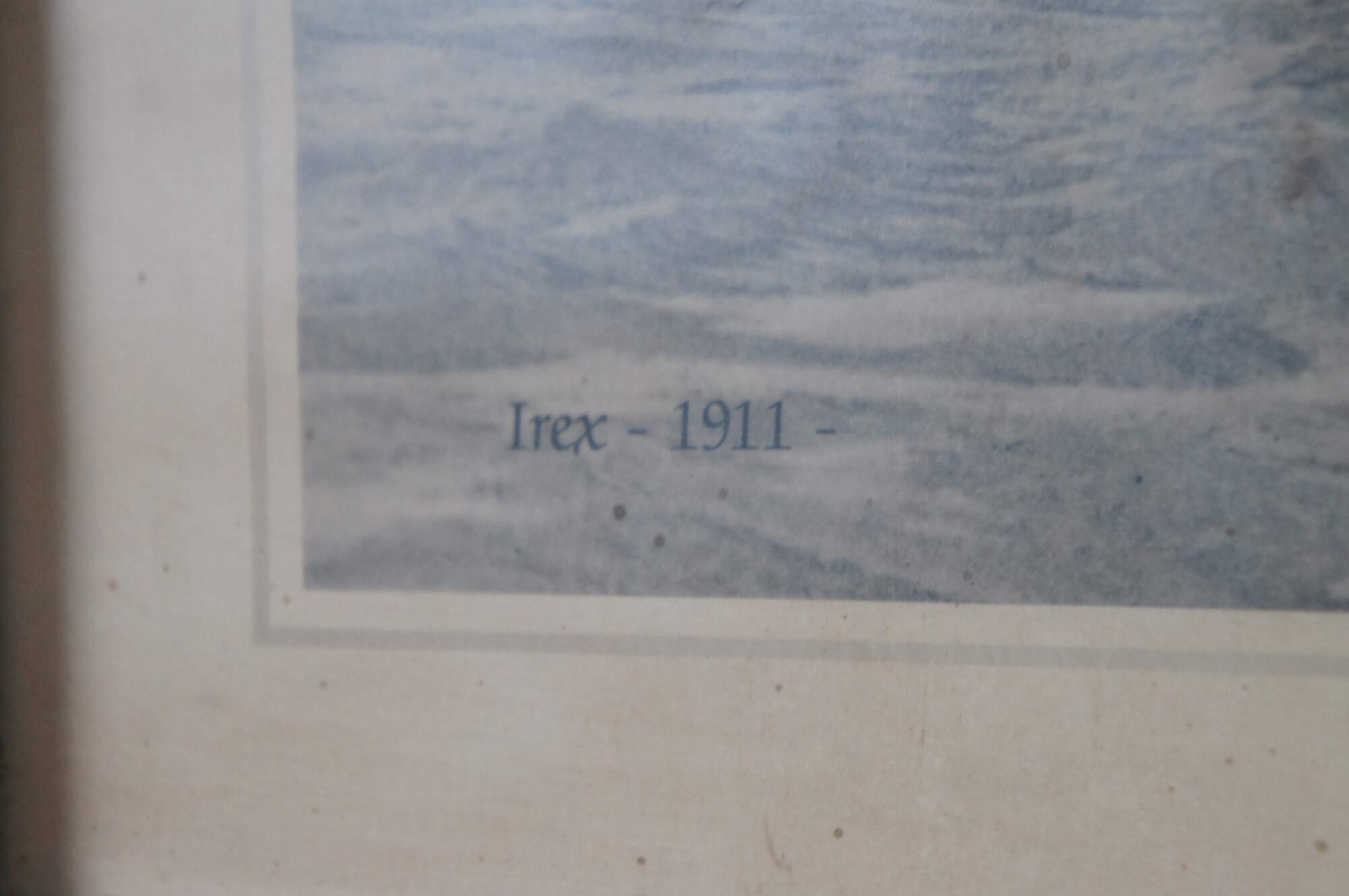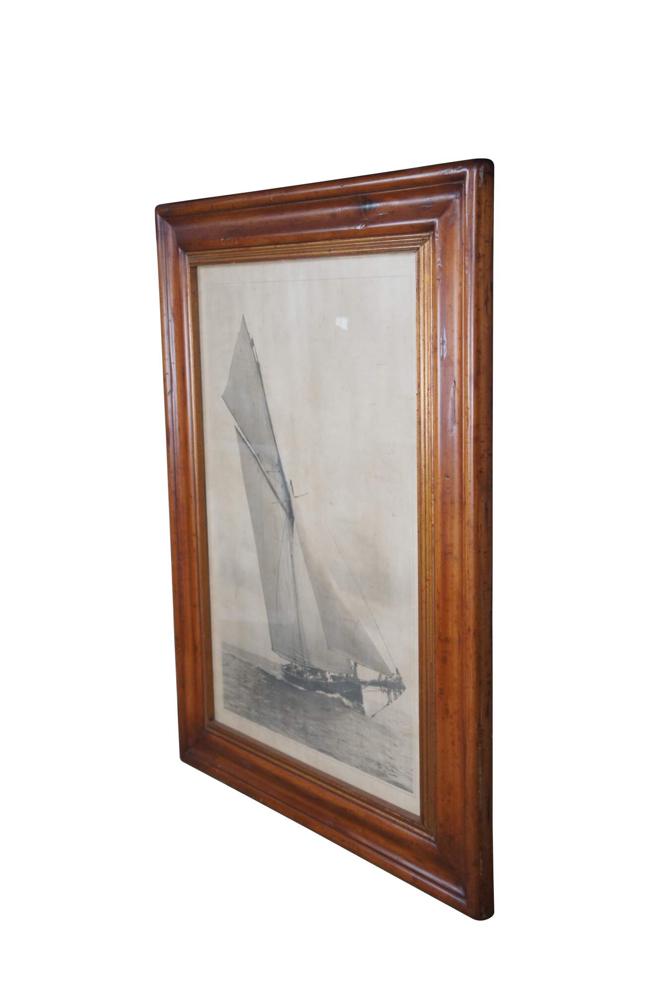 Large format print taken from The Art of Sailing by Beken of Cowes. Marked Irex 1911 and signed lower right. Features a portrait of a sailboat under glass, framed in pine.