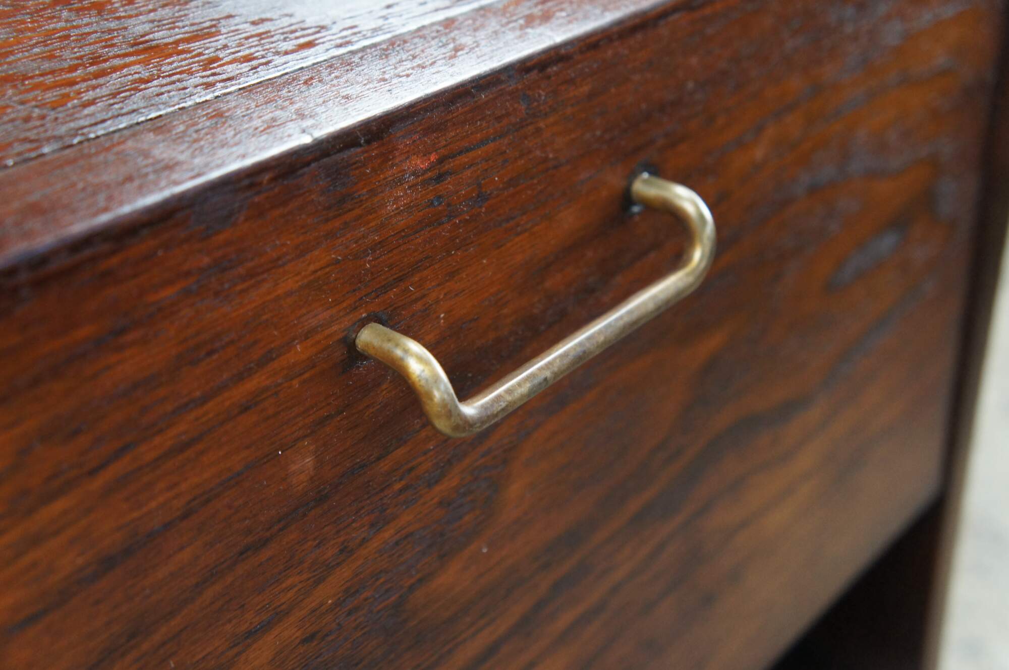 Fair condition, wear and distressing commensurate with age and use, finish loss, marking, ring, chip to lower right corner, missing shelf. 4000-18.