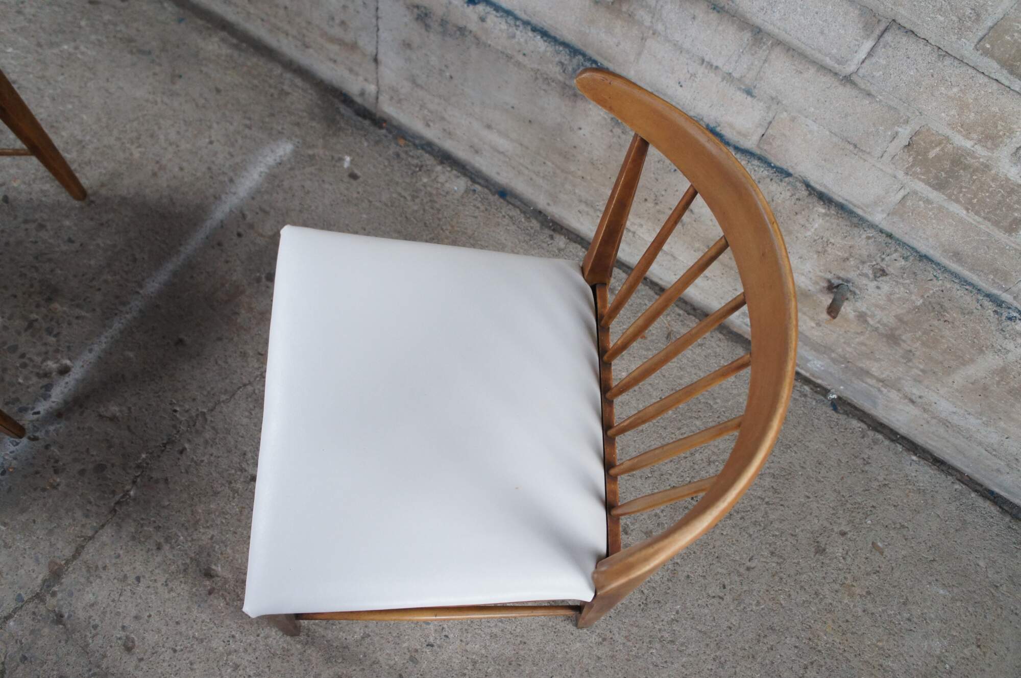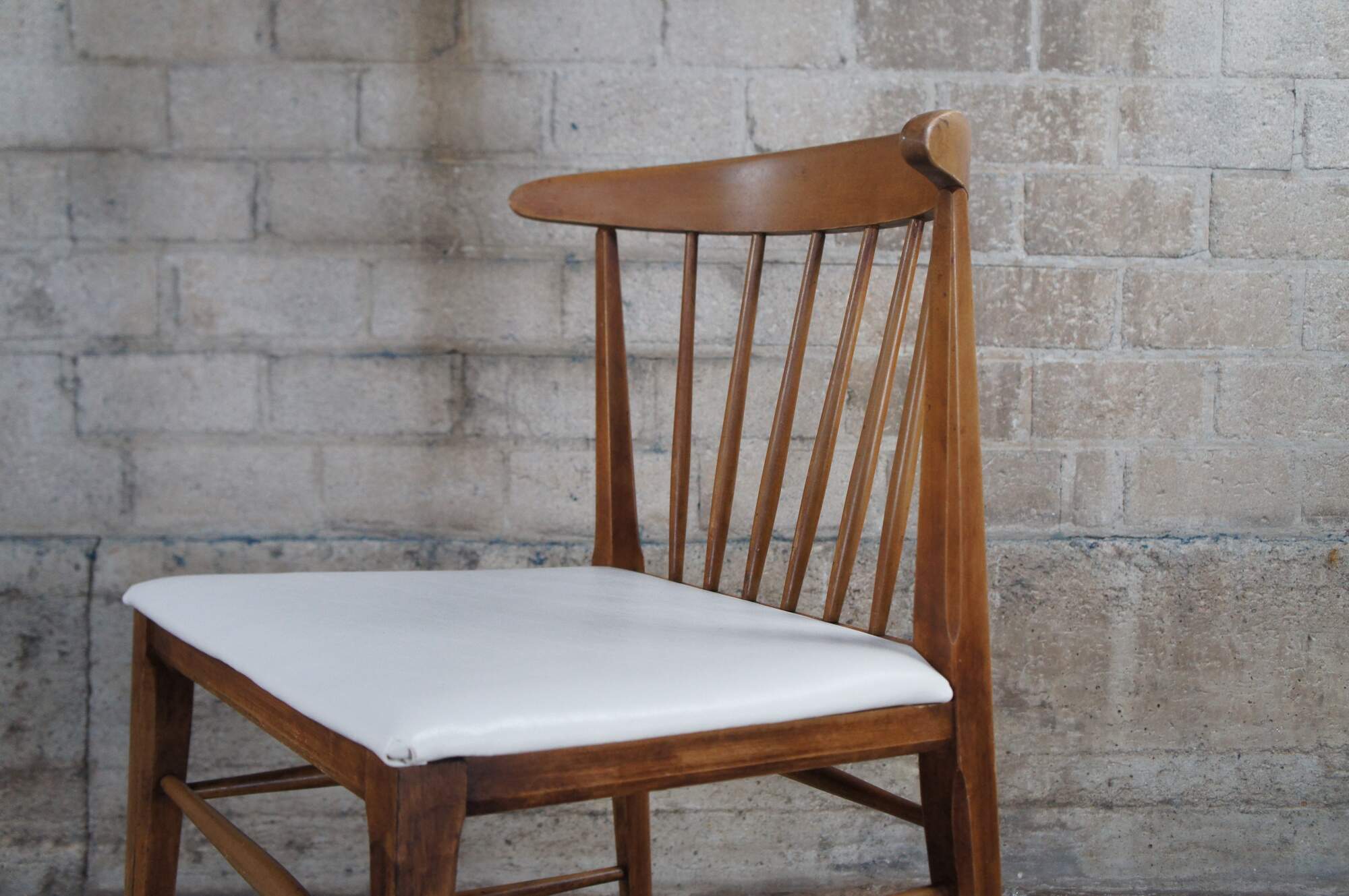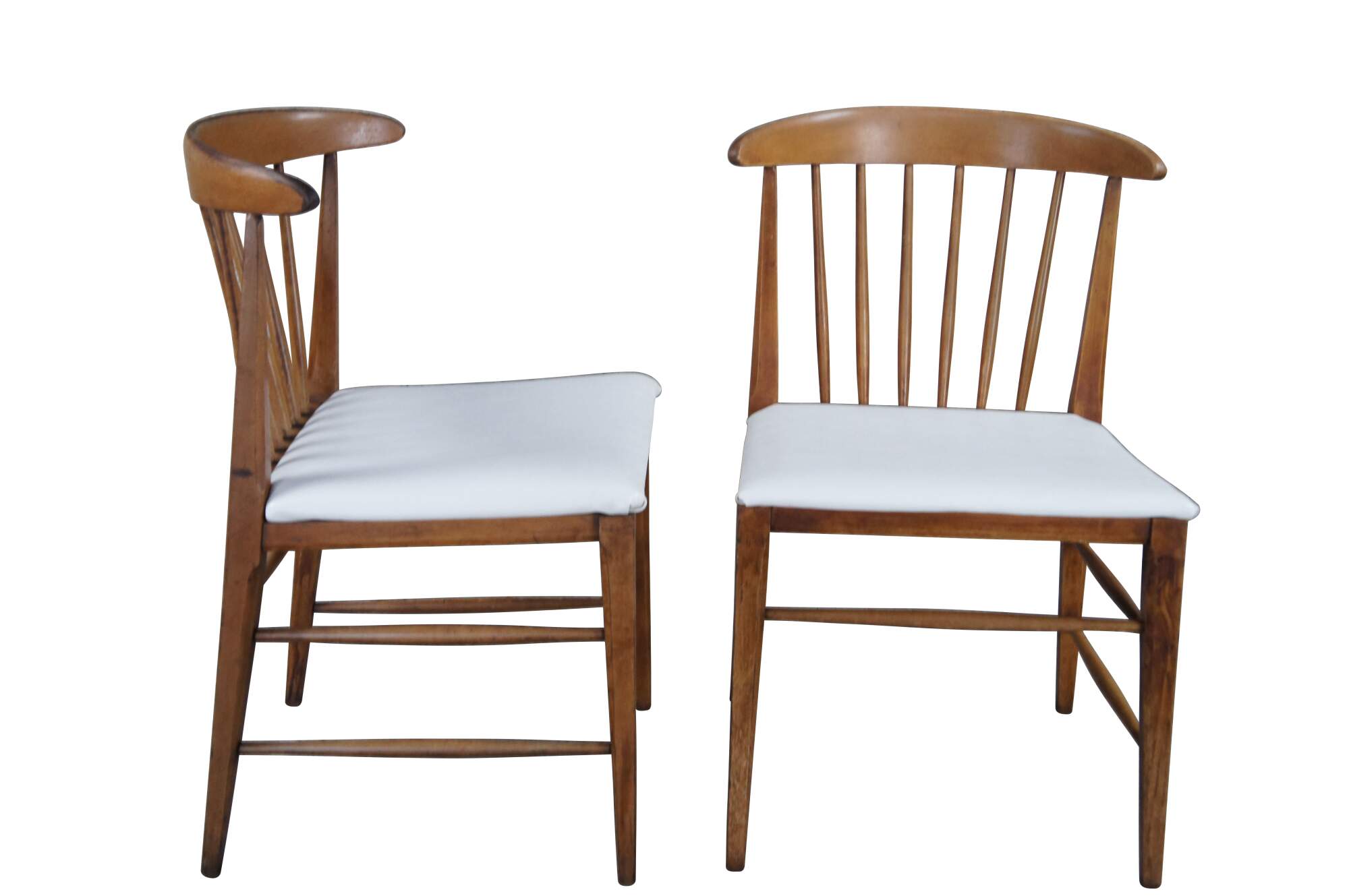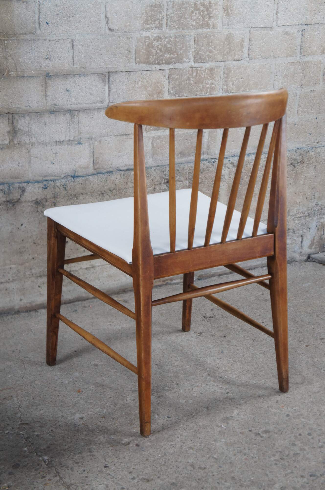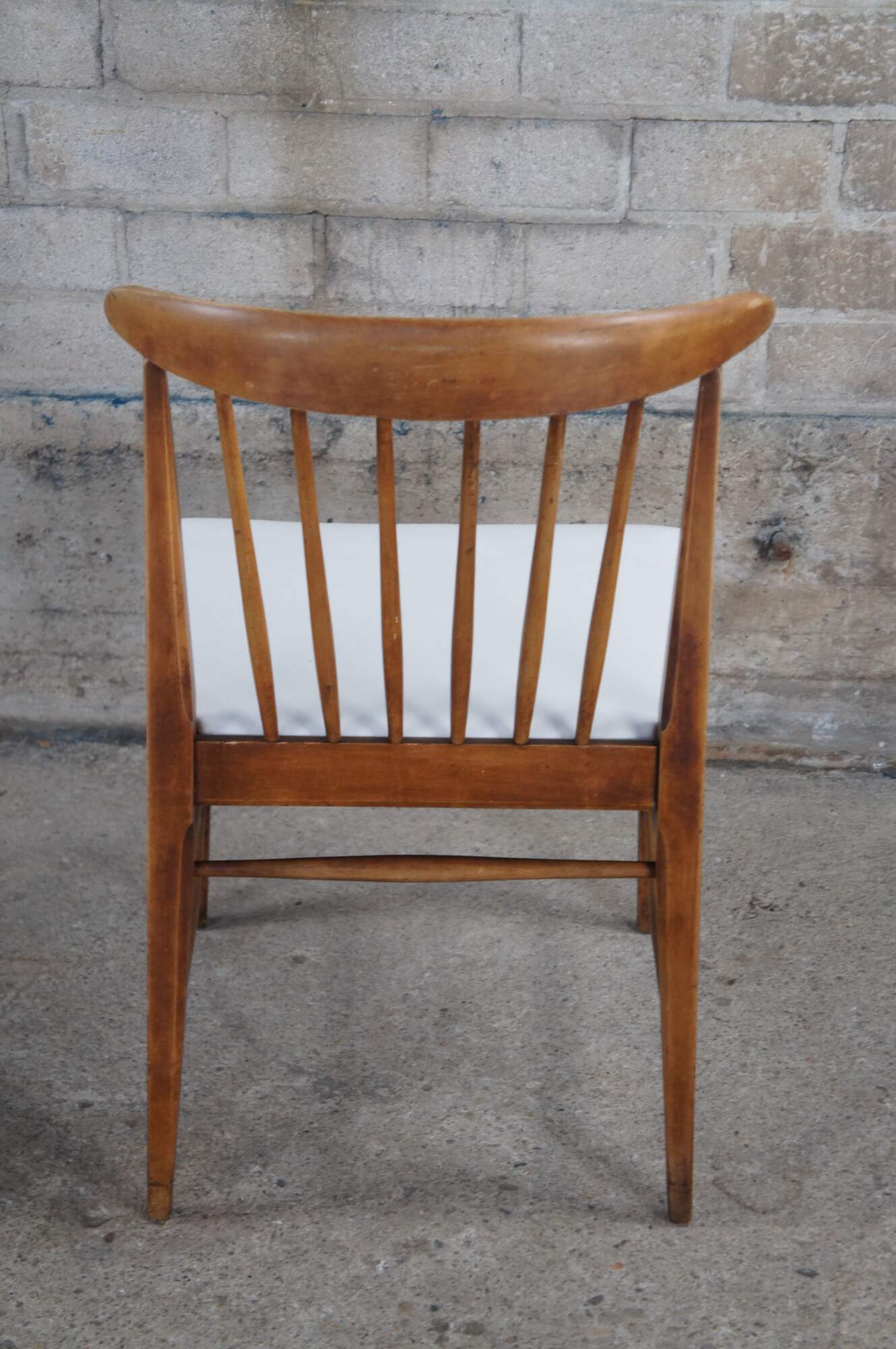 Set of four mid century modern dining chairs by Heywood Wakefield. Made of solid birch with dark topaz finish featuring wide form with rounded slat back and tapered legs.