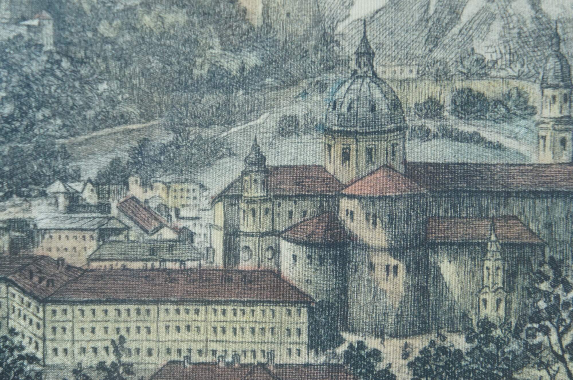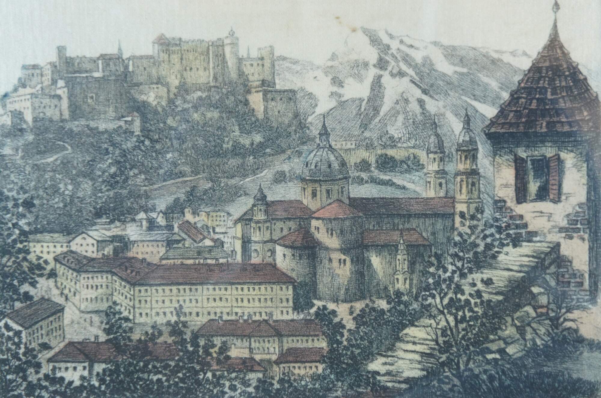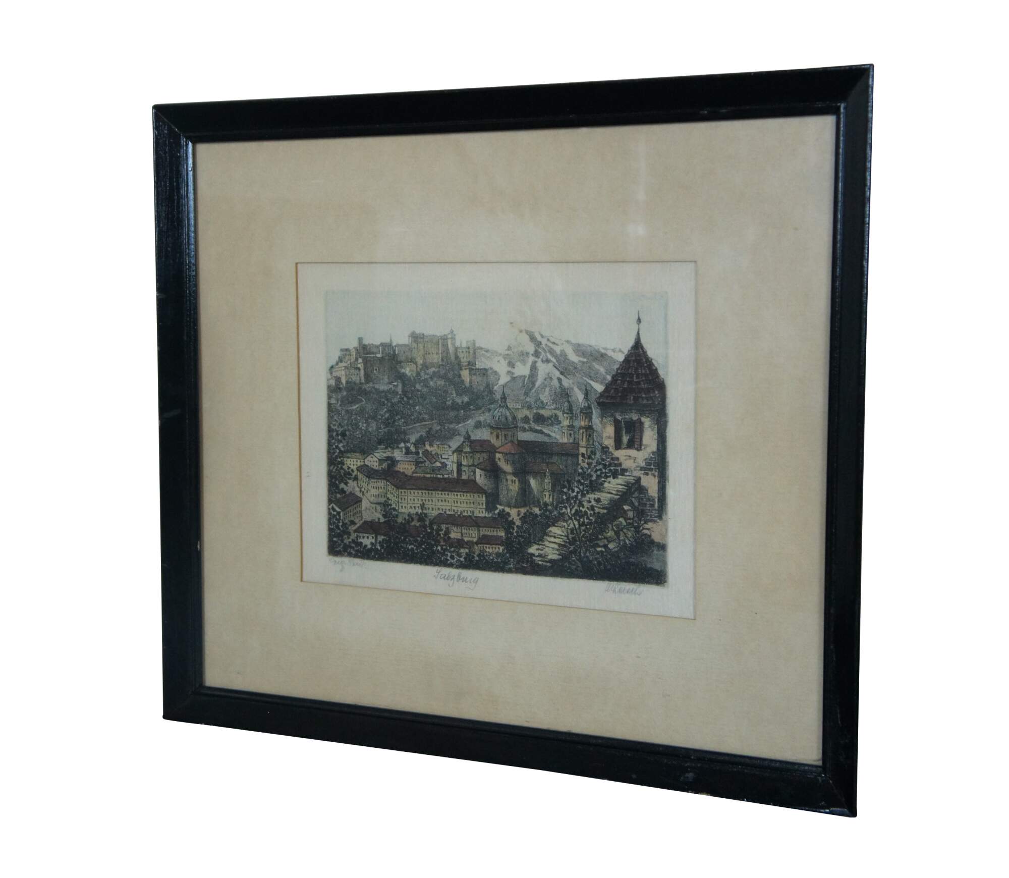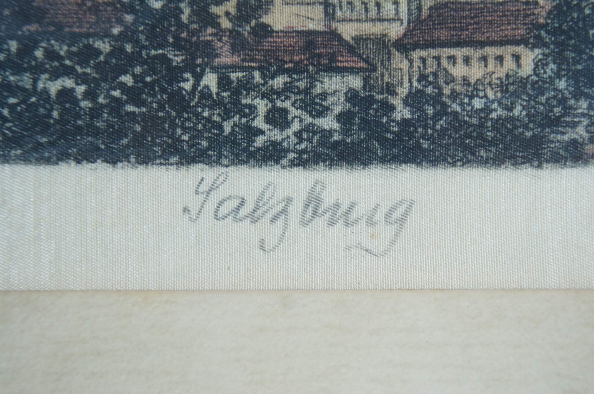 Mid to late 20th century colored etching on silk depicting a view of the city of Salzburg, Austria. Pencil marked "Orig. Rad. (Original Radierung) - Salzburg - H (W?) Leisch" along lower edge. Attributed to 20th century Austrian artist Hans Leisch. Black painted wood frame; beige mat.